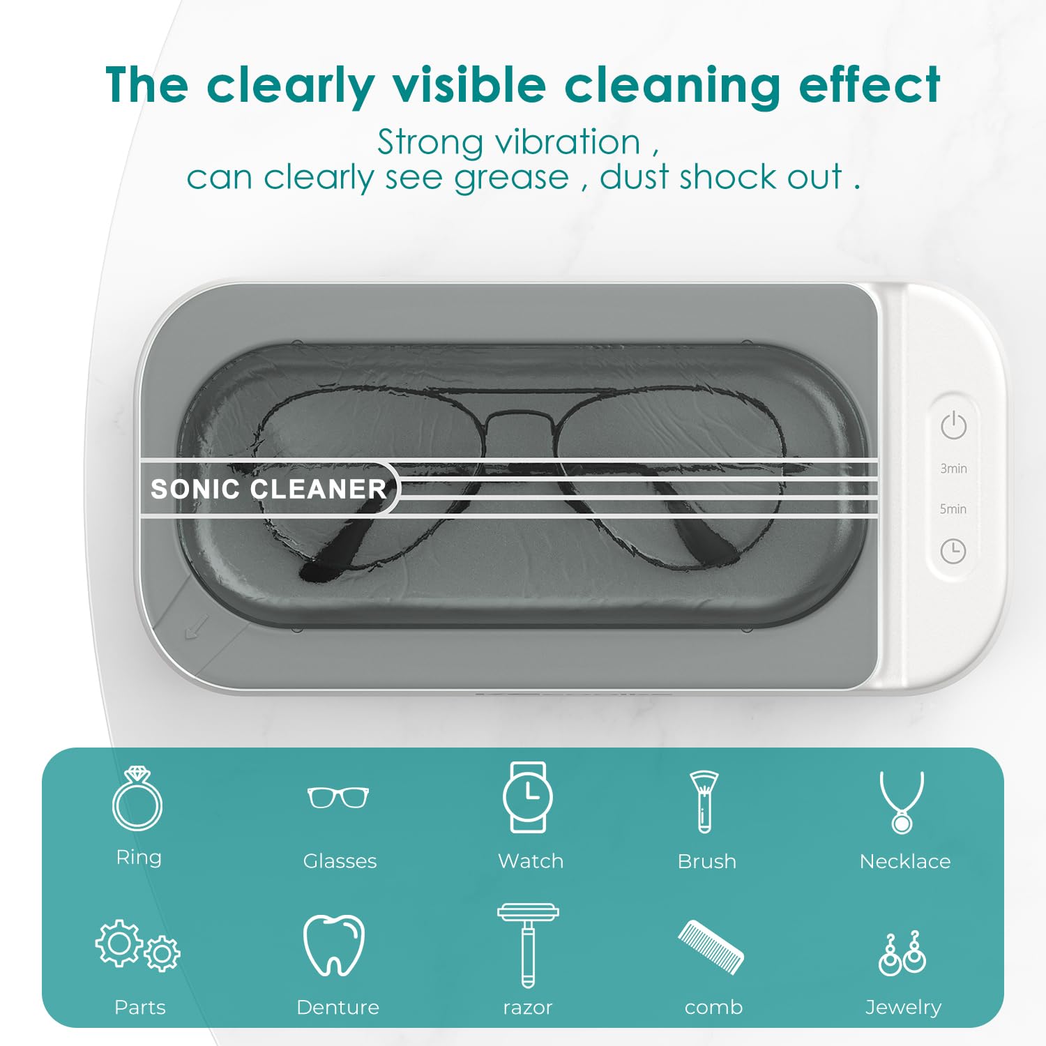 Das KECOOLKE Ultraschallreinigungsgeraet ist ein leistungsstarker Sonic Cleaner, der mit digitalem Timer ausgestattet ist und fuer die materialschonende Reinigung von Brillen, Ringen, Muenzen, Fingerringen und Geld entwickelt wurde. Die Ultraschalltechnologie sorgt fuer eine effektive Tiefenreinigung und entfernt Schmutz, Fett und Ablagerungen aus kleinsten Zwischenraeumen, ohne die Oberflaeche zu beschaedigen.