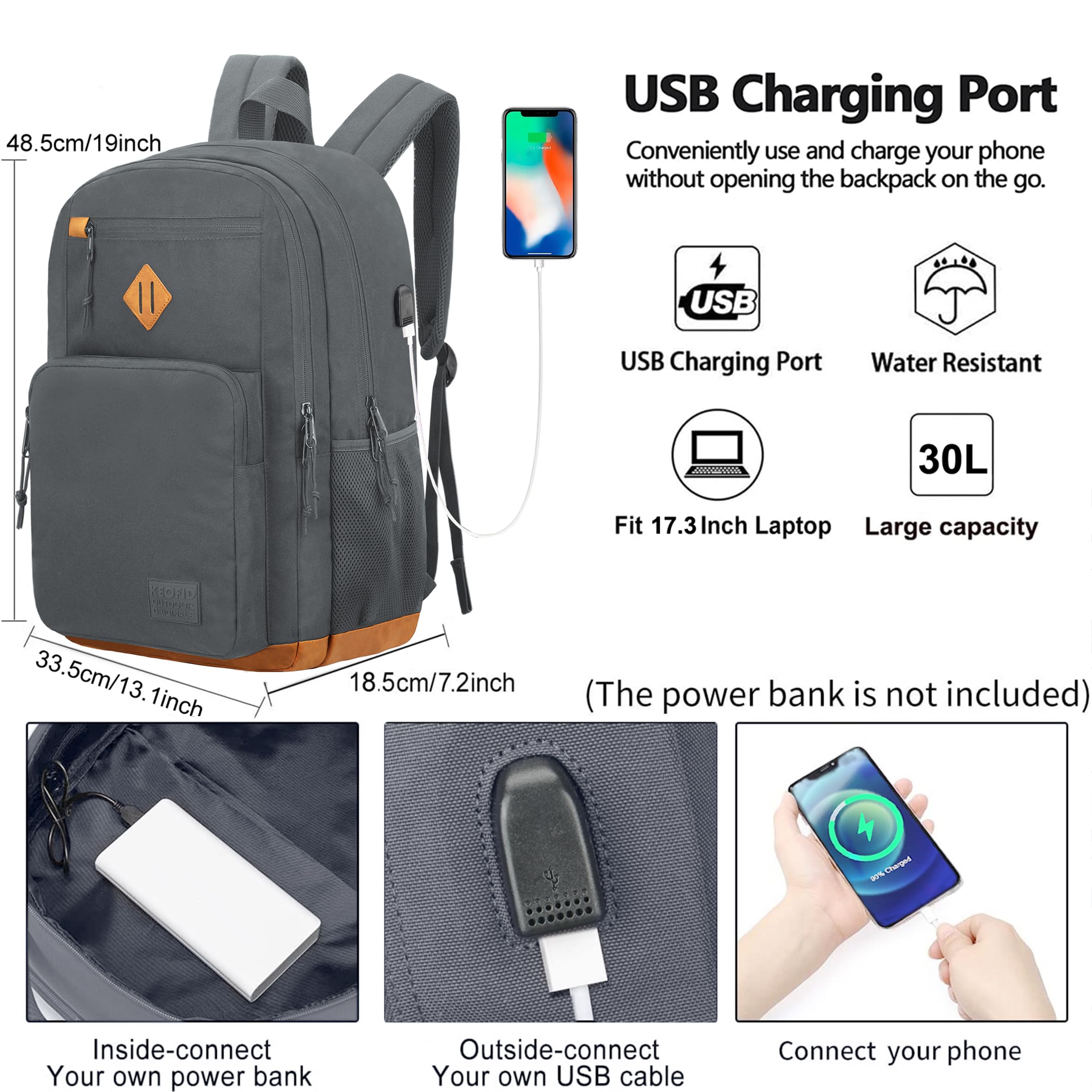 KEOFID Laptop Rucksack für Herren Damen, Grosser Schulrucksack für Jungen, Mädchen und Teenager, Anti-Diebstahl Computer Rucksack, 15,6 Zoll Laptop, Handgepäck Rucksack(Grau19inches)