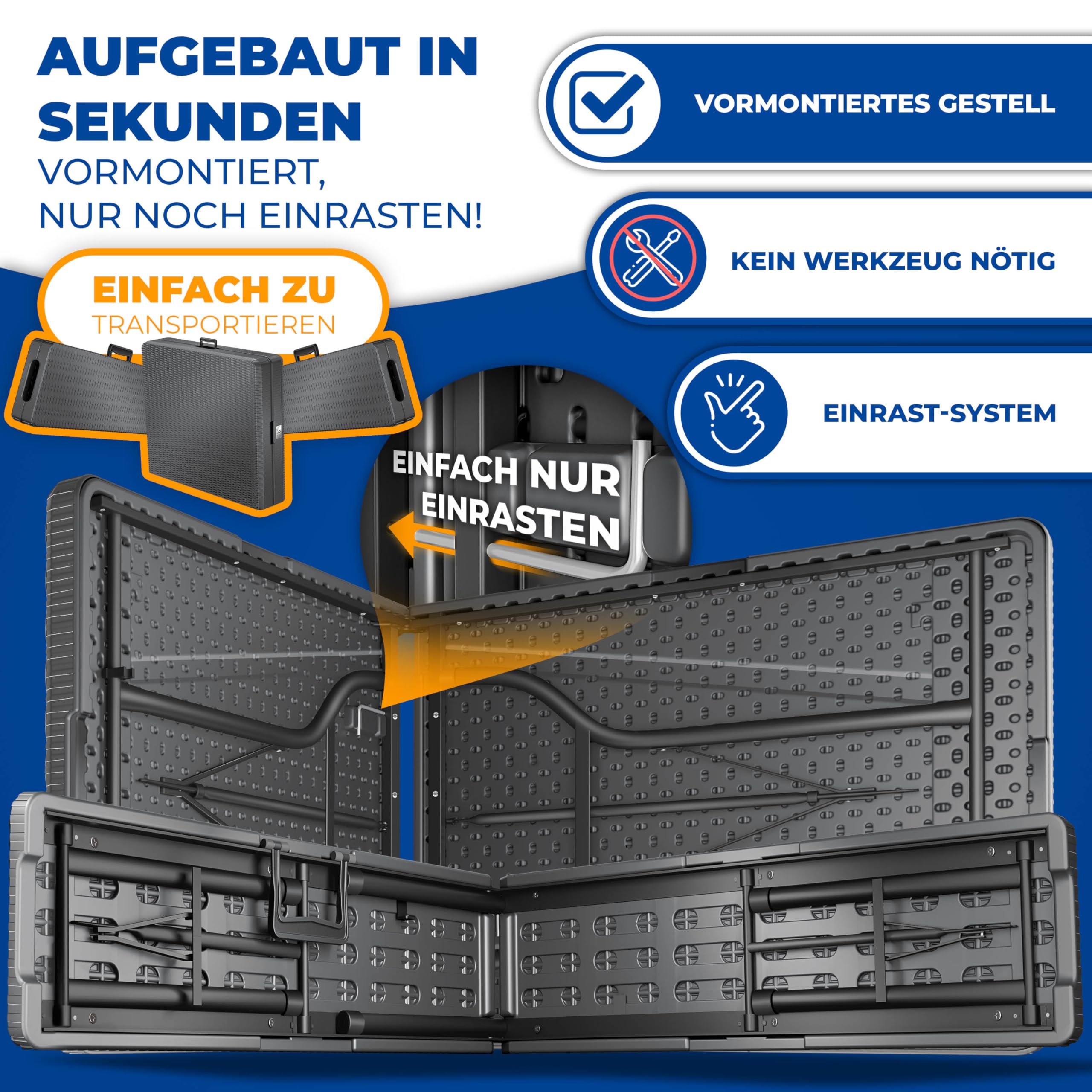 • Schnell zusammengeklappt und dank Tragegriff leicht zu transportieren