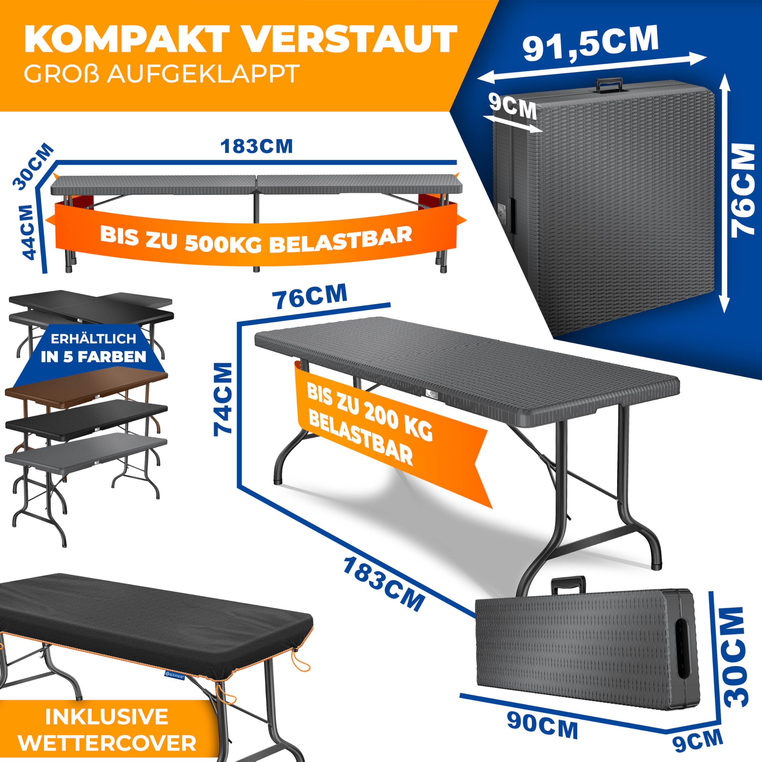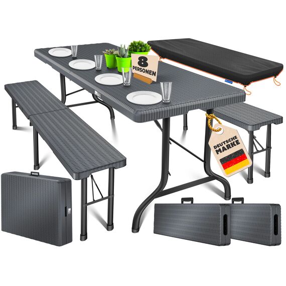 KESSER® Bierzeltgarnitur 3-teilig Set Tisch & 2X Bank| Buffettisch für drinnen & draussen Gartengarnitur klappbar 183x76x74cm Kunststoff Klapptisch Rattan-Look Gartentisch Inkl Abdeckung & Tragegriffe