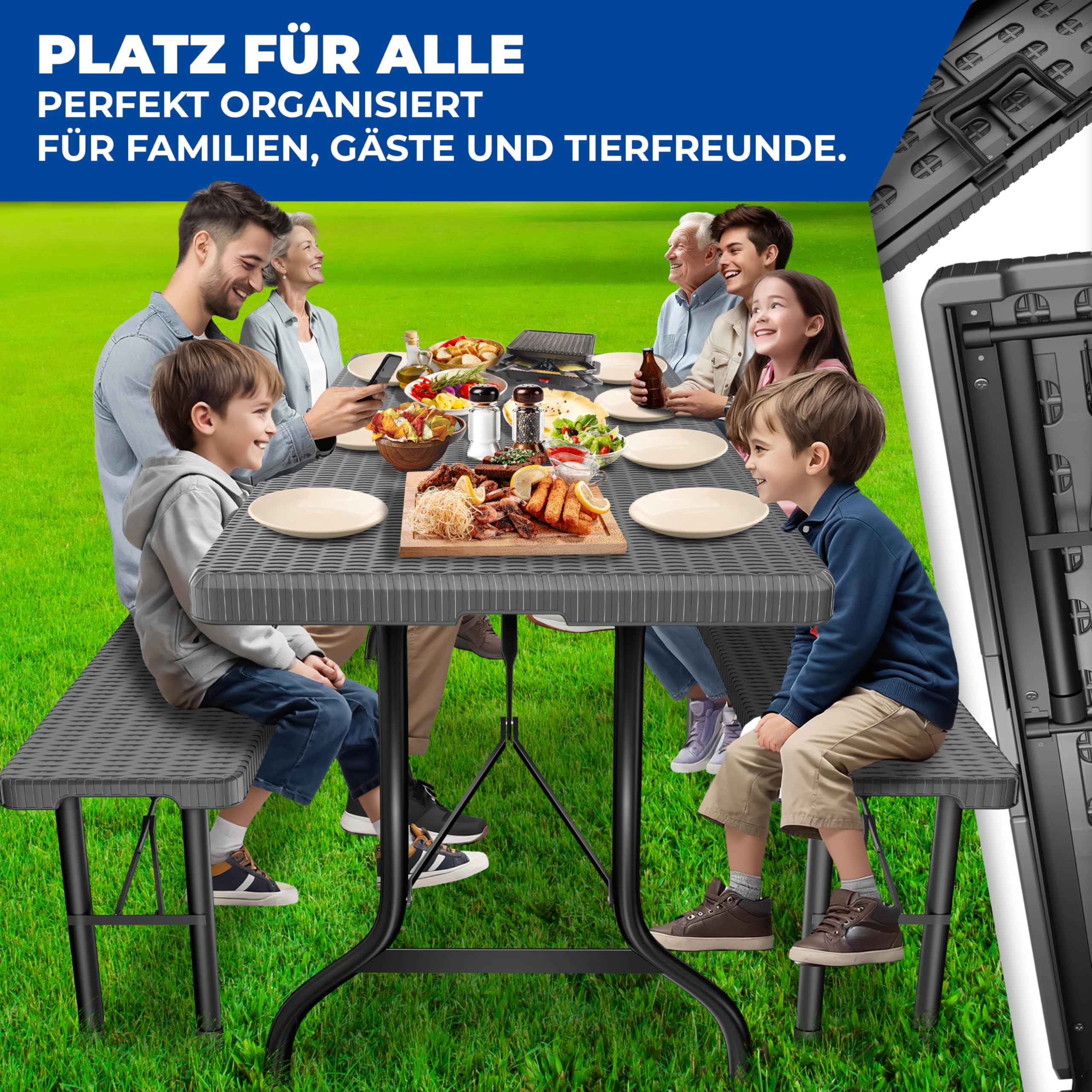 • Sitz- und Tischflächen aus Kunststoff: keine Gefahr durch Holzsplitter