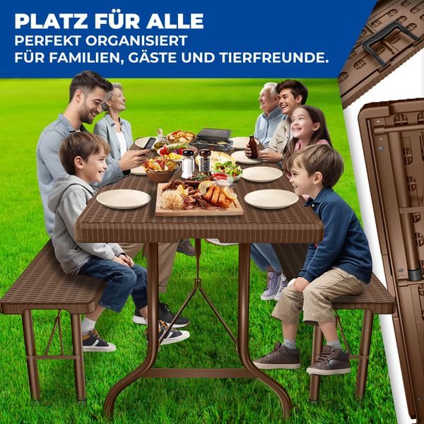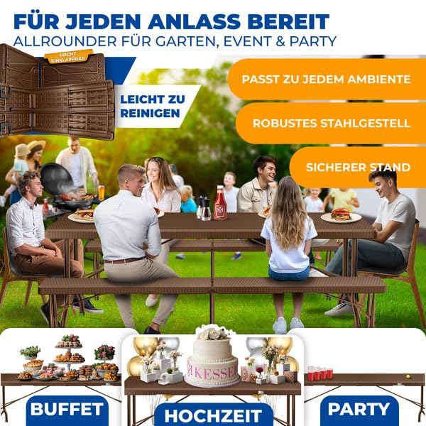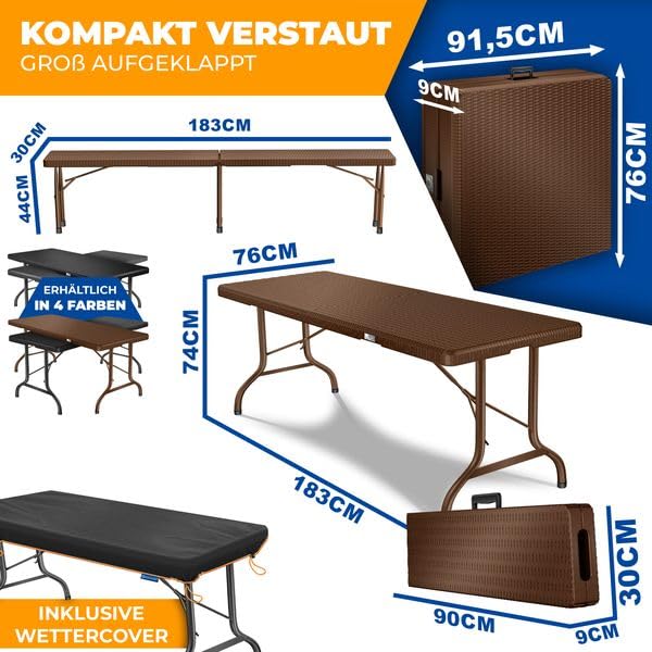 KESSER® Bierzeltgarnitur 3-teilig Set Tisch & 2x Bank | Buffettisch für drinnen & draussen Gartengarnitur klappbar 183x76x74cm Kunststoff Klapptisch Rattan-Look Gartentisch Inkl Abdeckung & Tragegriffe