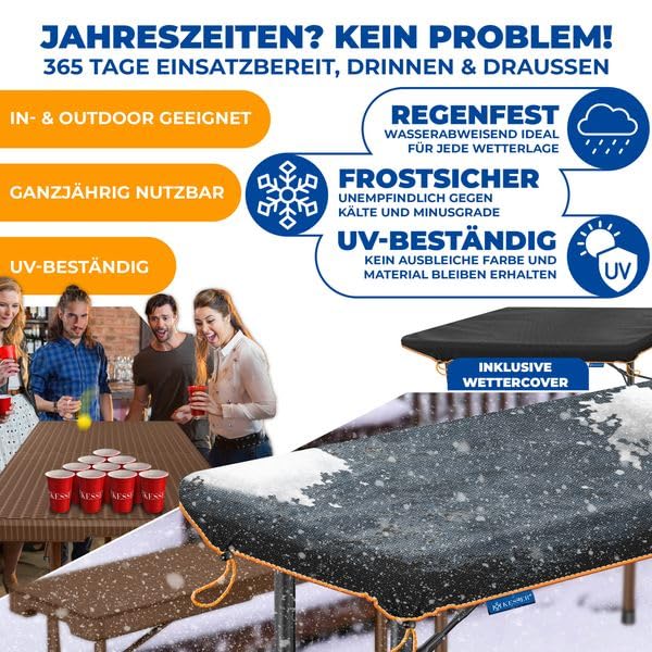 KESSER Bierzeltgarnitur - SET aus 2x Partybank / Bierbank und 1x Biertisch - klappbar robust stabil wetterfest ! Ob Geburtstag, Partys, Veranstaltungen oder Grillabend – diese robuste Bierzeltgarnitur von KESSER lädt auf jeden Fall zum gemütlichen Zusammensitzen ein. Produktvorteile im Überblick • für drinnen und draussen: witterungsfest dank Stahlrohrgestell und HDPE-Kunststoff• praktische Rasten für festen Halt: Zusammenklappen ohne Haken und Ösen• klappbar & platzsparend zu verstauen• mit praktischem Tragegriff• Sitz- und Tischflächen aus Kunststoff: keine Gefahr durch Holzsplitter• seitliche Handgriffe zum einfachen Aufklappen• Standfüsse mit Bodenschoner• Sitzhöhe: ca. 44 cm• Tischhöhe: ca. 73 cm Abmessungen: • Masse Tisch aufgebaut 183x76x74 cm• Masse Tisch zusammengeklappt: ca. 90 x 75 x 9 cm• Tisch wiegt ca. 12,7 kg• Masse je Bank aufgebaut: ca. 44 x 180 x 25 cm• Masse je Bank zusammengeklappt: ca. 90 x 25 x 9 cm• Jede Bank wiegt ca. 9,3 kg• Gesamtgewicht des Sets: ca.31 kg• Maximalbelastung des Tisches beträgt 120 kg• Maximalbelastung jeder Bank beträgt 500 kg• Schnell zusammengeklappt und dank Tragegriff leicht zu transportieren• Mit wenigen Handgriffen zusammengebaut Lieferumfang: • 2x Bierbank• 1x Bierzelttisch •1x Schutzcover