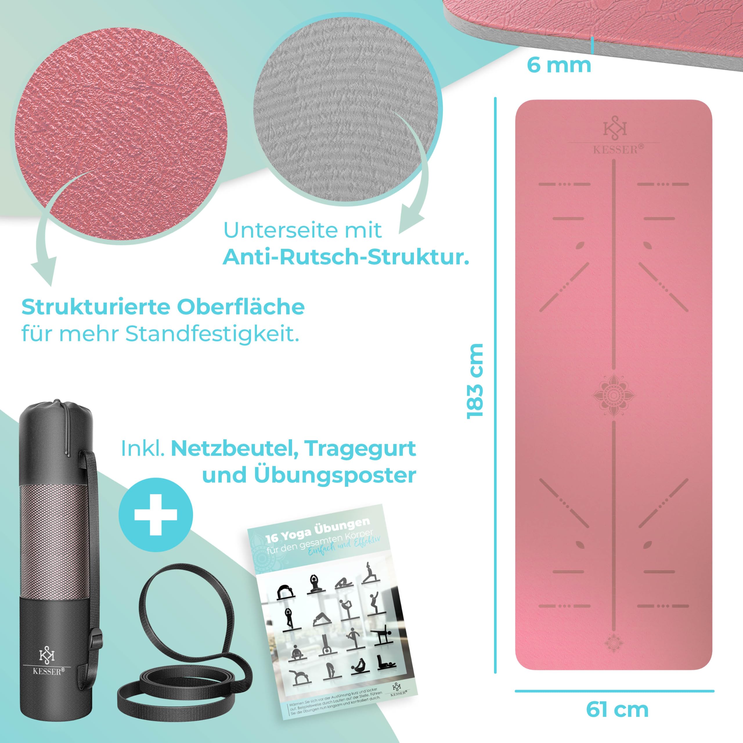 Unsere KESSER Gymnastikmatte Yoga Matte Perfekt für Fitness, Yoga, Rehabilitation und Krafttraining-Trainieren wie die Profis. Mit Liniensystem zur Körperausrichtung. inkl. Übungsposter mit Verschiedene Übungen.Die KESSER Gymnastikmatte besteht aus Thermoplastische Elastomere, sogenannte TPE. Diese Material ist hochwertig, hypoallergen, hautfreundlich und pflegeleicht. Liniensystem zur Körperausrichtung Die Ausrichtungslinien helfen Ihnen, Ihre Hände und Füsse in die richtige Position zu fokussieren und zu bringen, und die richtige Körperhaltung in verschiedenen Asanas (Yogapositionen) beizubehalten. Perfekt für den Gebrauch zu Hause oder im Studio. Körperausrichtung ist besonders hilfreich, wenn Sie Yoga alleine ohne Yogatrainer praktizieren.Ideale Grösse für tägliche Übung 183 cm lang 61 cm breit, 6mm dicht. Bietet Komfort für Menschen aller Formen und Grössen, für Profis und Anfänger. Bietet die bequemste Erfahrung für alle Yogis.Mit Tragegurt Die Reise-Yogamatte lässt sich leicht zusammenrollen, wiegt nur 1,2 kg und wird mit einem Yogagurt Tragetasche geliefert. So können Sie jederzeit und überall Yoga machenUmweltfreundliches Material - Bequem: Yoga-Matten bestehen aus TPE-Material, das rutschfest, geruchsneutral und hervorragend gepolstert ist. Kein PVC, kein Latex und andere giftige Chemikalien, verbessert die Stärke der Reissfestigkeit, recycelbar.Lieferumfang:• 1 x TPE Yogamatte • 1 X Tragegurt • inkl. Übungsposter