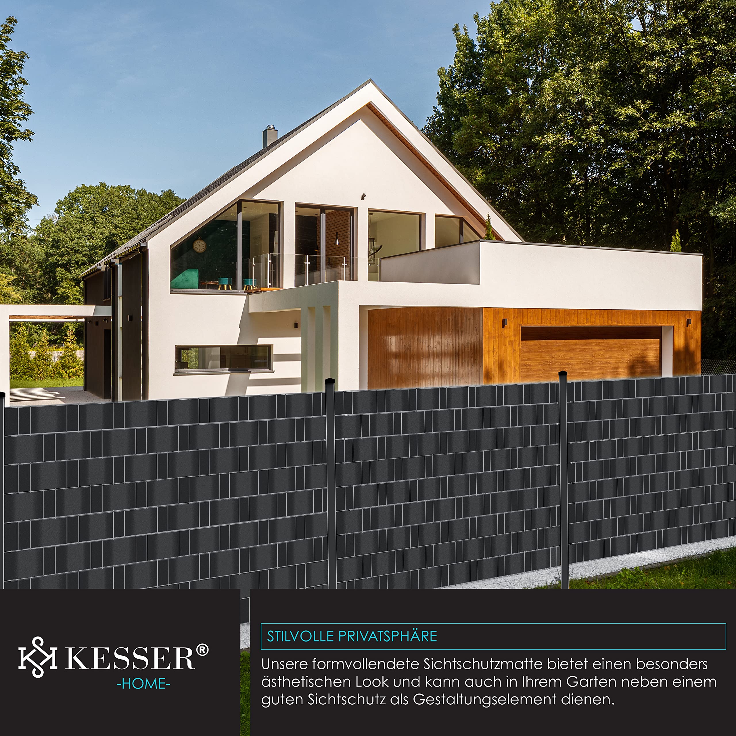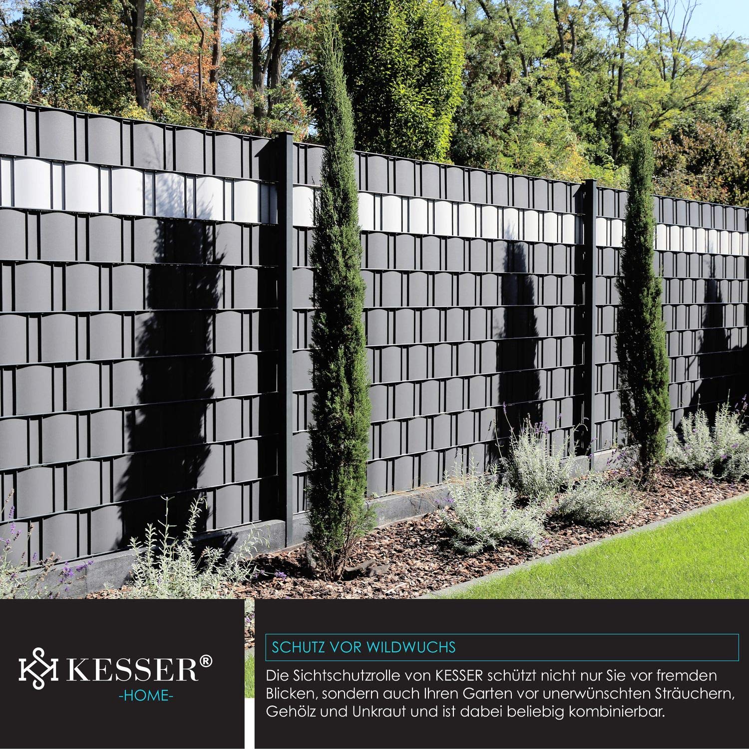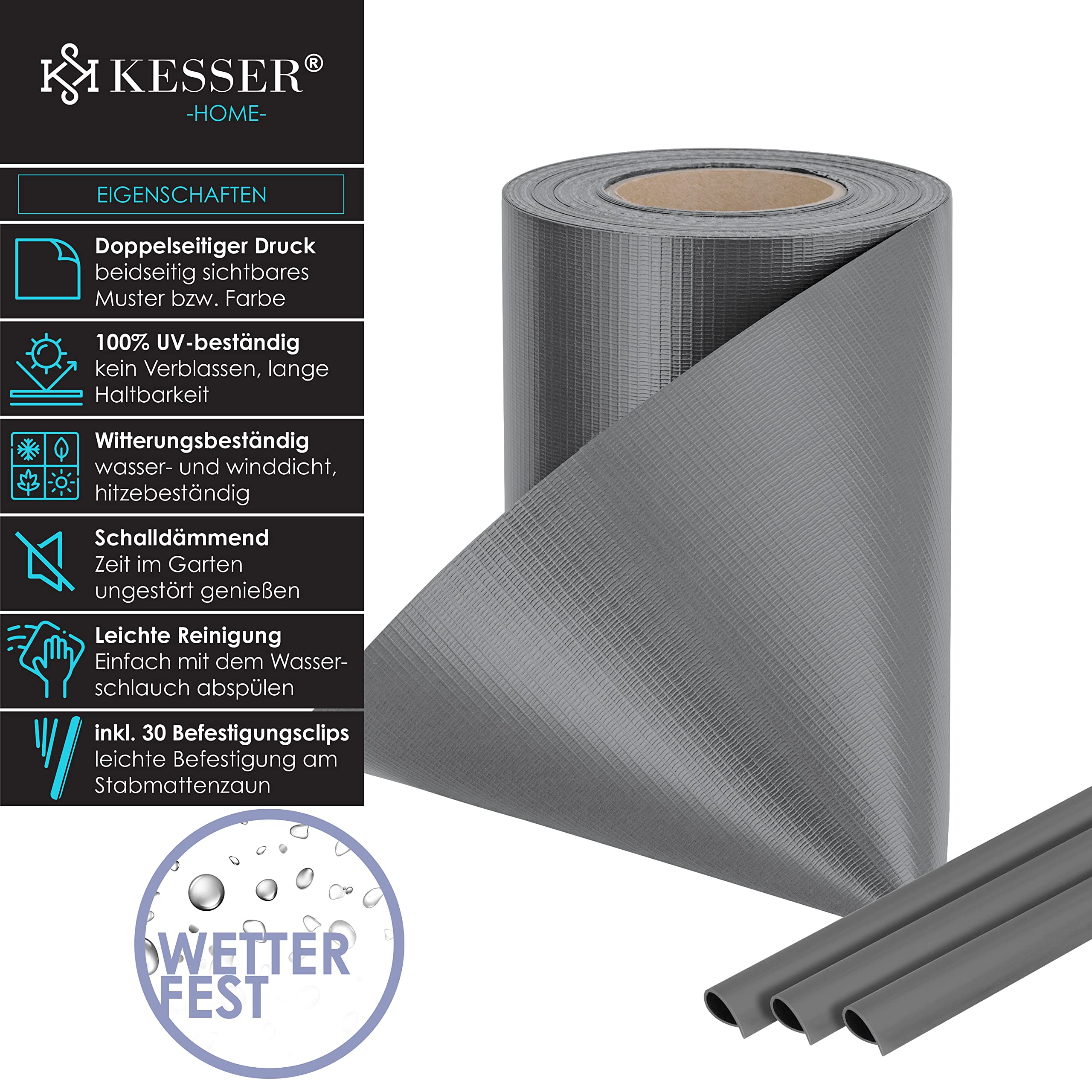 KESSER Sichtschutzrolle aus hochwertigem, schmutzabweisendem und wetterbeständigem PVC, geeignet für Temperaturen von -30°C bis + 70°C für Garten, Haus, Hof und Pool inkl. 30 BefestigungsclipsSchützen Sie sich und die Privatsphäre Ihrer Familie - die undurchsichtigen und modernen Sichtschutzstreifen schützen vor neugierigen Blicken und schaffen eine entspannte Atmosphäre...egal ob auf der Terrasse, dem Balkon oder in Ihrem Garten.Ohne Werkzeug: Die Zaunfolie lässt sich spielend leicht in einen Einzel- oder Doppelstabmattenzaun einflechten. An beiden Enden erfolgt die Sicherung und Befestigung über einen der jeweils 30 mitgelieferten Befestigungsclips. Produkt-Highlights:• Langlebige Qualität