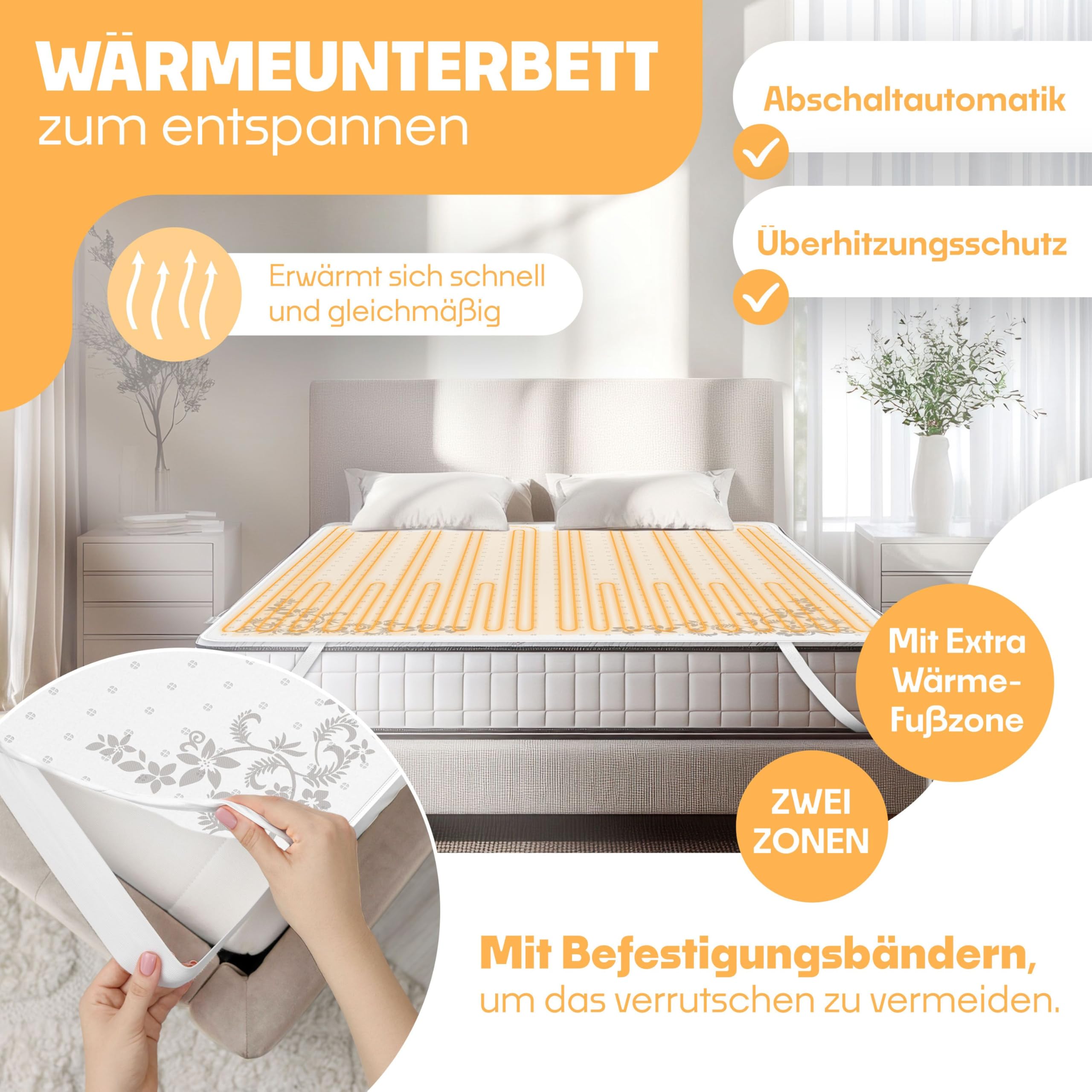 • ⏱️ ????????????????????????????????????????????????????????????????????: Nach 180 Minuten schaltet sich die Heizdecke automatisch ab, für maximale Sicherheit im Schlaf. Integrierte Befestigungsbänder sorgen für festen Sitz auf der Matratze, damit die Wärme immer optimal am Körper anliegt.