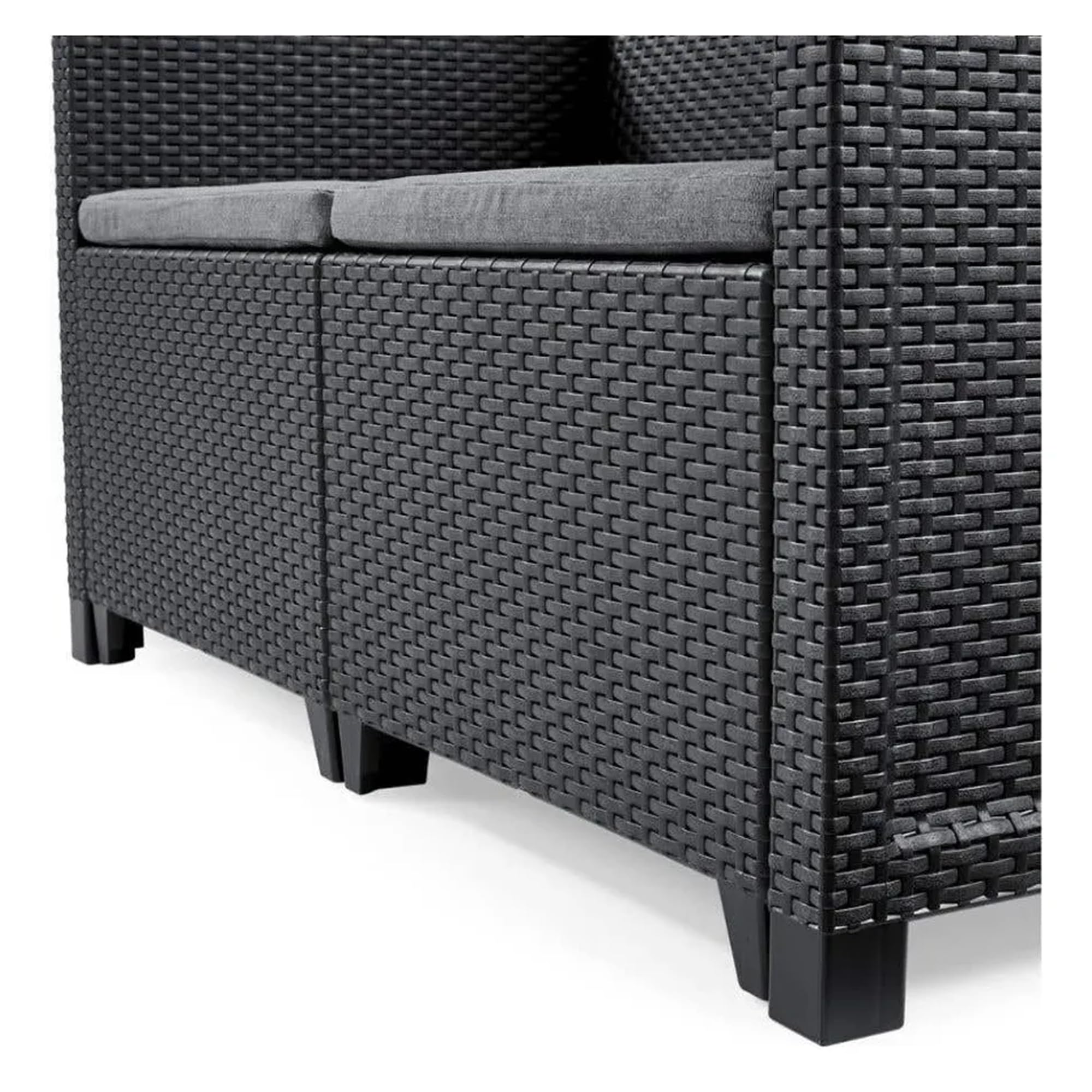 Set bestehend aus Tisch, Sofa und 2 Einzelsessel mit Polycotton-Kissen, mit besserer Aussenfestigkeit; modernes Design, flaches Rattan, sowohl auf der Armlehne als auch auf der Tischoberseite; wetterfest; hergestellt aus 50% regrind; einfache Montage, click go.