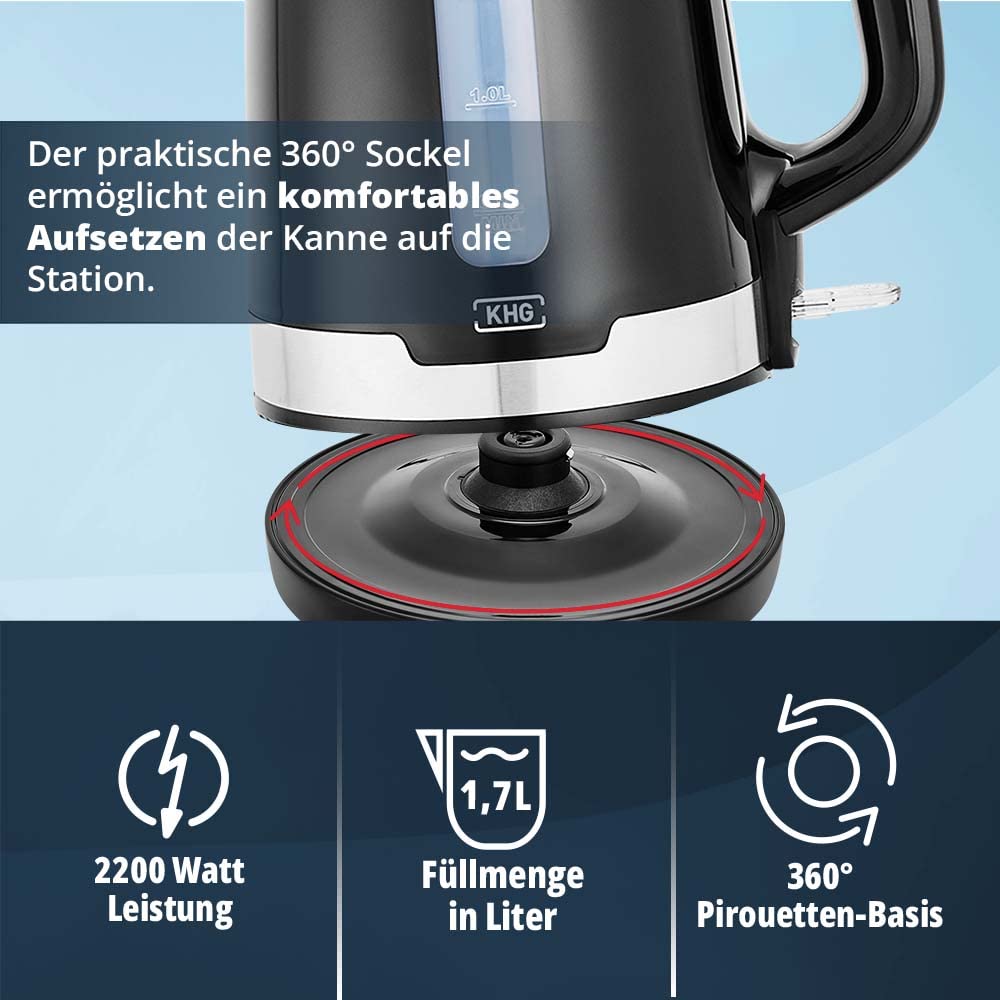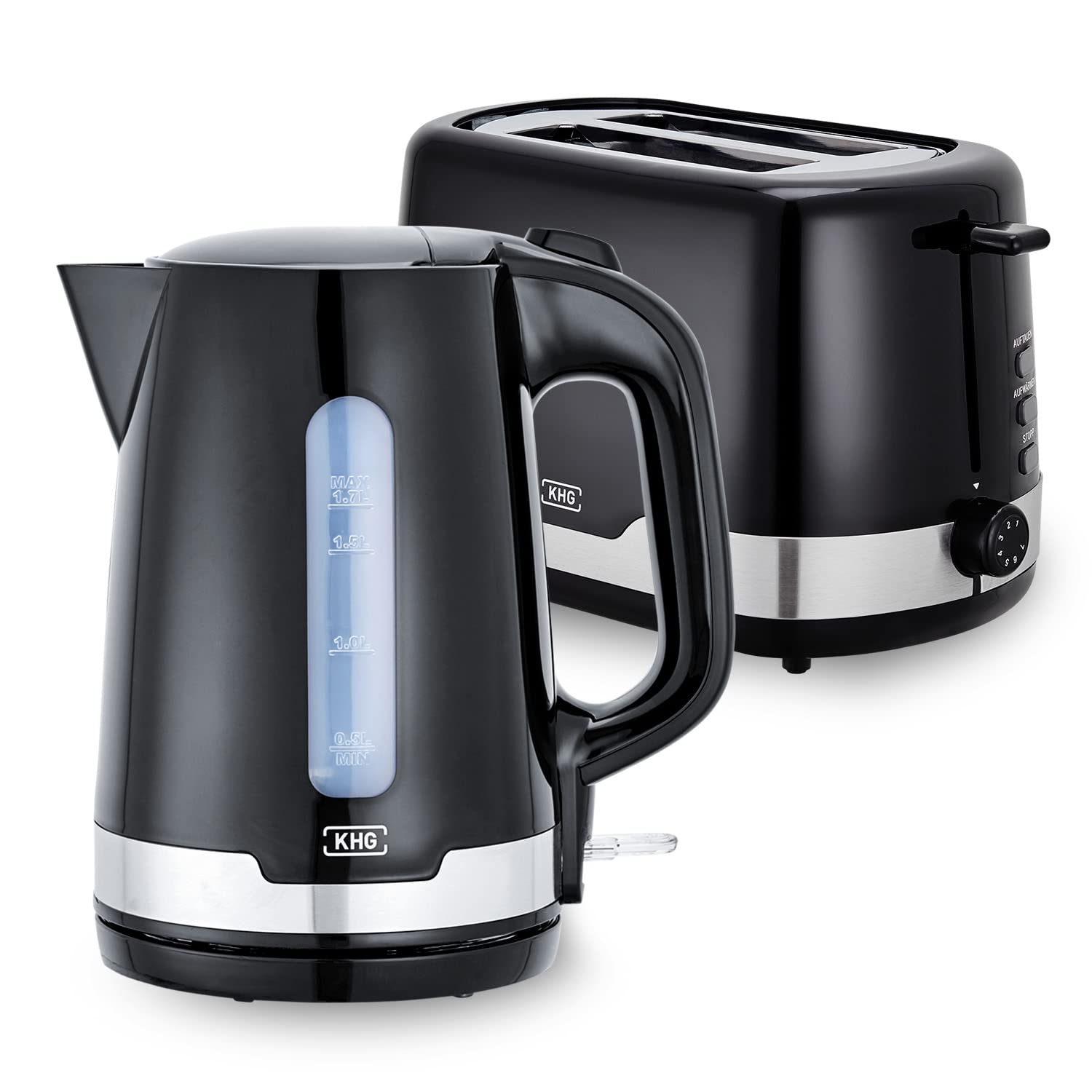 KHG Wasserkocher und Toaster Set 2-teilig | 2.200 & 850 Watt | Frühstücksset mit Kapazität 1,7 Liter & 2 Scheiben Toast | Küchenset mit Kalkfilter & Krümmelauffang - SCHWARZ