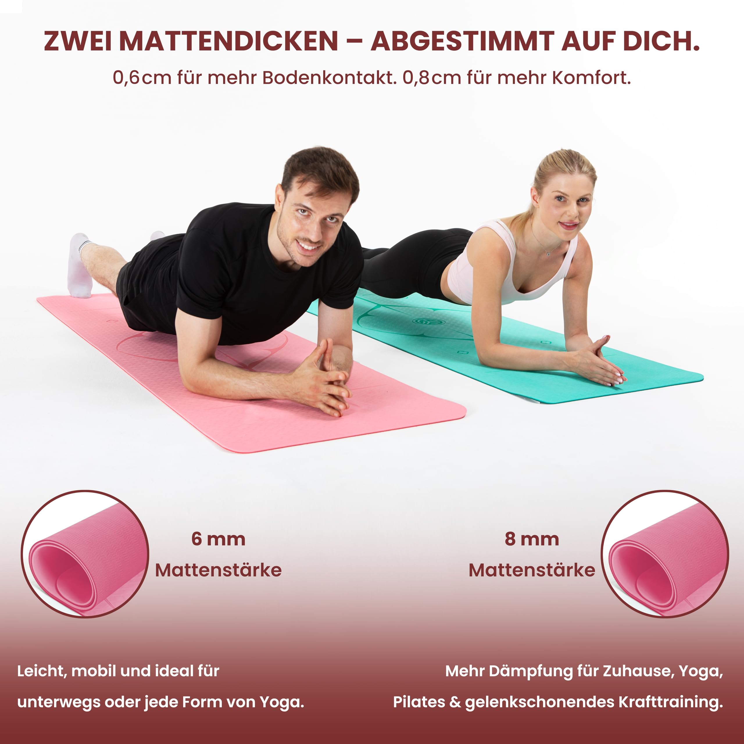 • ✅ ZWEI STÄRKEN, DIE ZU DIR PASSEN: Wähle deine Sport Matte so, wie sie zu dir passt: 0,6 cm für mehr Bodennähe und Mobilität oder 0,8 cm für extra Komfort und Dämpfung. Beide Varianten bieten dir genau die Pilates Matte, die du für dein individuelles Training brauchst.