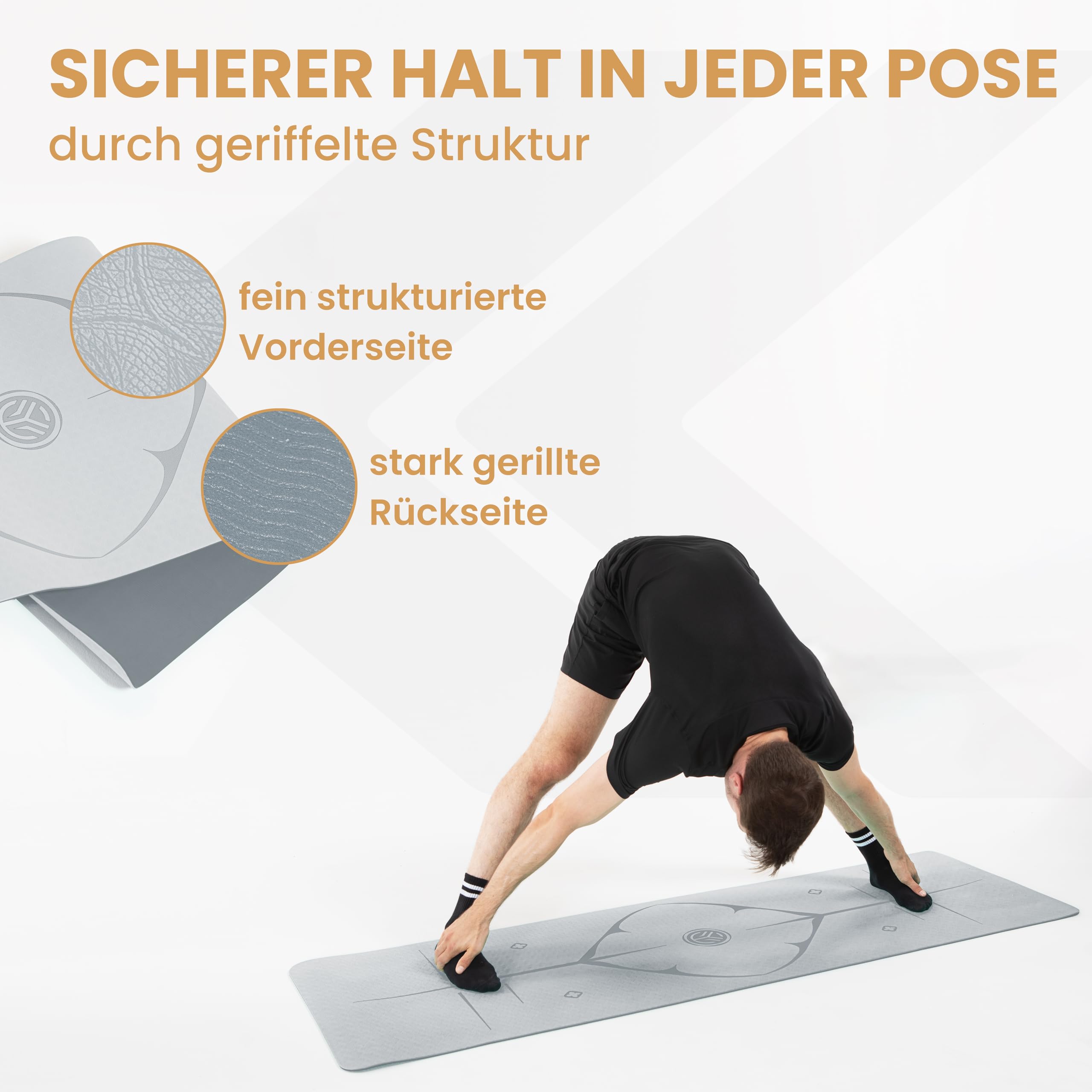 • ✅ RUTSCHFEST BEI JEDER BEWEGUNG: Ob kraftvolle Flows oder ruhige Asanas – deine Yogamatte bietet dir festen Stand auf jedem Untergrund. Die griffige Struktur auf Vorder- und Rückseite sorgt für sicheren Halt – ganz ohne Verrutschen. Auf diese rutschfeste Yoga Matte kannst du dich verlassen.
