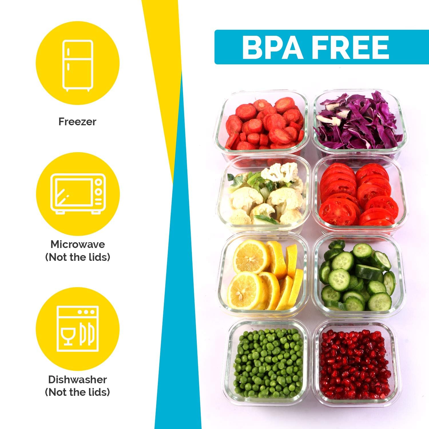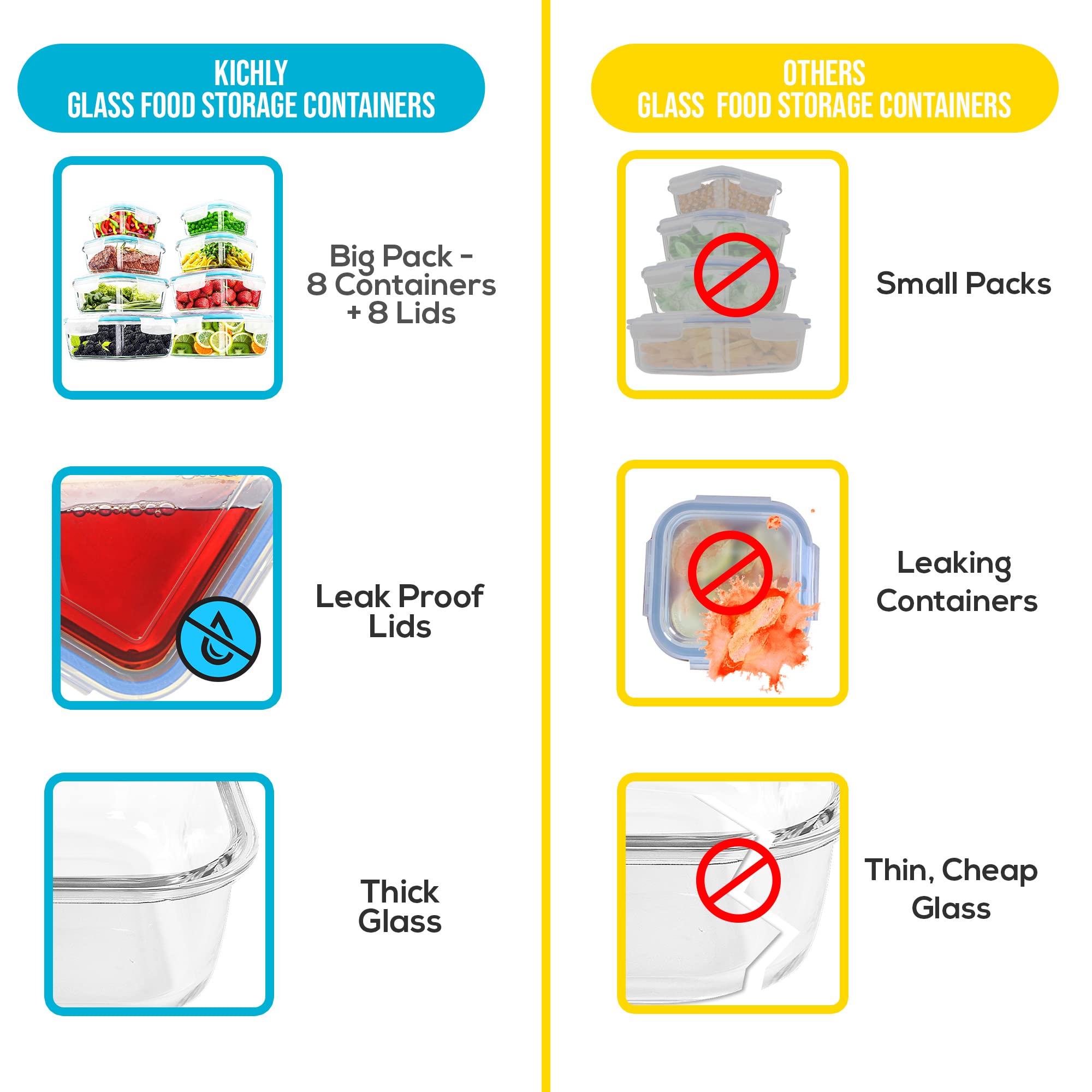 KICHLY Glasbehälter Mit Deckel - meal prep boxen glas - Transparente Erstklassig geeignet für mikrowelle - Luftdicht, Auslaufsicher, BPA-frei - 16er (8 Behälter und 8 Deckel)