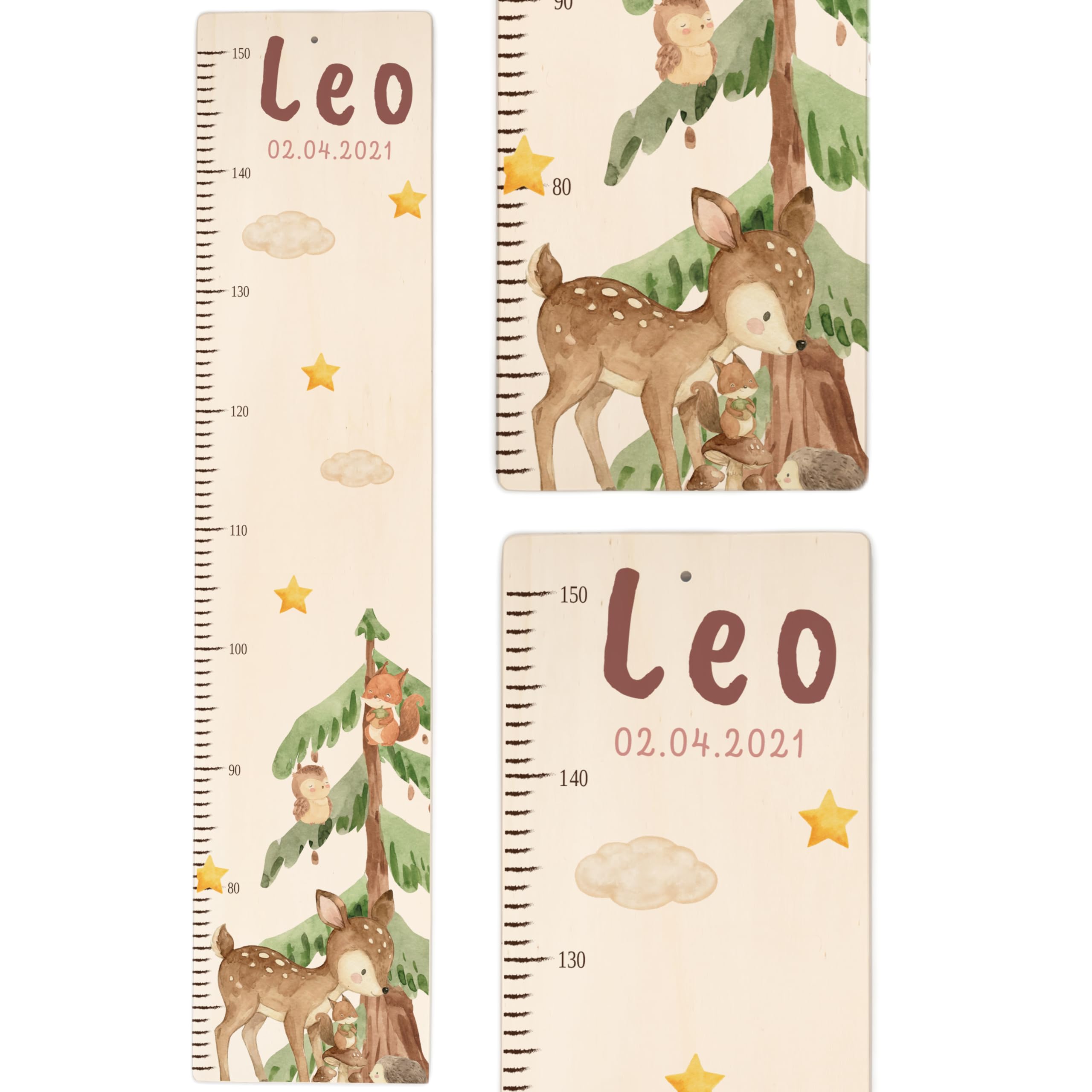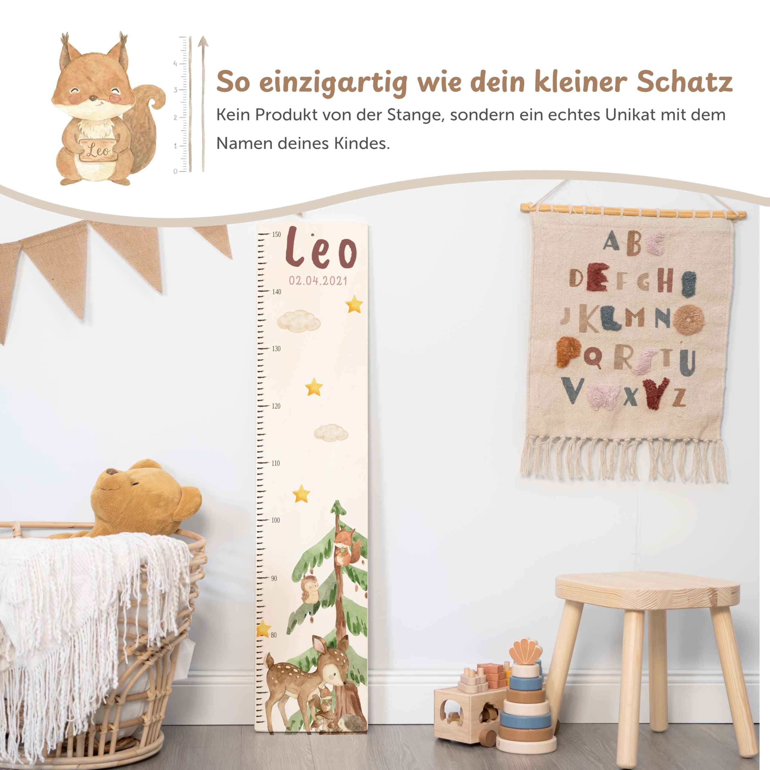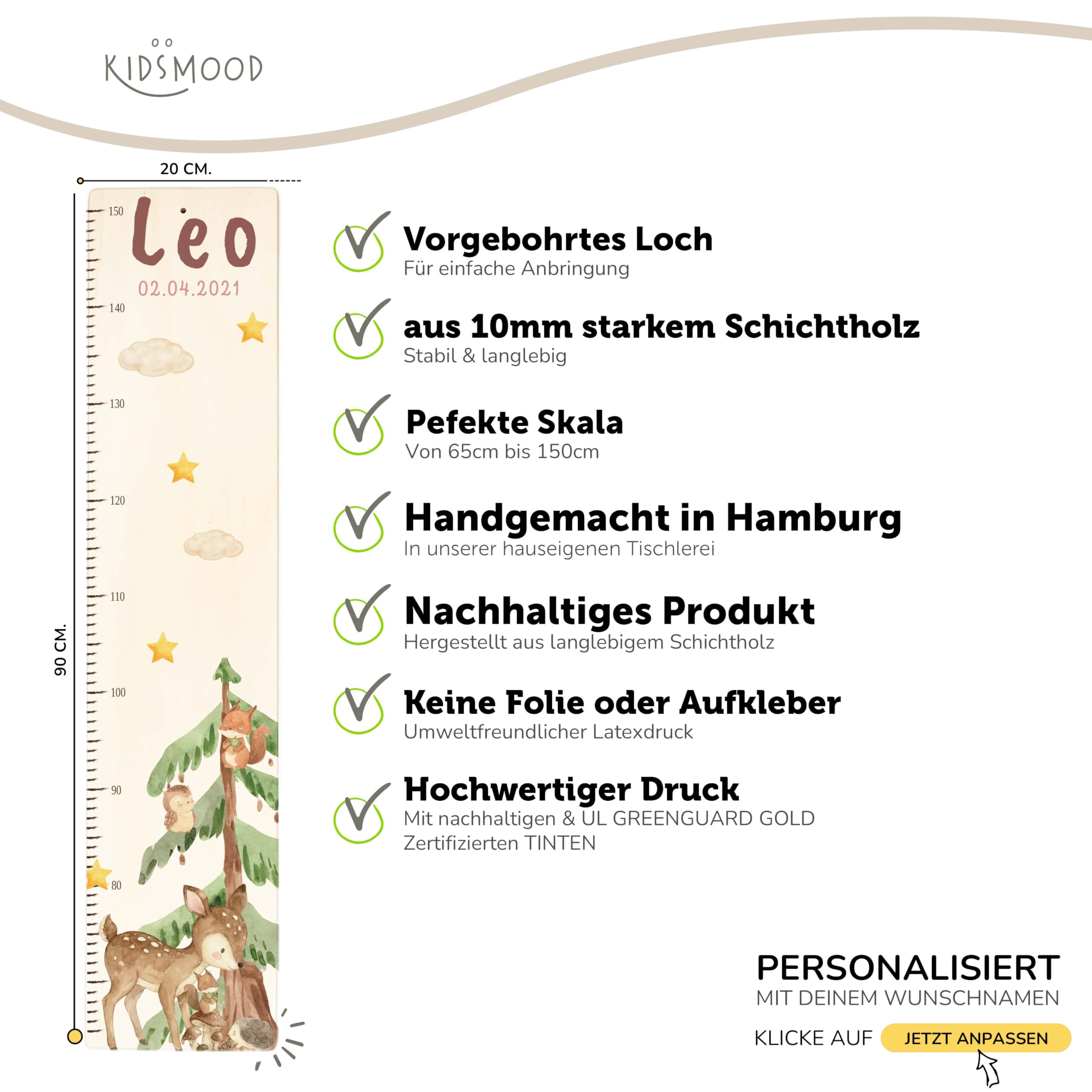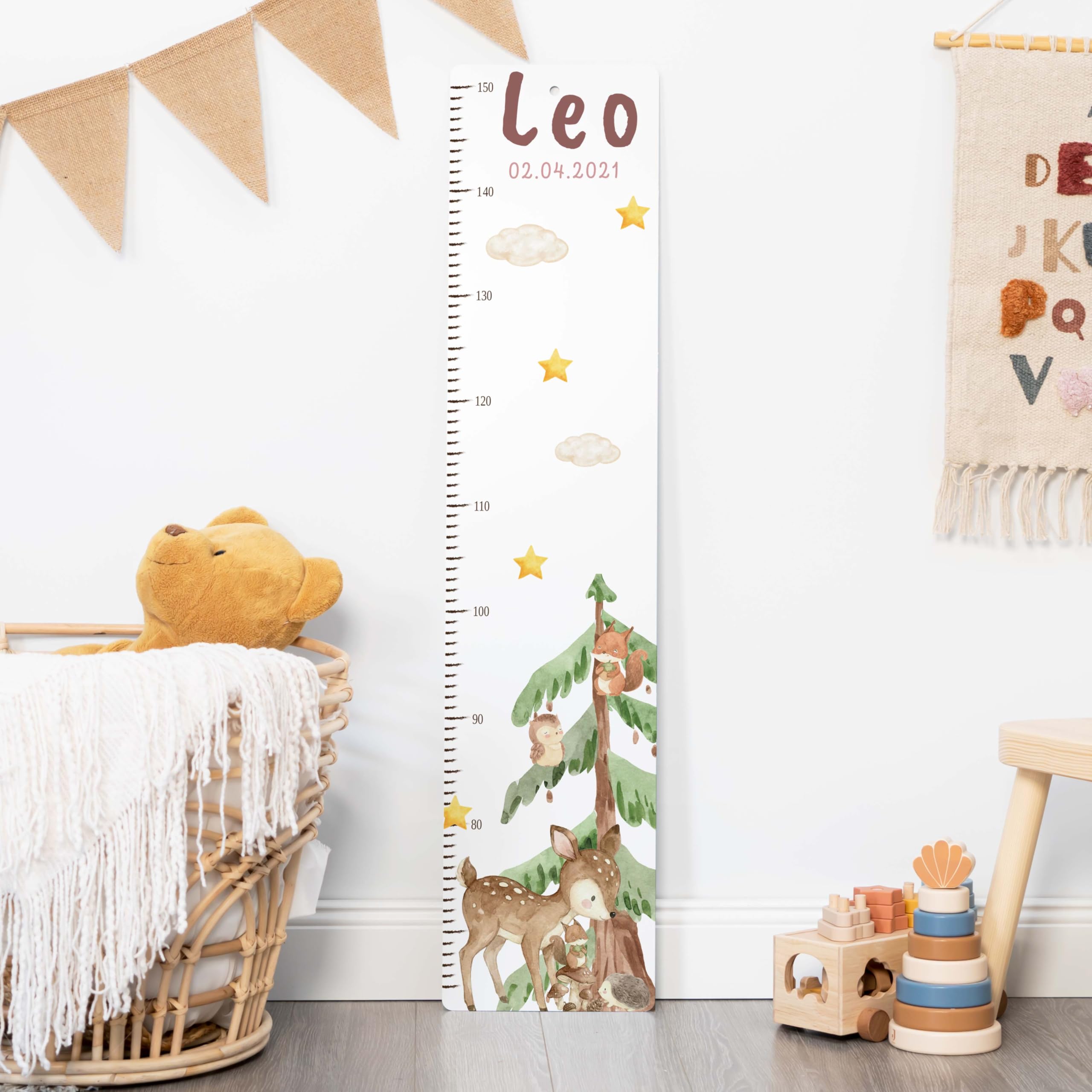 Kidsmood - Personalisierte Messlatte Kinder aus Aluverbund – Hochwertige Messleiste & Wand-Deko für Kinderzimmer mit liebevollem Reh im Wald – Tolles Taufgeschenk für Mädchen & Jungen (65-140cm)