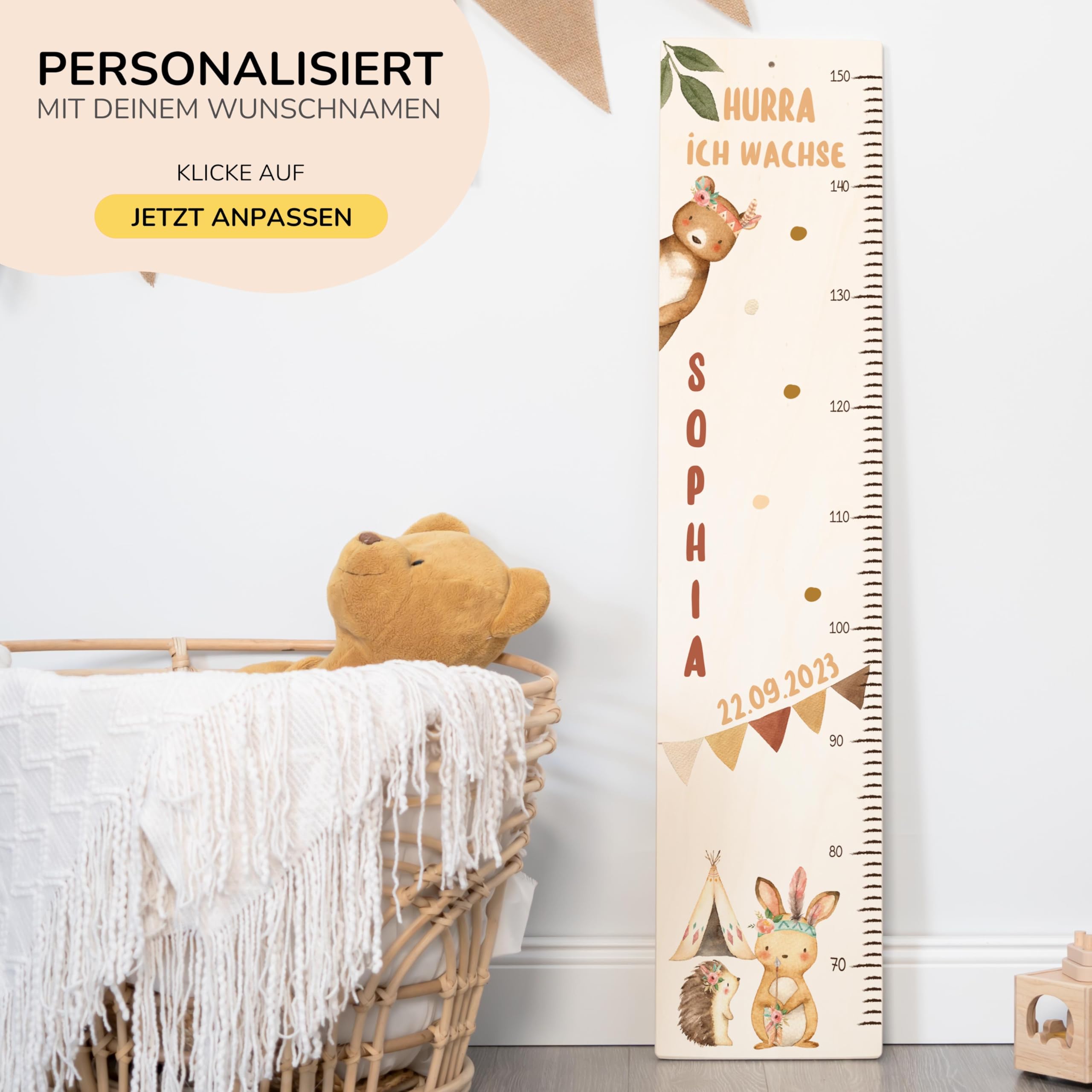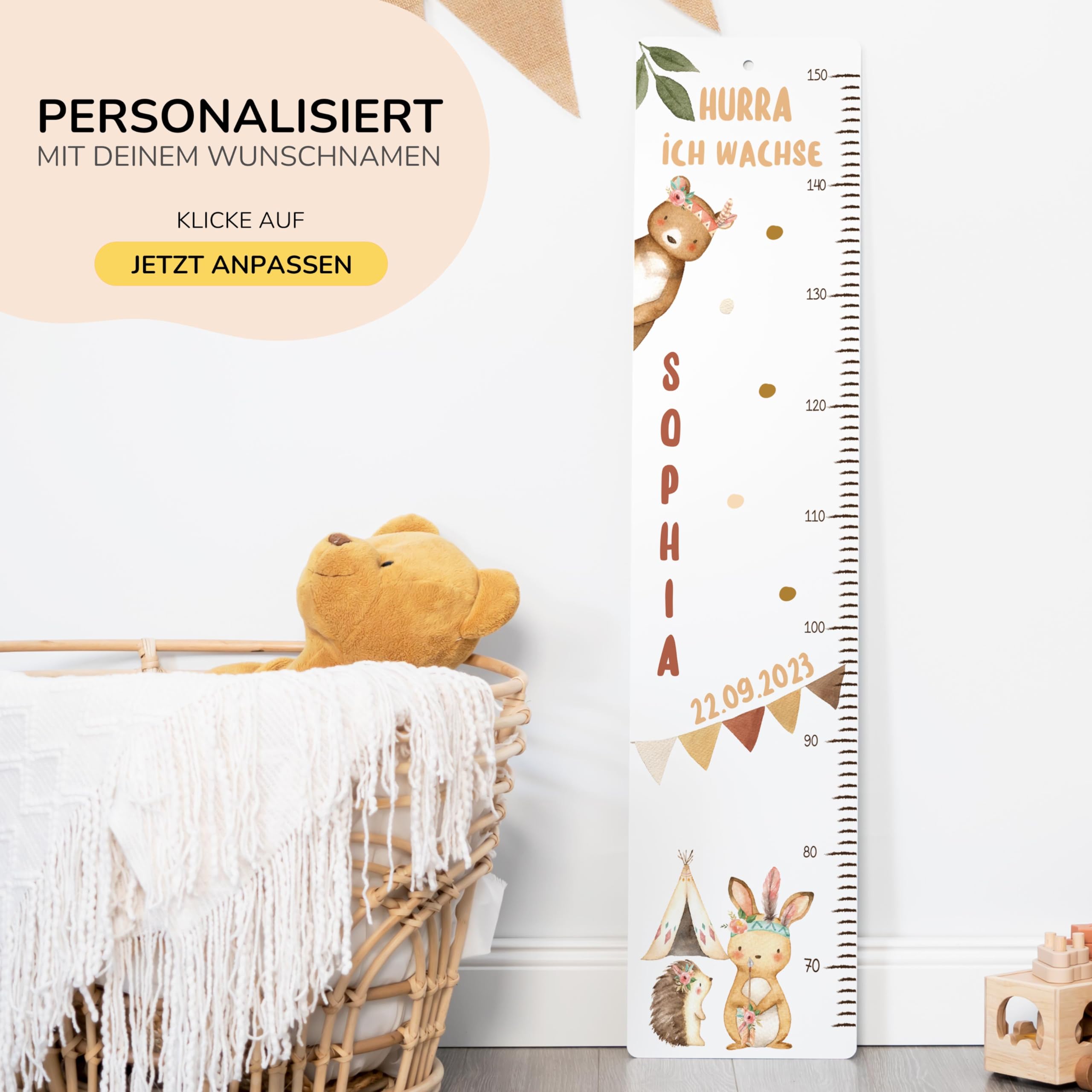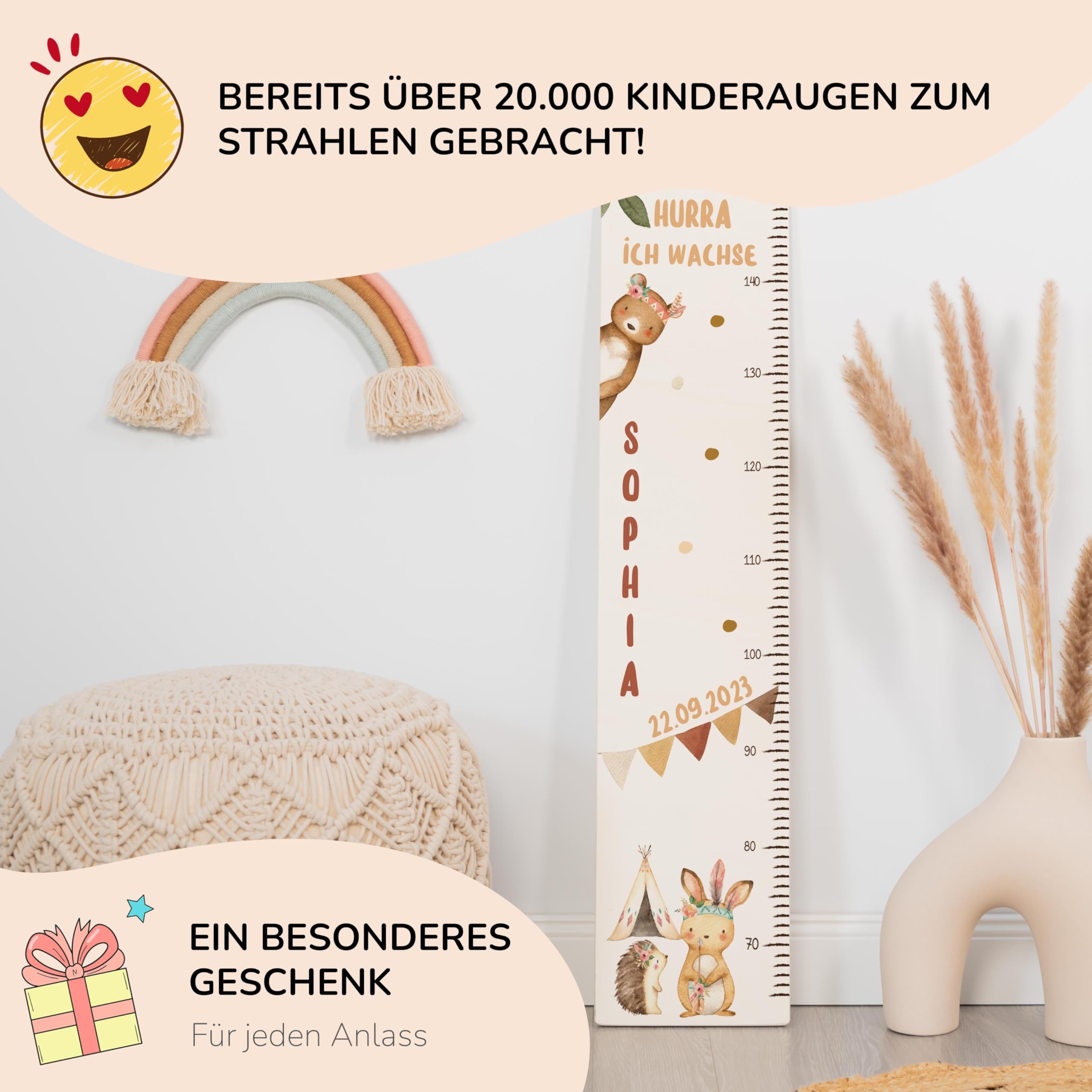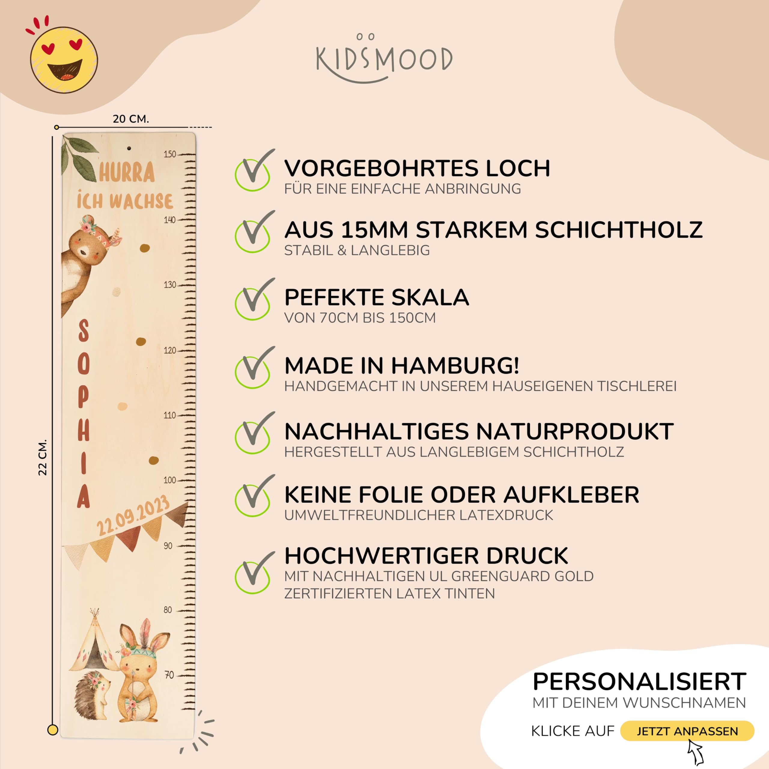 Die Kidsmood Messlatte Kinder Holz ist mehr als nur ein Grössenmesser – sie ist ein liebevoll gefertigtes Kunstwerk, das die schönsten Wachstumsphasen deines Kindes festhält und gleichzeitig das Kinderzimmer stilvoll bereichert. Jede personalisierte Messlatte wird aus hochwertigem, robustem Pappelholz gefertigt und mit umweltfreundlichen Latex-Tinten bedruckt, die speziell für die Sicherheit deines Babys und Kleinkindes ausgewählt wurden. Wir legen Wert auf Handwerkskunst und Nachhaltigkeit, damit jedes Stück ein einzigartiges Unikat wird. Mit einer Skala von 65 bis 140 cm begleitet diese Kindermesslatte aus Holz dein Kind über viele Jahre hinweg. Das zarte Boho Tiere Motiv zaubert eine friedliche und stilvolle Atmosphäre ins Kinderzimmer und regt die Fantasie an. Egal ob als personalisierte Messlatte für Mädchen oder Jungen, unsere vielfältigen Motive bieten für jeden Geschmack das Richtige. Diese Messlatte Kinder personalisiert ist das perfekte Geschenk zur Geburt, als Taufgeschenk oder zum Geburtstag. Stell dir die Freude vor, wenn du diese besondere Messleiste Kinderzimmer an der Wand siehst, die nicht nur die Grösse, sondern auch die Erinnerungen deines Kindes festhält. Klicke einfach auf „Jetzt anpassen“, gib den Namen und das Geburtsdatum deines Kindes ein, und wir fertigen ein personalisiertes Geschenk, das von Herzen kommt. Eine wundervolle Kinderzimmer Deko, die Funktionalität und ästhetischen Charme perfekt vereint. Erschaffe ein bleibendes Erinnerungsstück mit dieser einzigartigen Holz-Messlatte – ein wahrer Wunderwunsch für jedes Babyzimmer!