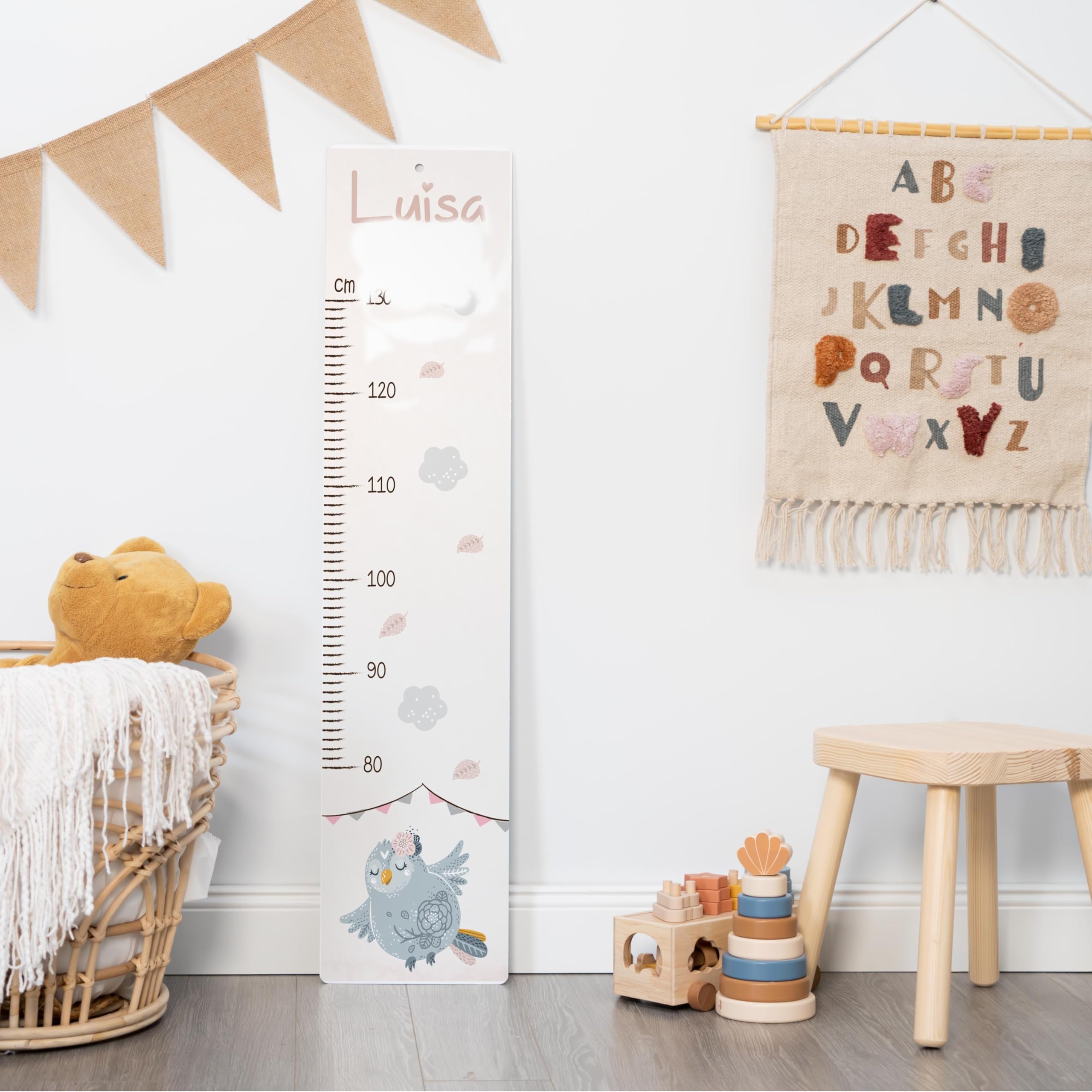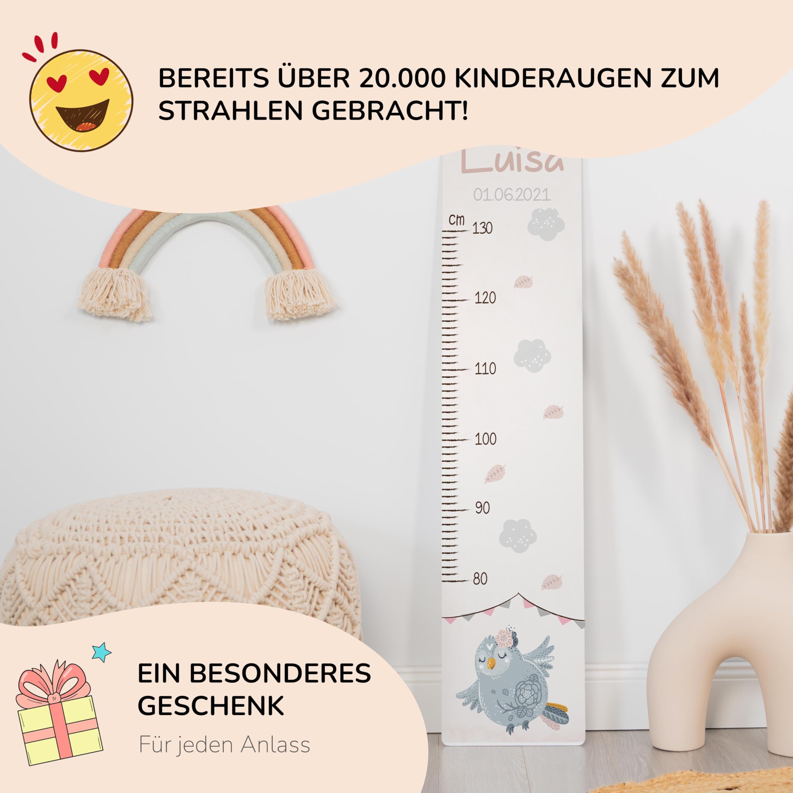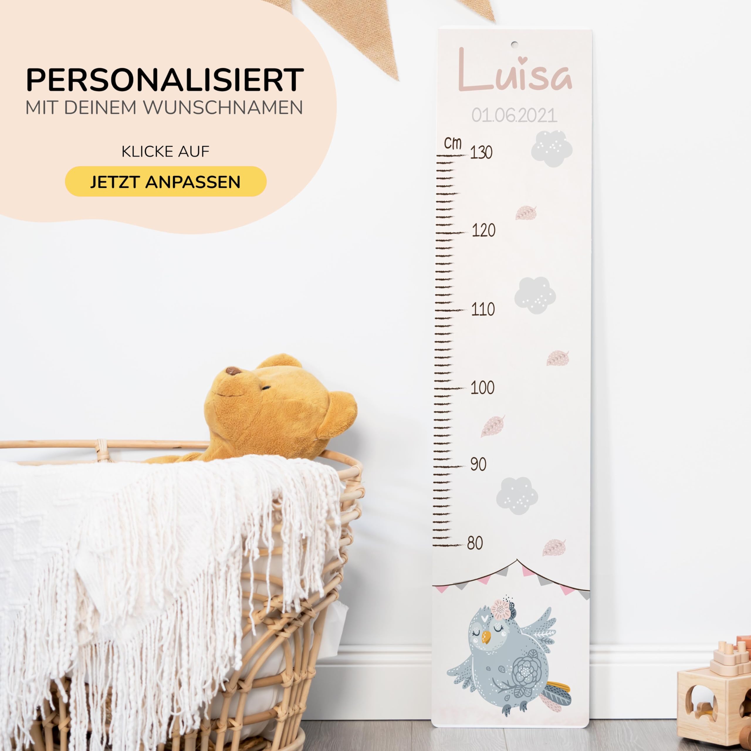 Die Kidsmood Messlatte Kinder Holz ist mehr als nur ein Grössenmesser – sie ist ein liebevoll gefertigtes Kunstwerk, das die schönsten Wachstumsphasen deines Kindes festhält und gleichzeitig das Kinderzimmer stilvoll bereichert. Jede personalisierte Messlatte wird aus hochwertigem, robustem Pappelholz gefertigt und mit umweltfreundlichen Latex-Tinten bedruckt, die speziell für die Sicherheit deines Babys und Kleinkindes ausgewählt wurden. Wir legen Wert auf Handwerkskunst und Nachhaltigkeit, damit jedes Stück ein einzigartiges Unikat wird. Mit einer Skala von 65 bis 140 cm begleitet diese Kindermesslatte aus Holz dein Kind über viele Jahre hinweg. Das weise Eulen Motiv bringt eine charmante, ruhige Präsenz ins Kinderzimmer und regt die Fantasie an. Egal ob als personalisierte Messlatte für Mädchen oder Jungen, unsere vielfältigen Motive bieten für jeden Geschmack das Richtige. Diese Messlatte Kinder personalisiert ist das perfekte Geschenk zur Geburt, als Taufgeschenk oder zum Geburtstag. Stell dir die Freude vor, wenn du diese besondere Messleiste Kinderzimmer an der Wand siehst, die nicht nur die Grösse, sondern auch die Erinnerungen deines Kindes festhält. Klicke einfach auf „Jetzt anpassen“, gib den Namen und das Geburtsdatum deines Kindes ein, und wir fertigen ein personalisiertes Geschenk, das von Herzen kommt. Eine wundervolle Kinderzimmer Deko, die Funktionalität und ästhetischen Charme perfekt vereint. Erschaffe ein bleibendes Erinnerungsstück mit dieser einzigartigen Holz-Messlatte – ein wahrer Wunderwunsch für jedes Babyzimmer!