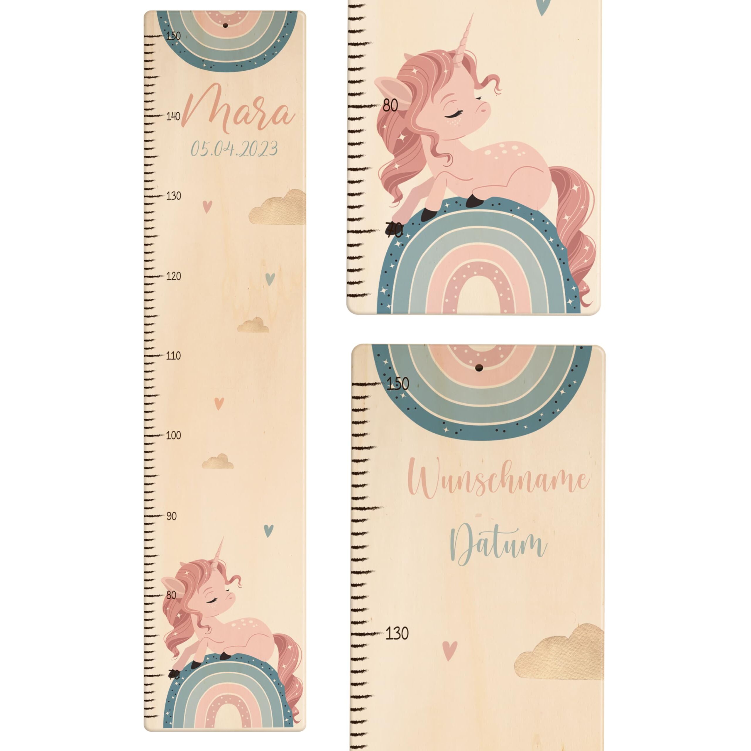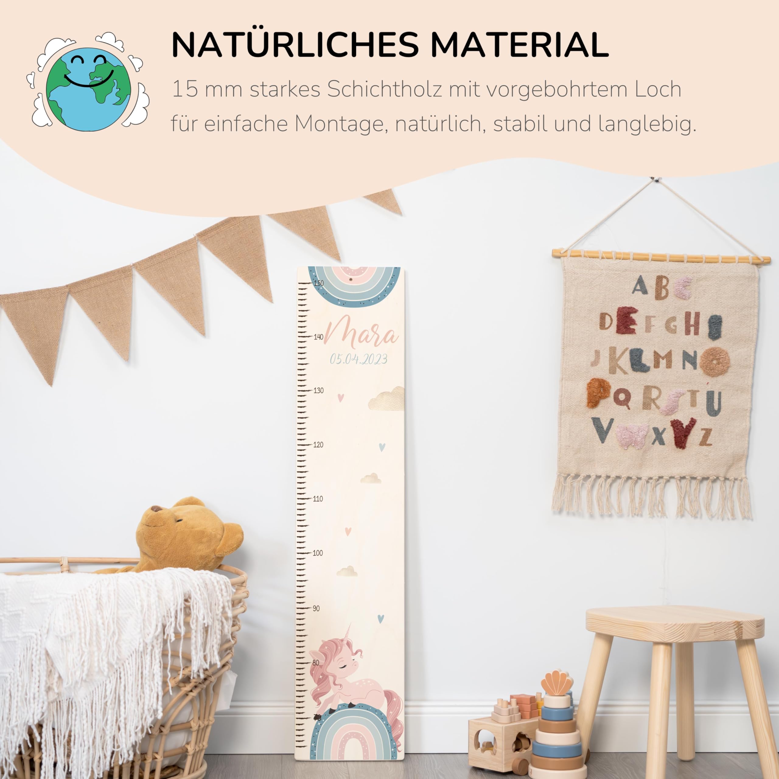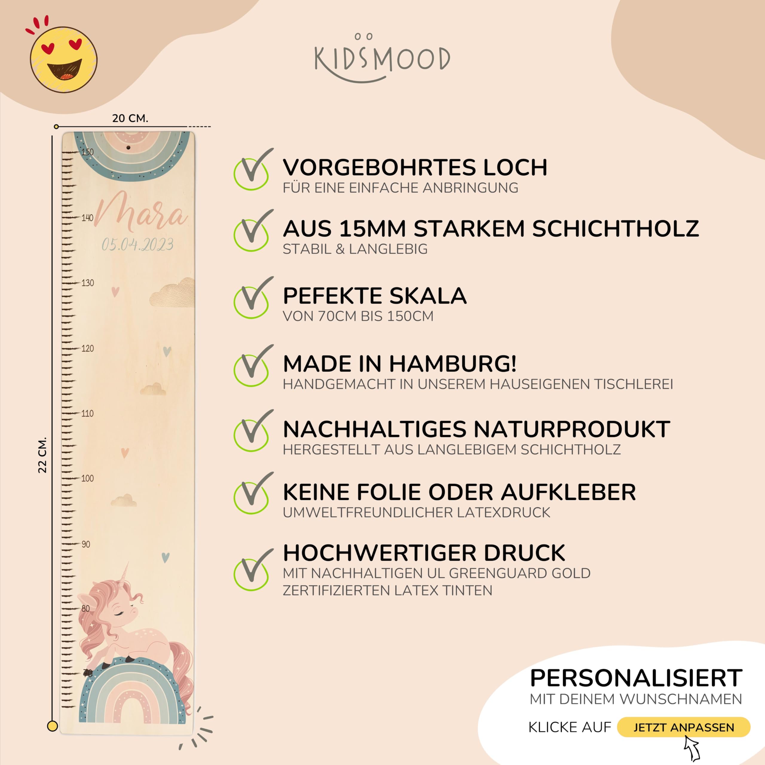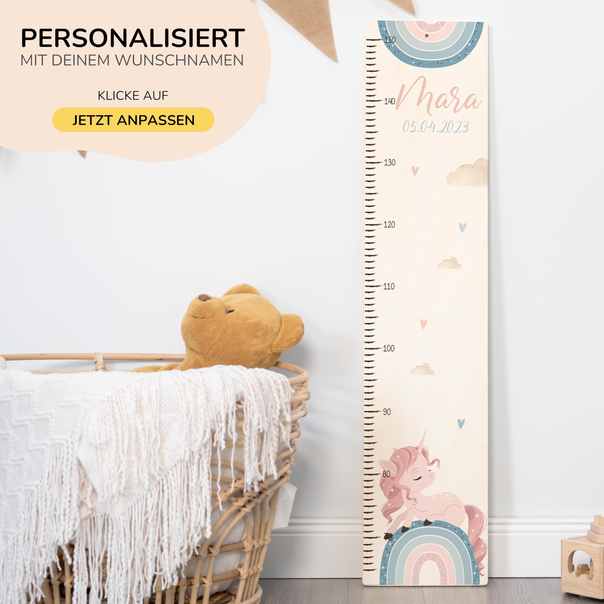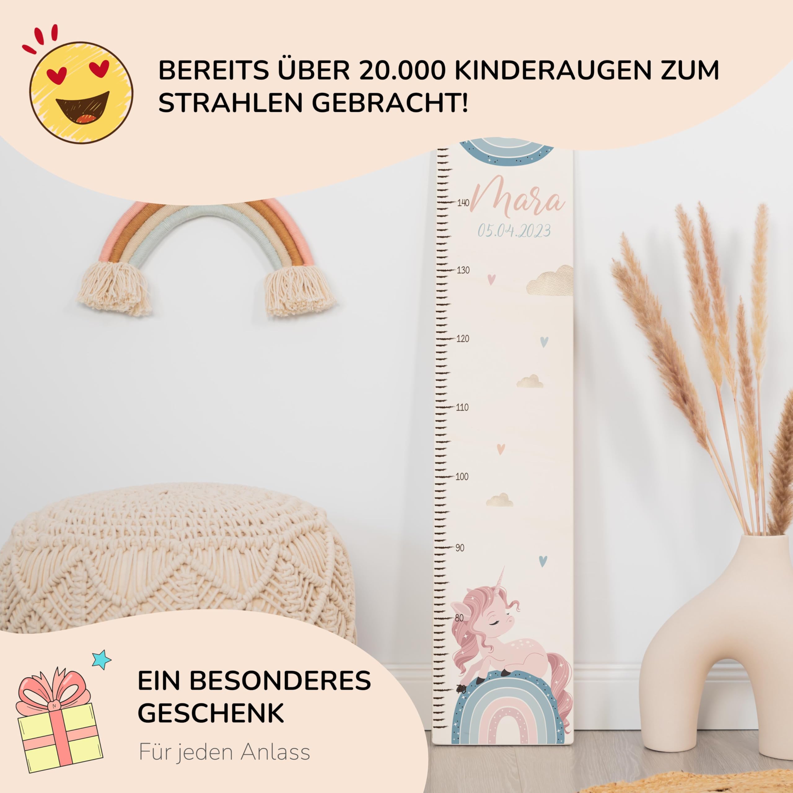 Die Kidsmood Messlatte Kinder Holz ist mehr als nur ein Grössenmesser – sie ist ein liebevoll gefertigtes Kunstwerk, das die schönsten Wachstumsphasen deines Kindes festhält und gleichzeitig das Kinderzimmer stilvoll bereichert. Jede personalisierte Messlatte wird aus hochwertigem, robustem Pappelholz gefertigt und mit umweltfreundlichen Latex-Tinten bedruckt, die speziell für die Sicherheit deines Babys und Kleinkindes ausgewählt wurden. Wir legen Wert auf Handwerkskunst und Nachhaltigkeit, damit jedes Stück ein einzigartiges Unikat wird. Mit einer Skala von 65 bis 140 cm begleitet diese Kindermesslatte aus Holz dein Kind über viele Jahre hinweg. Das magische Einhorn-Regenbogen Motiv vereint Fantasie und Farbe, lässt kleine Mädchenherzen höherschlagen und zaubert eine märchenhafte Welt ins Kinderzimmer. Egal ob als personalisierte Messlatte für Mädchen, unsere vielfältigen Motive bieten für jeden Geschmack das Richtige. Diese Messlatte Kinder personalisiert ist das perfekte Geschenk zur Geburt, als Taufgeschenk oder zum Geburtstag. Stell dir die Freude vor, wenn du diese besondere Messleiste Kinderzimmer an der Wand siehst, die nicht nur die Grösse, sondern auch die Erinnerungen deines Kindes festhält. Klicke einfach auf „Jetzt anpassen“, gib den Namen und das Geburtsdatum deines Kindes ein, und wir fertigen ein personalisiertes Geschenk, das von Herzen kommt. Eine wundervolle Kinderzimmer Deko, die Funktionalität und ästhetischen Charme perfekt vereint. Erschaffe ein bleibendes Erinnerungsstück mit dieser einzigartigen Holz-Messlatte – ein wahrer Wunderwunsch für jedes Babyzimmer!
