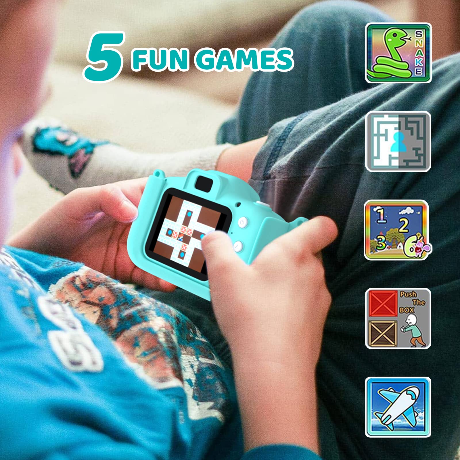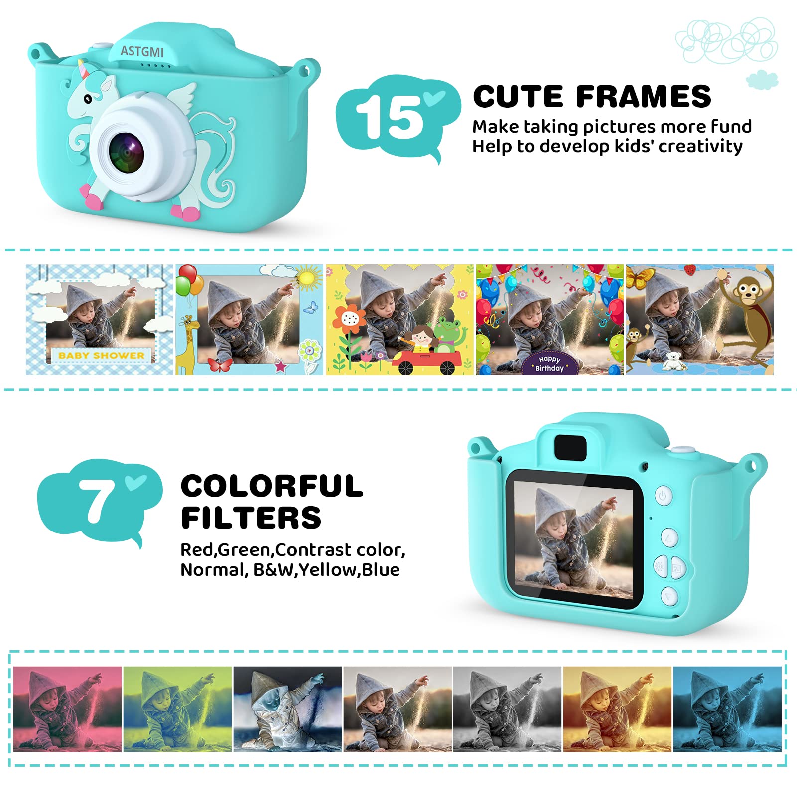 • 【Multifunktionale Kinderkamera 】Diese Kamera für Kinder verfügt über viele Funktionen, wie Fotoaufnahme, Videoaufnahme, Zeitrafferaufnahme, automatische Abschaltung, 24 niedliche lustige Cartoon-Rahmen und verschiedene Filtereffekte , Ihre Kinder können ihre Fotos selber machen; 5 Puzzlespiele, die Kindern mehr Spass bringen, ihre Vorstellungskraft entwickeln und ihre Intelligenz verbessern!