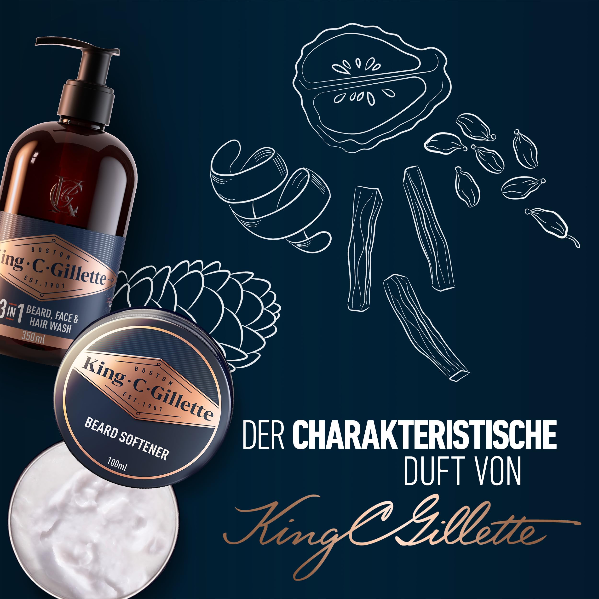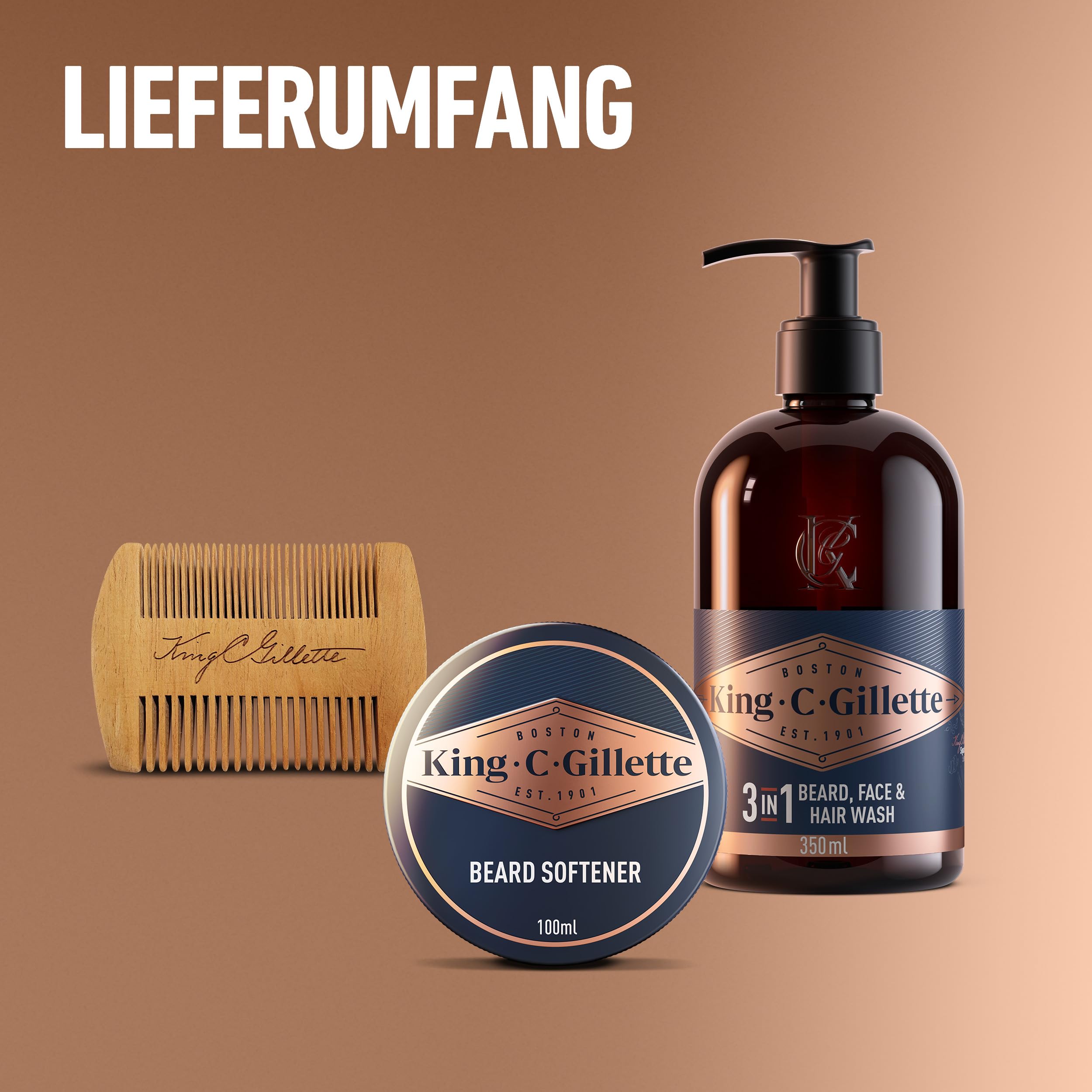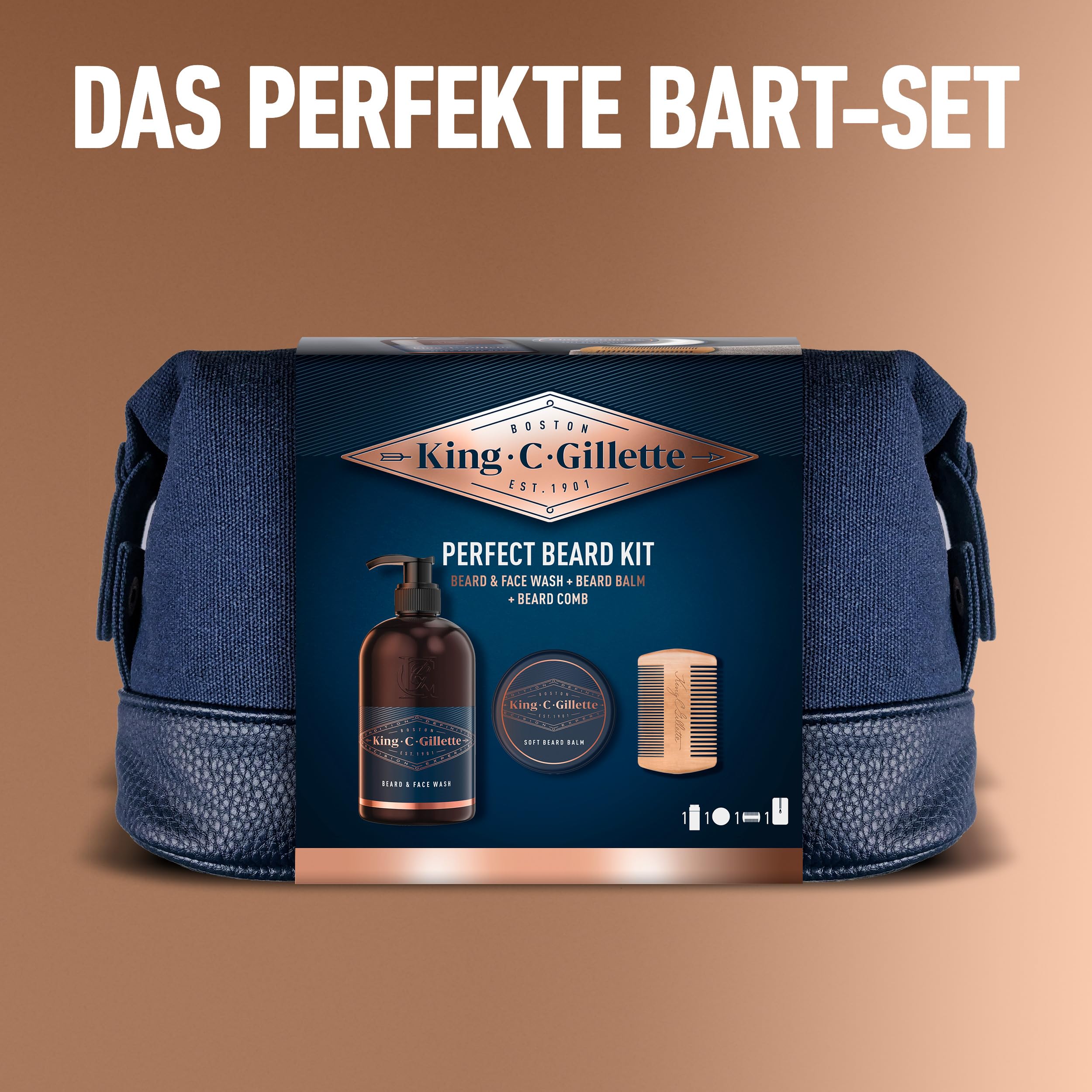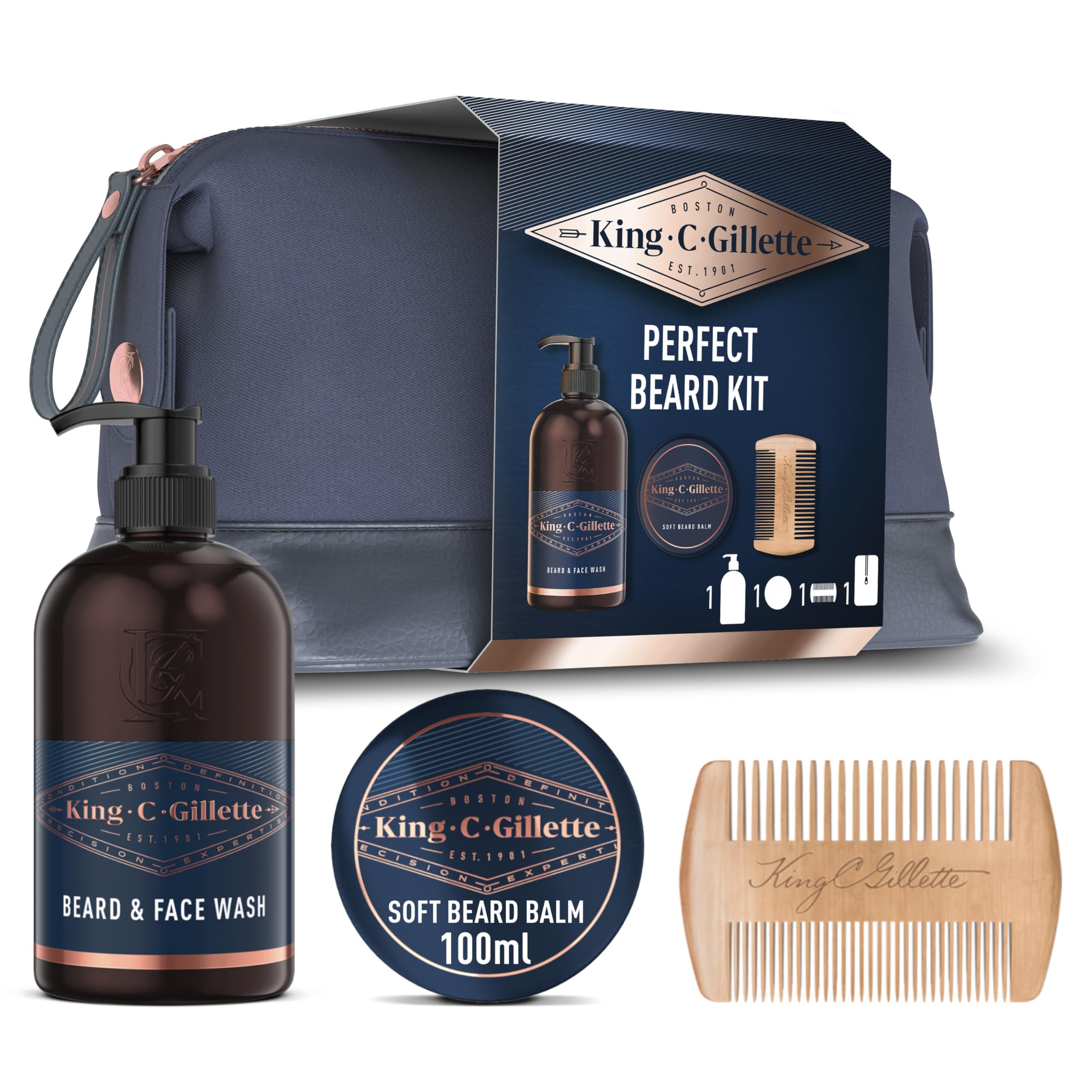 King C. Gillette Geschenkset Bartpflege Essentials: 350 ml Waschgel für Bart- und Gesichtpflege + 100 ml Bartbalsam für einen geschmeidigen Bart + Premium-Bartkamm + Kulturbeutel, Geschenk für Männer