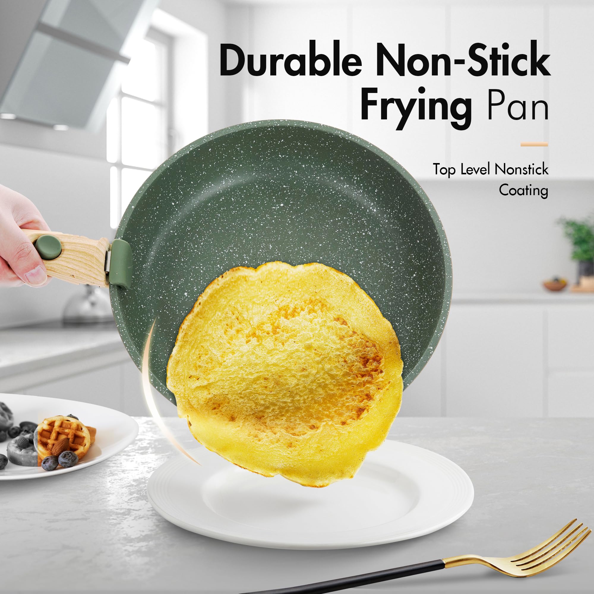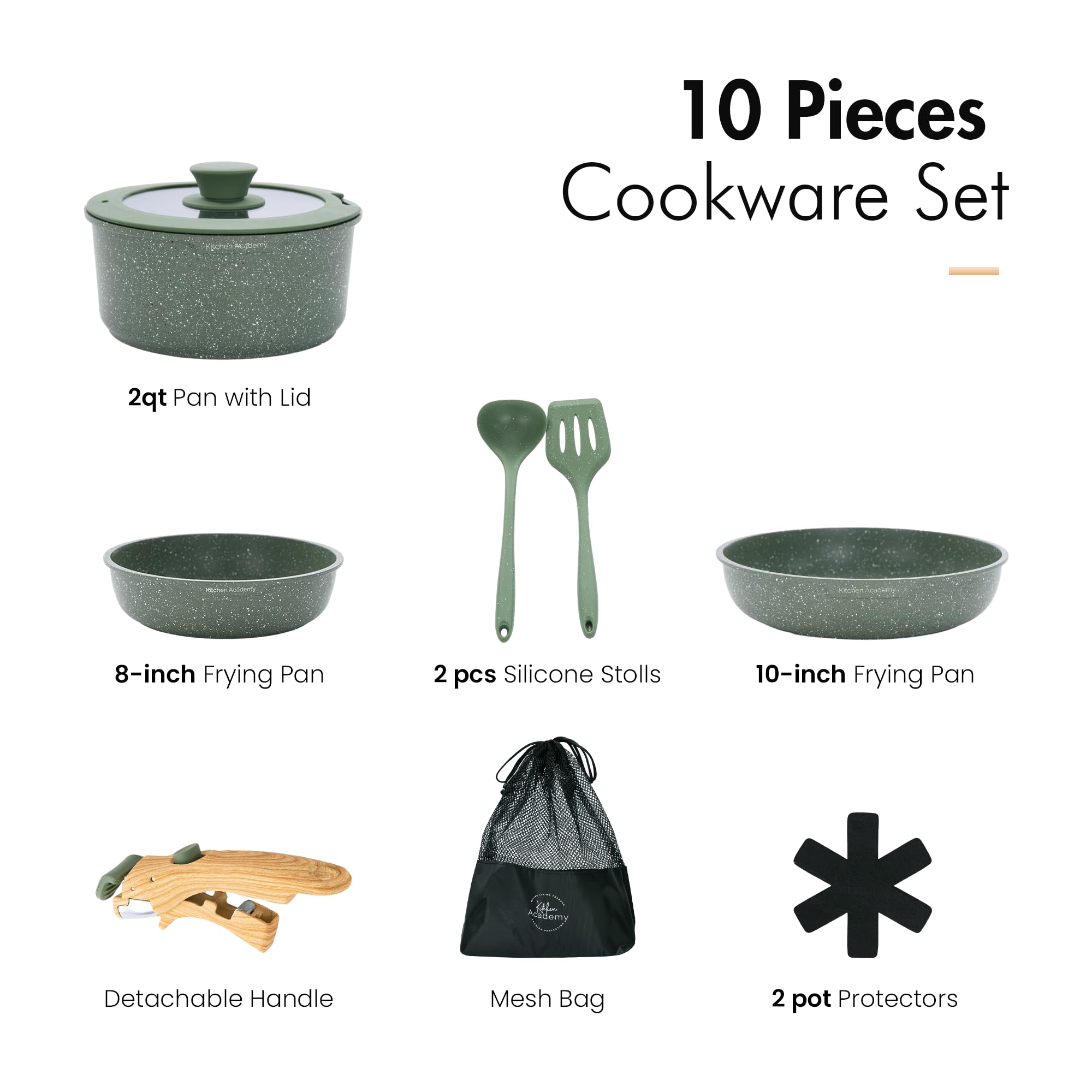 Kitchen Academy Topfset 10tlg, Topf Pfannenset mit Glasdeckeln, Marmorbeschichtung Antihaft-Versiegelung Kochgeschirr-Set, induktionsgeeignet, Maseriger glater Griff, Grün