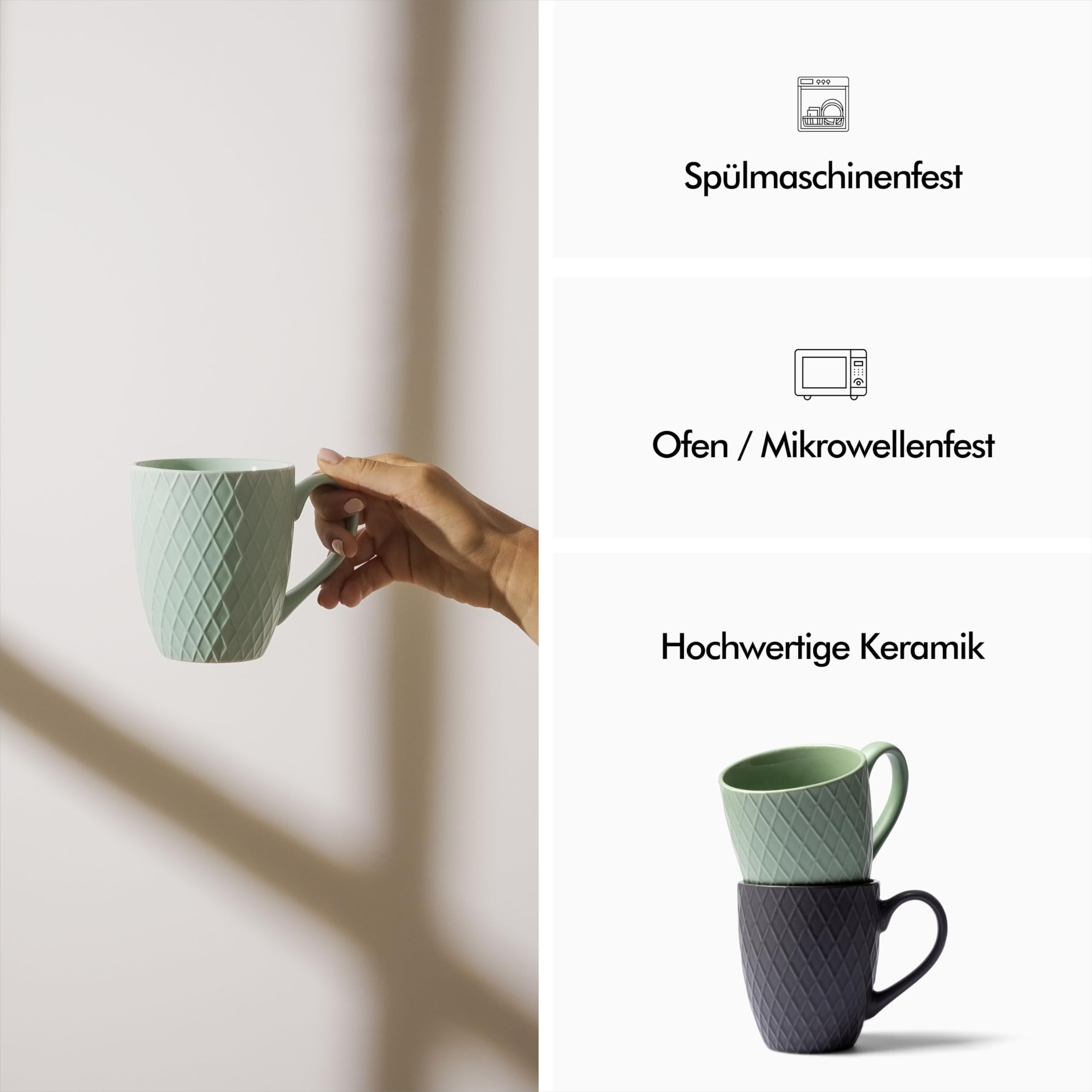 DETAILS UND PFLEGE - Lieferumfang: Tassen Set 6er (Creme Weiss)| Stil: Matt, Modern | Masse: V 400ml | H 10.5cm | 9cm | Pflege: Mikrowellen und Spülmaschinenfest GETRÄNKE BLEIBEN WARM - Die Keramik ist extra dickwandig. Dadurch ist das Kaffeetassen 6er Set besonders robust und langlebig. Zusammen mit der Rautenstruktur fühlt sich jede Teetasse sehr edel und hochwertig an. GROSSES VOLUMEN - Durch den grossen Henkel, liegen die Kaffee Tassen besonders angenehm in der Hand. Das grosse Volumen der Keramik Kaffeebecher ist ideal für Tee oder Kaffee. ZEITLOSE OPTIK - Die Kombination aus modernen Rautenmuster und den matten Farben, verleihen jeder Kaffeetasse eine moderne Optik. Entdecke die passenden Schalen und Teller aus der Komaki Kollektion. IDEALES GESCHENK - Die edle und hochwertige Verpackung lassen das Teetassen Set noch beeindruckender aussehen. Das KIVY Kaffetassen Set ist die ideale Geschenkidee für jeden Tee und Kaffeeliebhaber!