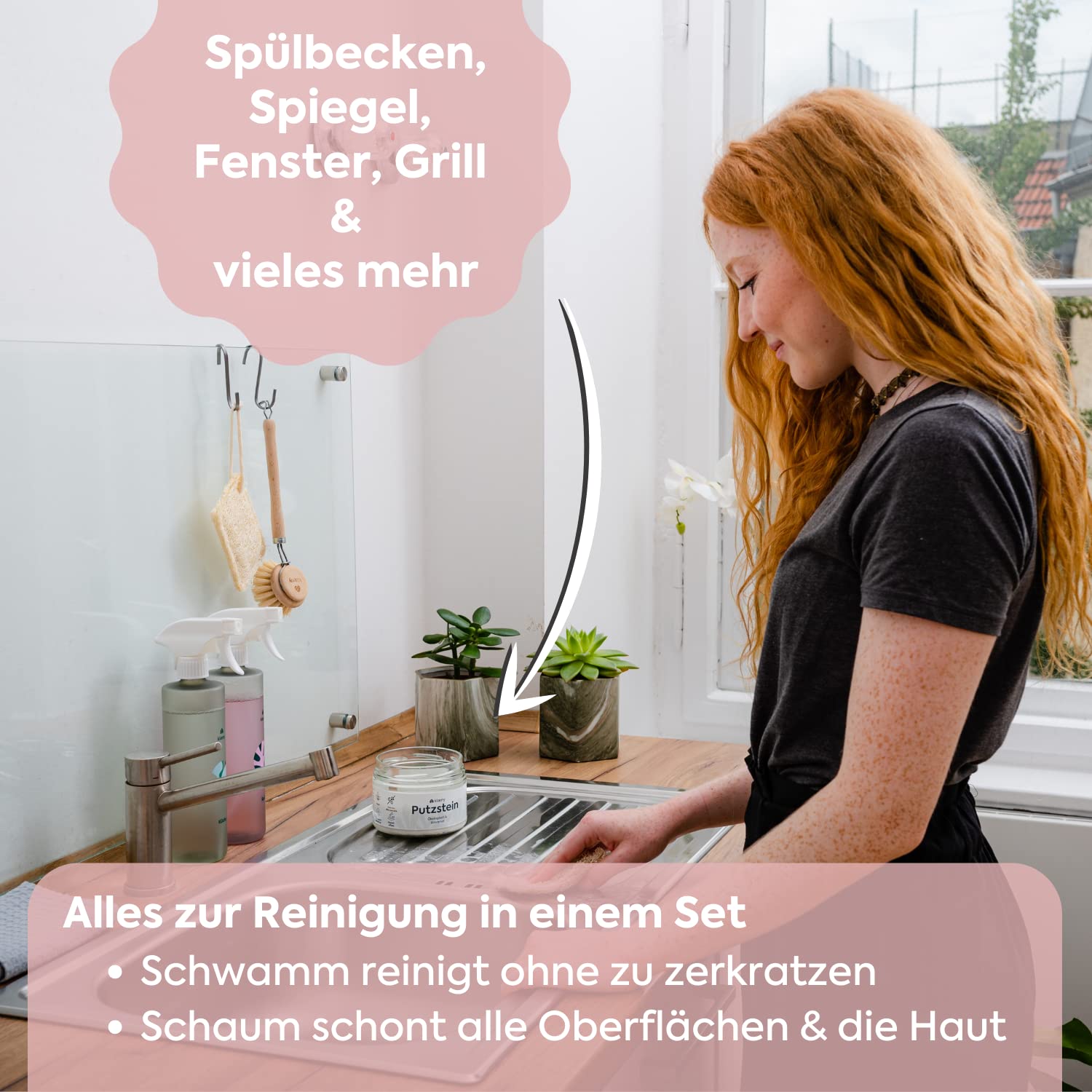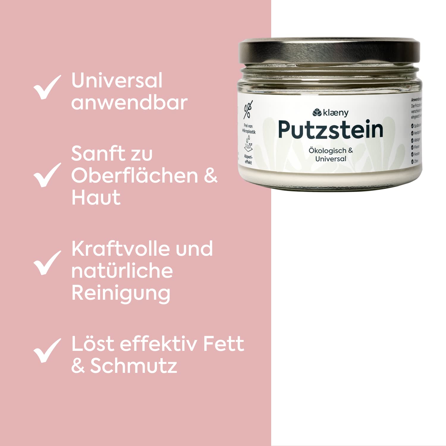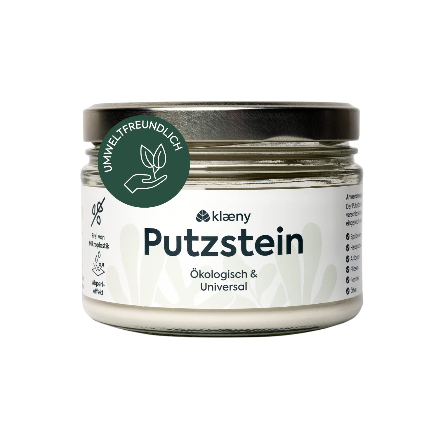 Nachhaltiger Putzstein ohne Mikroplastik: Mit unserem umweltfreundlichen und nachhaltigen Öko-Putzstein erstrahlt deine Wohnung wieder in neuem Glanz. Begleitet wird die neu gewonnene Sauberkeit von frischen Düften nach Zitrone - keine unangenehmen Gerüche mehr, für eine langanhaltende Frische. Verabschiede dich von Schmutz und Fett-Ablagerungen. Durch seine effektive, kraftvolle und natürliche Reinigung entfernt der Universal-Stein jegliche Ablagerungen rückstandsfrei. Trotzdem ist er sanft zu Oberflächen, sodass du dir keine Sorgen über Beschädigungen machen musst. Der Putzstein ohne chemische Zusätze kann in den verschiedensten Bereichen angewendet werden: In der Küche sind es Spülbecken und Herdplatten (Ceran und Induktion), Ablagen, Fliesen und Öfen, Kühlschrank und Dunstabzugshaube. Im Bad reinigt er Spiegel, Waschbecken und Duschwände uvm. Aber auch der Grill sowie Gartenmöbel und auch Fliesen und Fenster werden sauber. Die Verpackung ist zudem aus 100% recyceltem Glas gefertigt, um die Umwelt so wenig wie möglich zu belasten. Der Reinigungs-Putzstein ist ohne Mikroplastik, leicht bio-abbaubar, vegan und in Deutschland hergestellt. Mission - Verantwortung übernehmen! Durch die Partnerschaft mit CleanHub sind wir ein plastikneutrales Unternehmen, d.h. wir sammeln und wiederverwerten mindestens genauso viel Plastik, wie wir für die Herstellung von unserer Produkte benötigen. Unser Sammelpartner ist Tridi Oasis, ein Recyclingunternehmen in Indonesien, das von Dian & Dinda gegründet und geleitet wird. Mittlerweile recyceln sie mehr als 750.000 kg Plastik im Monat.