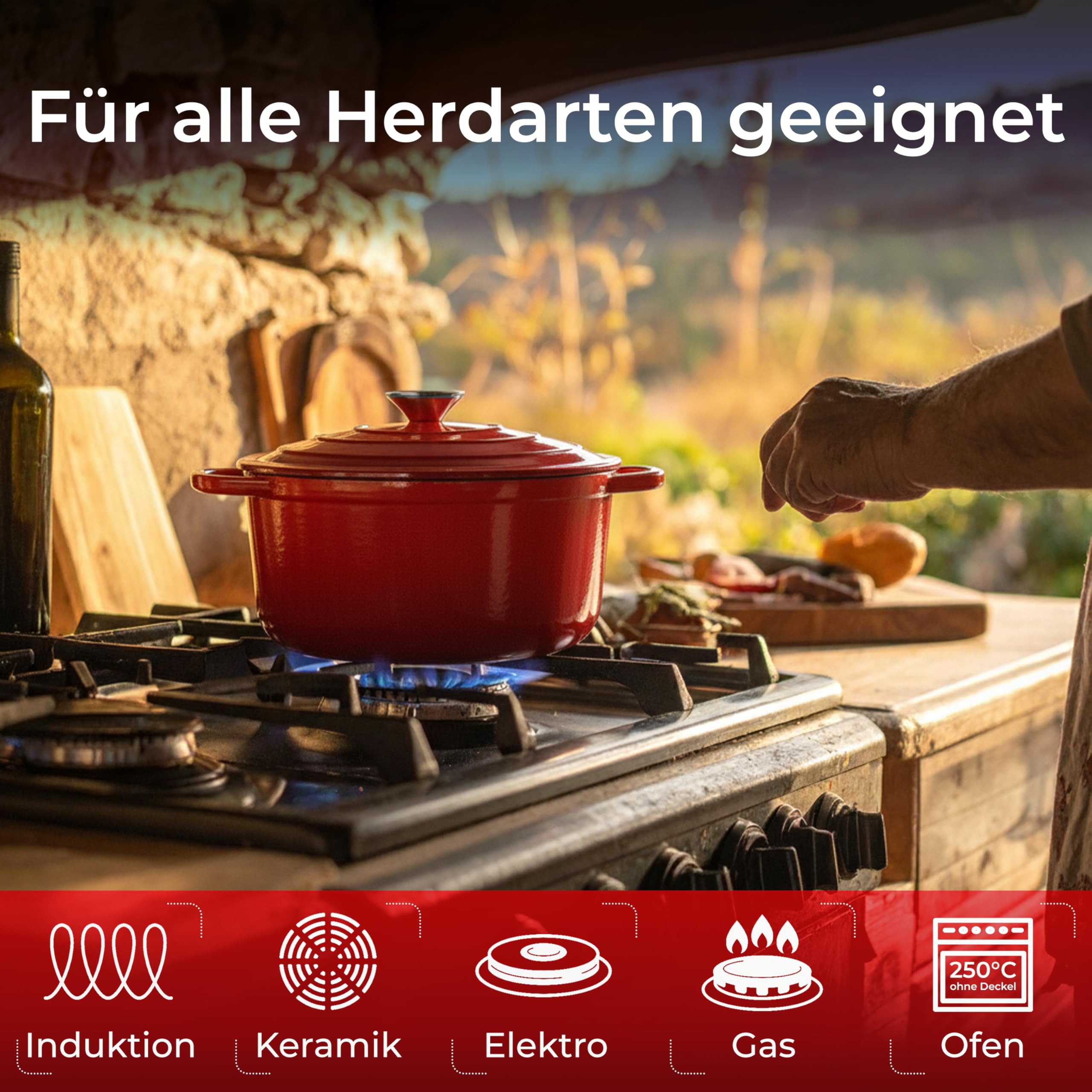 KLAMER Gusseisen Bräter 5 L, Gusseisen-Topf 25 cm backofengeeignet, Emaille Schmortopf mit Deckel, Perfekt zum Braten, Schmoren und Brot backen, mit digitalem Rezeptbuch
