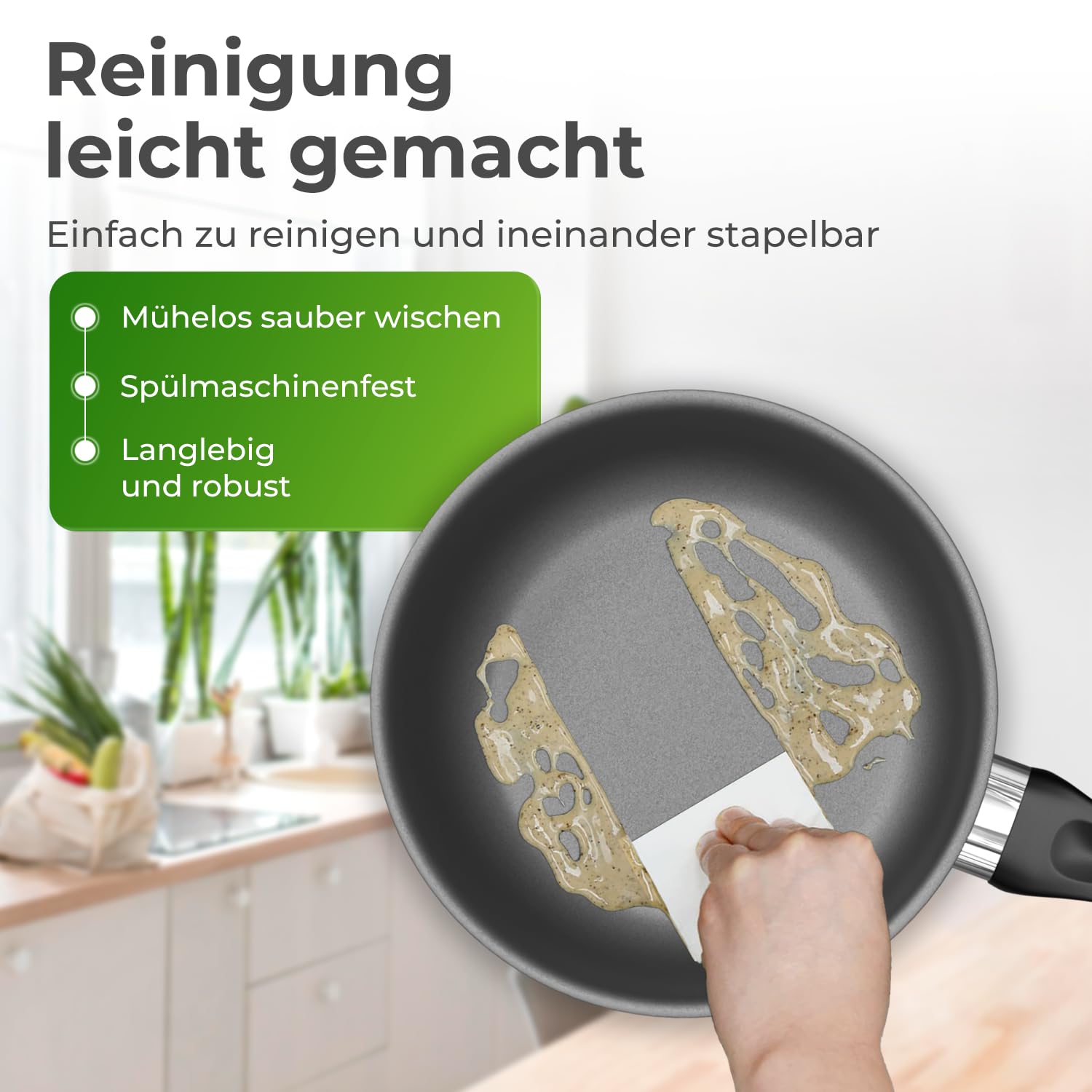 Die KLAMER Bratpfanne 24 cm ist der perfekte Küchenbegleiter für alle, die Wert auf Qualität, Funktionalität und Langlebigkeit legen. Egal, ob du sanftes Garen, scharfes Anbraten oder schonendes Schmoren bevorzugst – die hochwertige Edelstahlpfanne liefert perfekte Ergebnisse auf allen Herdarten, einschliesslich Induktion, Gas, Elektro und Ceran. Dank der durchdachten Materialkombination aus extra hartem Edelstahl und einem Aluminiumkern im Boden sorgt sie für eine besonders gleichmässige Wärmeverteilung und -speicherung. Die Wandstärke von 0,8 mm verbessert die Hitzeeffizienz und macht das Kochen energiesparender. Ein Highlight der KLAMER Pfanne ist die hochwertige Greblon C3+ Antihaftbeschichtung. Diese zählt zu den besten Antihaftversiegelungen auf dem Markt und ermöglicht fettarmes Braten ohne Anhaften oder Anbrennen. Selbst empfindliche Speisen wie Fisch, Eier oder Pfannkuchen gleiten mühelos aus der Pfanne. Die keramikverstärkte PTFE-Beschichtung sorgt nicht nur für exzellente Bratergebnisse, sondern erleichtert auch die Reinigung. Die Pfanne ist spülmaschinengeeignet und wiederbeschichtbar, wodurch ihre Lebensdauer verlängert und eine nachhaltige Nutzung gefördert wird. Auch die Handhabung überzeugt durch durchdachtes Design und maximalen Komfort. Der ergonomisch geformte Griff liegt perfekt in der Hand und bleibt bei längerem Kochen angenehm kühl. Zudem ist er hitzebeständig, sodass die Pfanne im Backofen verwendet werden kann – ideal für Gerichte, die eine Kombination aus Braten und Überbacken erfordern. Ein breiter Schüttrand ermöglicht das tropffreie Abgiessen von Flüssigkeiten und sorgt für eine saubere Zubereitung. Für eine platzsparende Aufbewahrung verfügt die KLAMER Bratpfanne über eine praktische Aufhängeöse. Ausserdem kann sie problemlos ineinander gestapelt werden, wenn du mehrere Grössen besitzt. Die Kombination aus hochwertiger Verarbeitung, innovativer Beschichtung und maximalem Kochkomfort macht diese Pfanne zu einem unverzichtbaren Küchenhelfer.