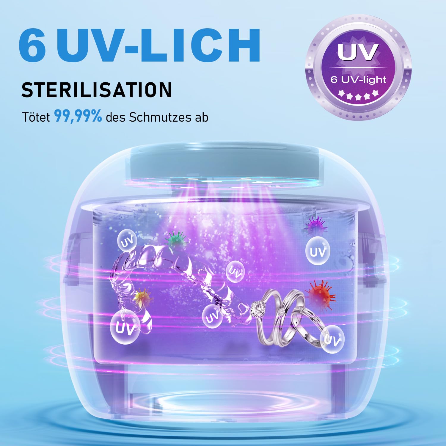 Die leistungsstarke Ultraschalltechnologie erzeugt hochfrequente Mikrovibrationen, die Plaque, Speisereste, Ablagerungen und Rueckstaende selbst aus schwer zugaenglichen Bereichen loesen. Zusaetzlich unterstuetzen die 6 UV Lampen die hygienische Sauberkeit und tragen zur Reduzierung von Keimen und Bakterien auf Dentalprodukten bei.
