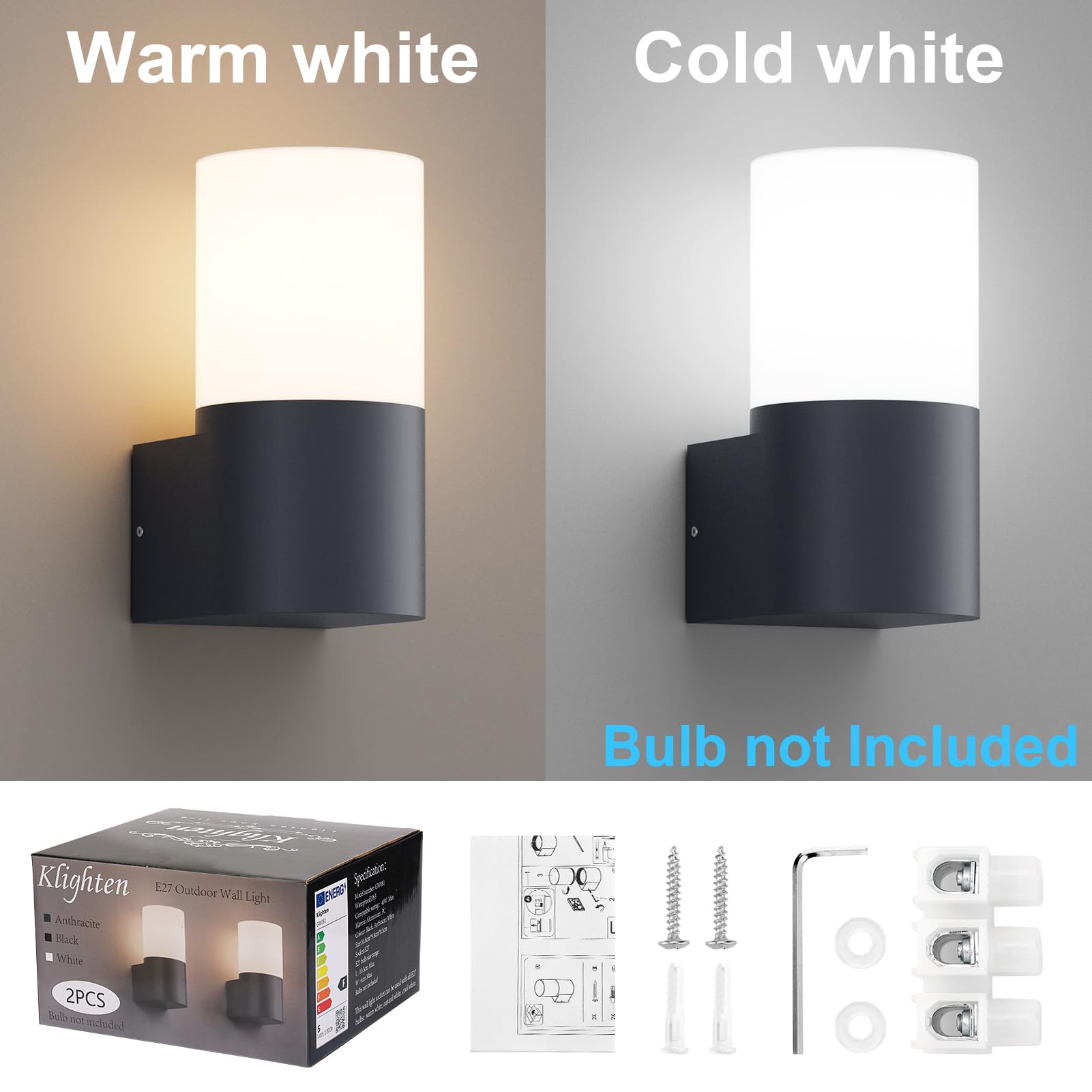 Klighten 2 Stück Aussenwandleuchten E27 Fassung Aussenleuchte, Wandleuchten Aussen/Innen, IP65 Aussenleuchte, Aluminium Aussenlampe, Wandlampe für Eingang Terrass, Max 40W, ohne Leuchtmittel, Anthrazit