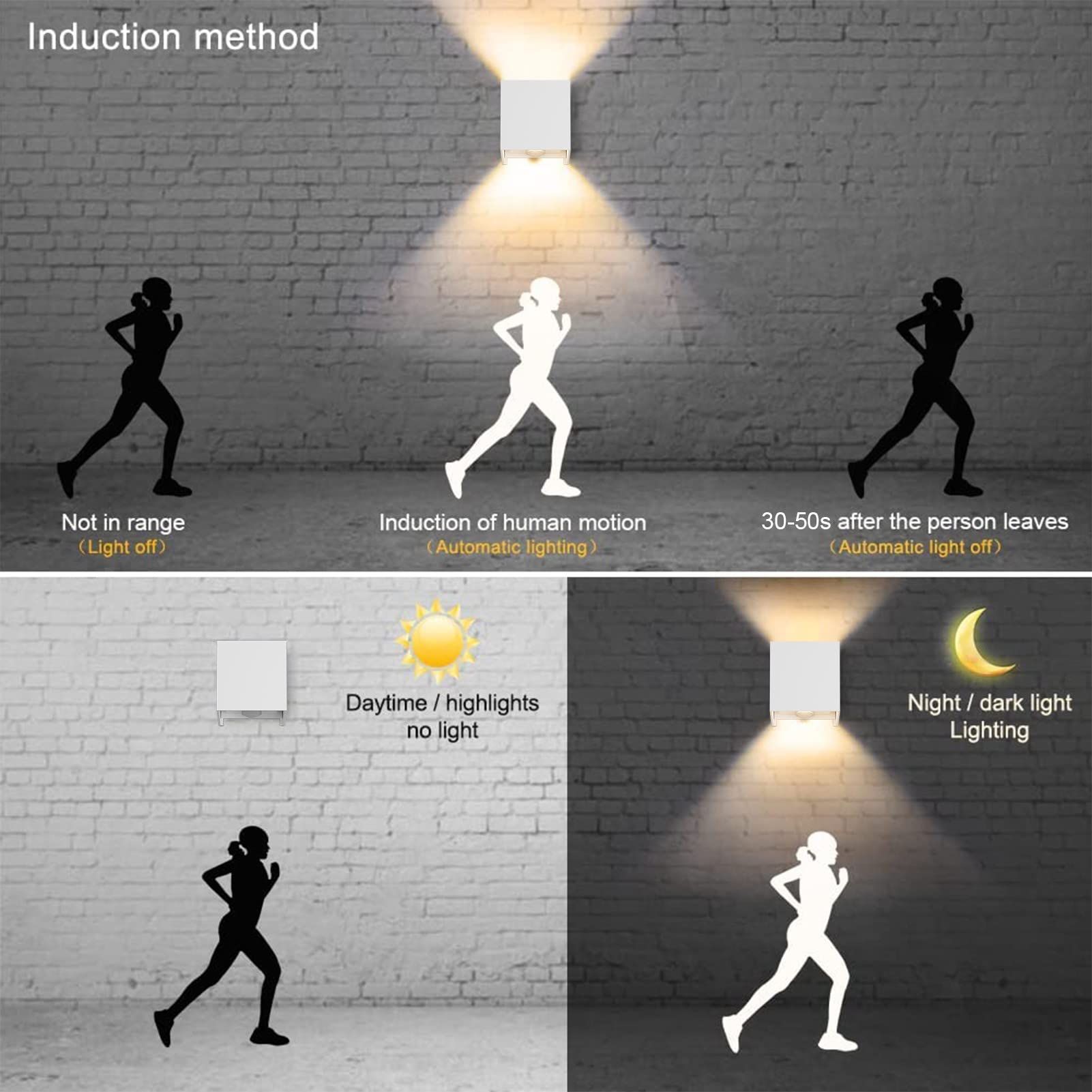 Induktionsfunktion des menschlichen Körpers, Dämmerungsfunktion. Tagsüber leuchtet die Wandleuchte nicht auf, nachts wird das Licht durch die Induktionsfunktion des menschlichen Körpers beleuchtet und die Wandleuchte wird automatisch 30 bis 50 Sekunden nach dem Verlassen des Erfassungsbereichs durch denmenschlichen Körper ausgeschaltet.