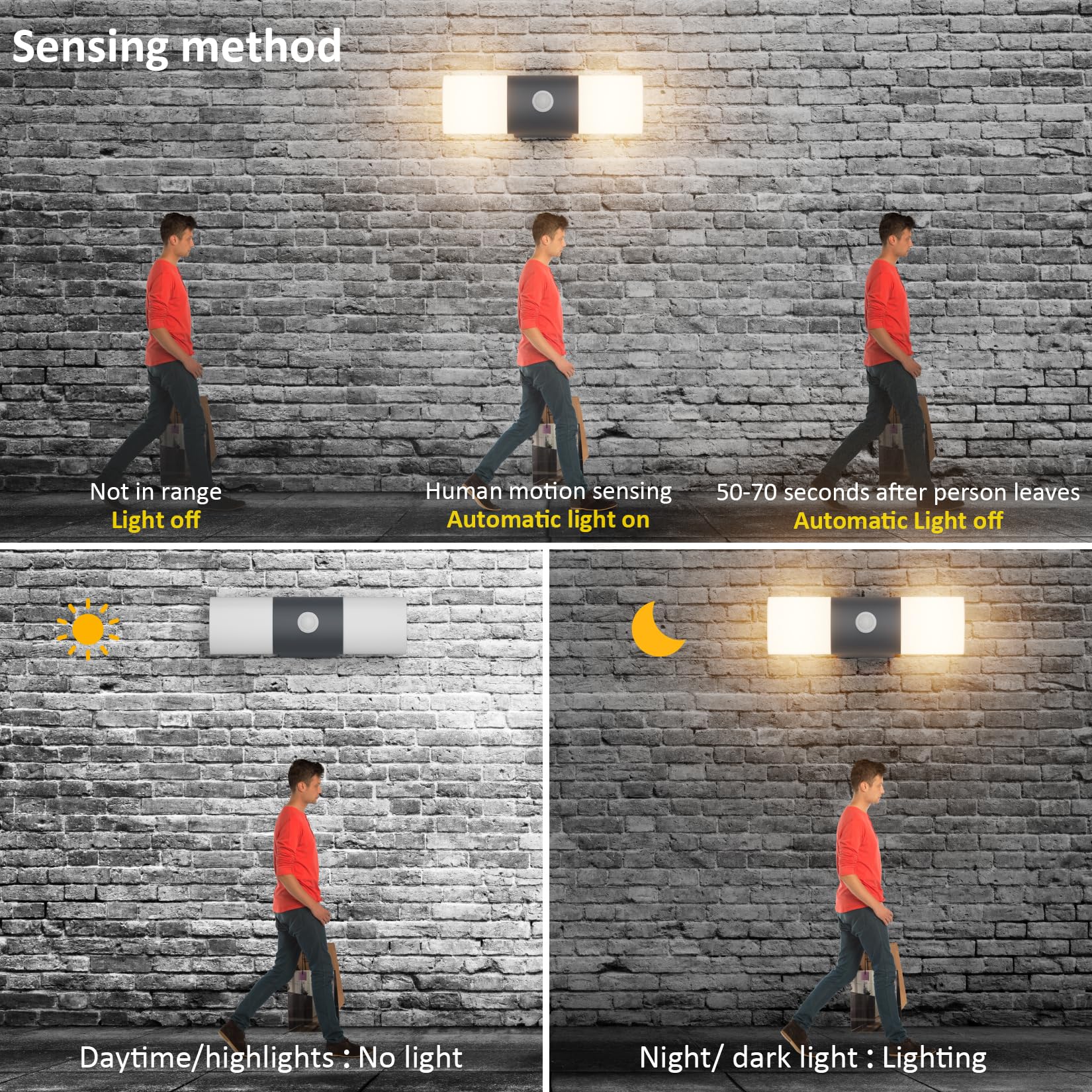 - 【Motion Sensor Funktion】 :Aussenwandleuchte mit Bewegungssensor, eingebauter Bewegungsmelder und menschlicher Infrarotsensor. In der Nacht schaltet sich das Licht ein, wenn jemand den Erfassungsbereich betritt. Wenn keine menschliche Bewegung erkannt wird, wird es automatisch ausgeschaltet. Tagsüber schaltet sich die Wandleuchte automatisch aus, um mehr Energie zu sparen, den Komfort zu erhöhen und die Umwelt zu schützen.