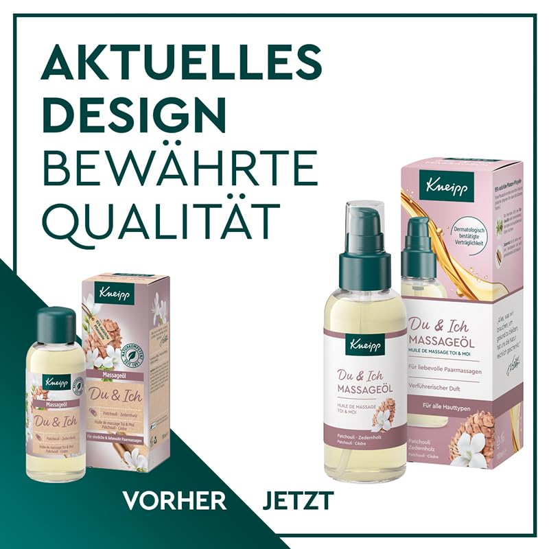Gemeinsame Momente der Entspannung mit dem Kneipp Du & Ich Massageöl. Die hochwertige Formulierung mit natürlichem ätherischen Patchouli- & Zedernholzöl schenkt wohltuende Momente der Zweisamkeit. Intensiv pflegende Pflanzenöle und zellschützendes Vitamin E hinterlassen ein angenehm-weiches und geschmeidiges Hautgefühl. Das Kneipp Du & Ich Massageöl lässt sich leicht verteilen, zieht langsam ein und verströmt seinen verführerischen Duft durch die freigesetzte Wärme bei der Massage besonders intensiv. 95% natürliche Pflanzen-Pflegeöle. Unsere Massageöle enthalten einen hohen Anteil an pflanzlichen pflegenden Ölen sowie zellschützendes Vitamin E. Der besondere Duft des Patchouliöls wirkt harmonisierend, beruhigend und ausgleichend auf Körper und Seele. Zedernholz ist für seinen warmen, beruhigenden und auch aphrodisierenden Duft bekannt. Für liebevolle Paarmassagen. Für alle Hauttypen. Dermatologisch bestätigte Verträglichkeit.