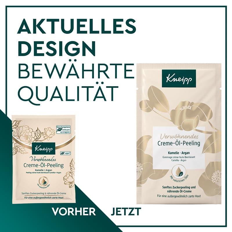 Das Kneipp Verwoehnende Creme-Oel-Peeling bietet eine wohltuende Kombination aus sanfter Reinigung und reichhaltiger Pflege. Die feinen Zuckerkristalle loesen abgestorbene Hautzellen schonend und verfeinern das Hautbild, ohne die Haut zu reizen.