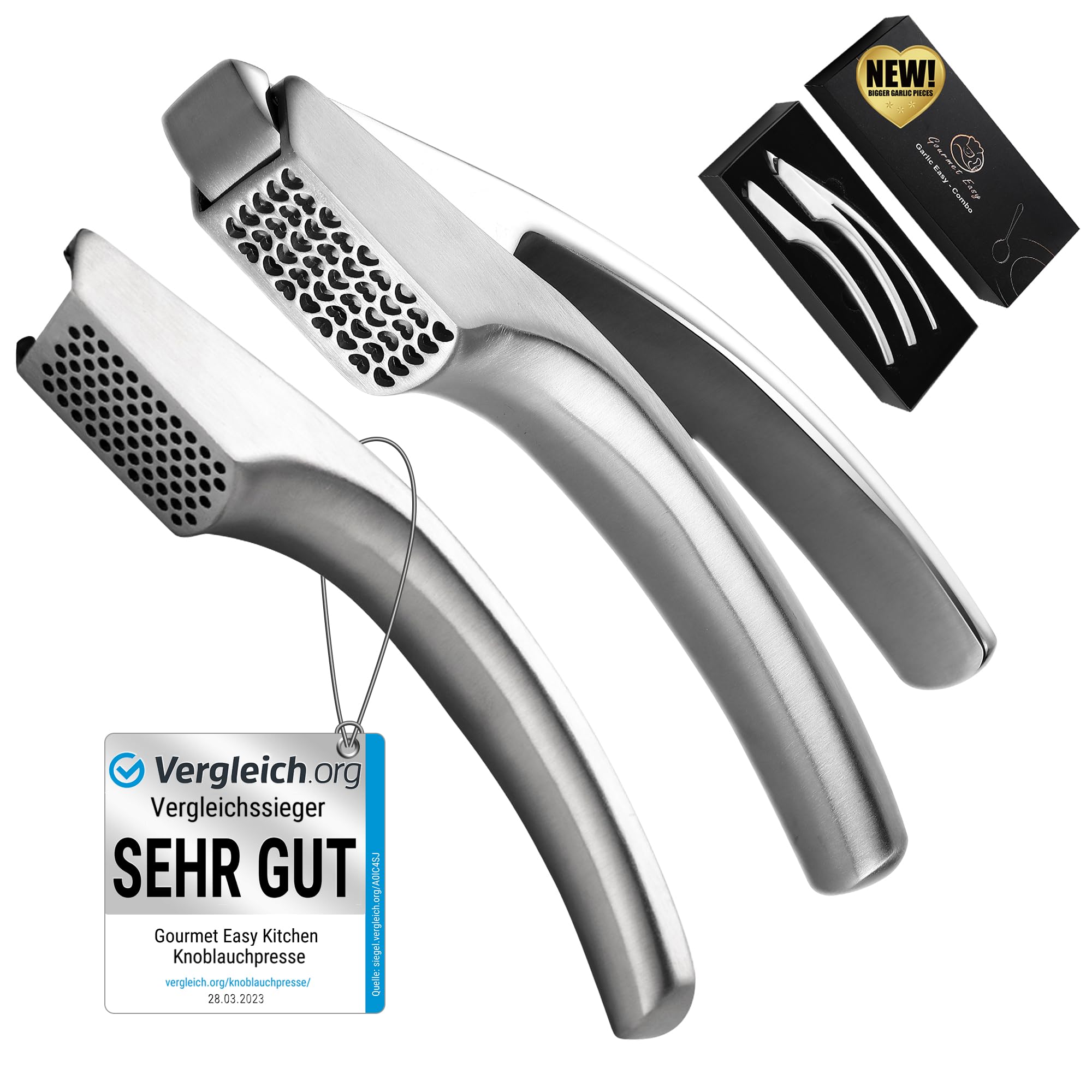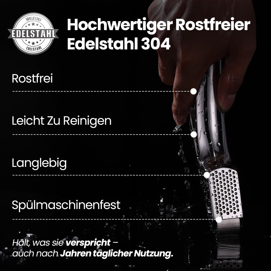 Knoblauchpresse Edelstahl Set mit 2 Aufsätzen | Knoblauch Presse für Knoblauchpaste & Stücke | Garlic Press für Knoblauch & Ingwer (kein Schälen notwendig) | Spülmaschinenfest 5 Jahren Garantie