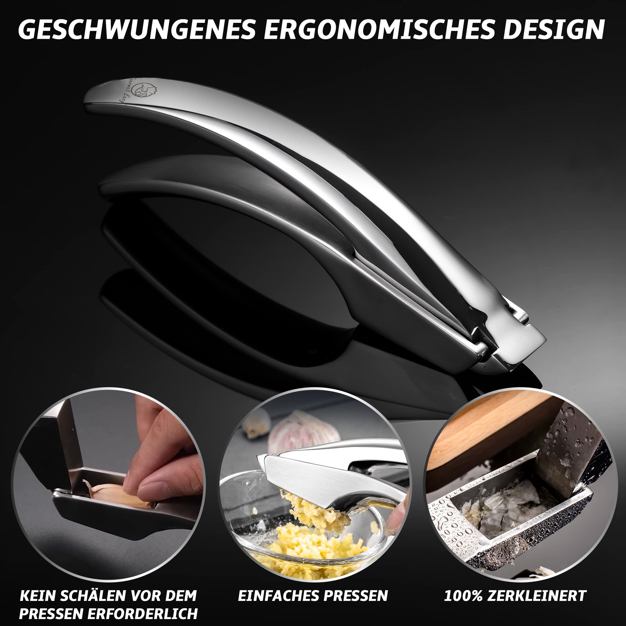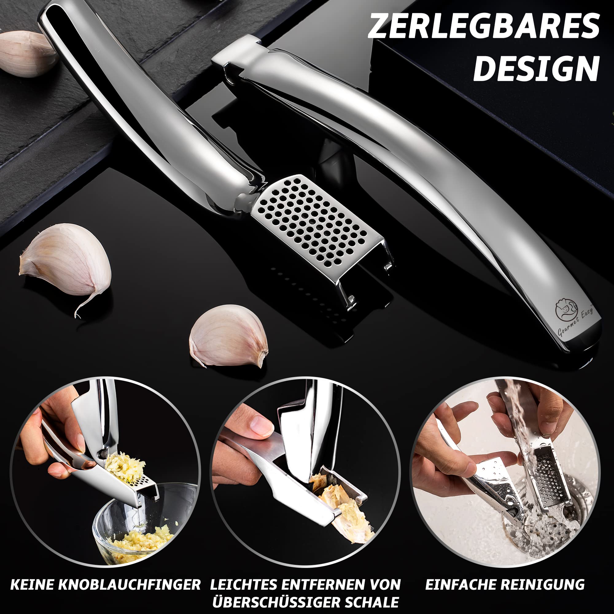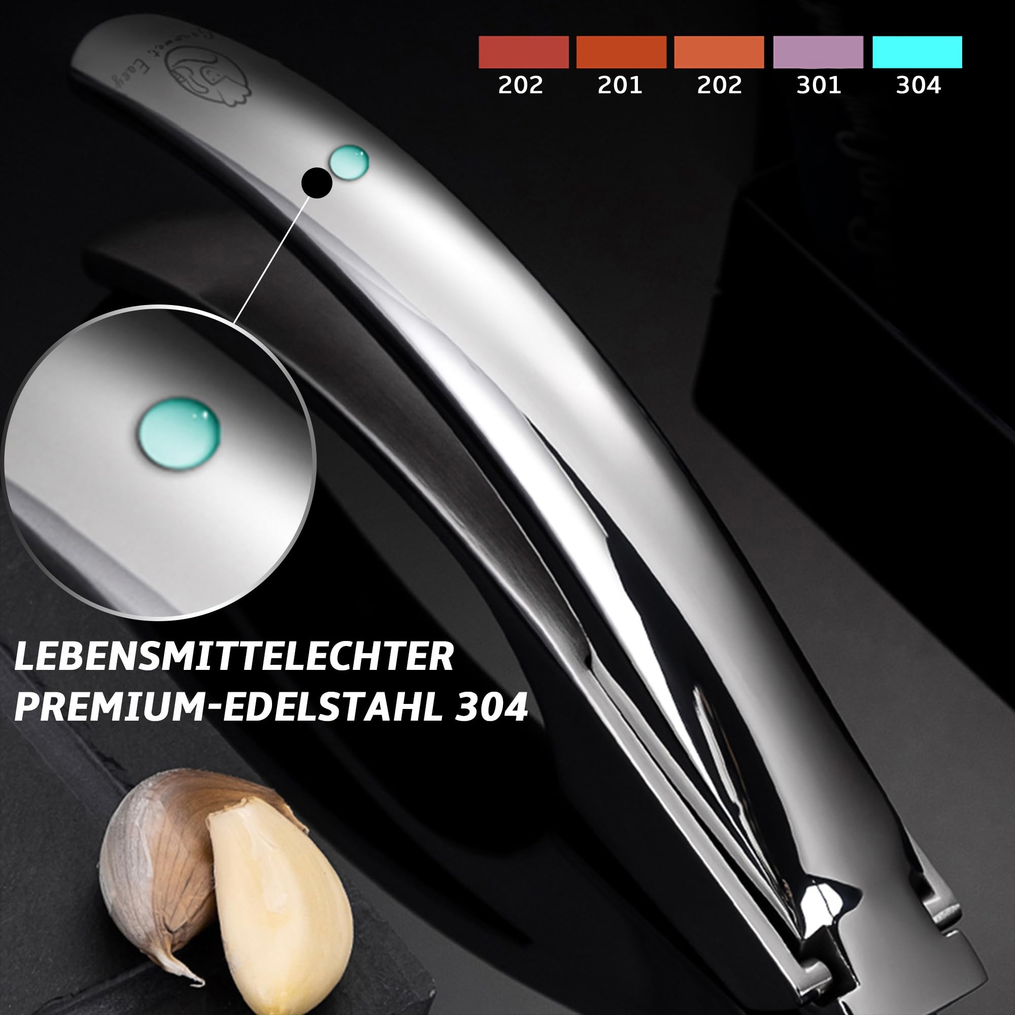 Knoblauchpresse Edelstahl für Knoblauch & Ingwer - kein Schälen nötig | Leicht zu reinigende Knoblauchpresse mit 5 Jahren Ersatzversprechen (für feines Knoblauchhack)