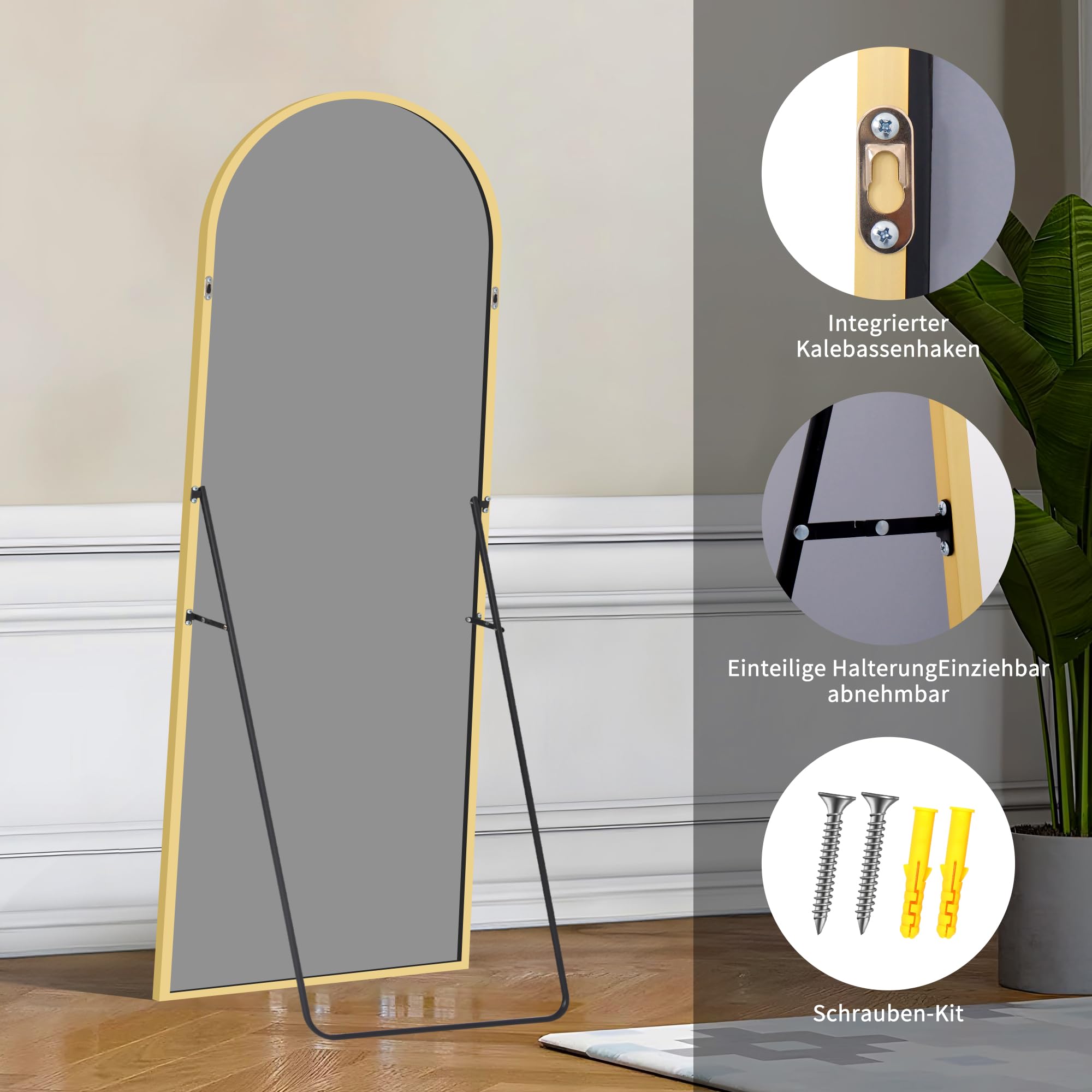 KOCUUY Bogen Standspiegel, 161 x 52 cm Grosser Gewölbter Ganzkörperspiegel, Gross Wandspiegel mit Gold Aluminium Rahmen, Hängend, Stehend, Kippbar, für Wohnzimmer, Schlafzimmer und Flure