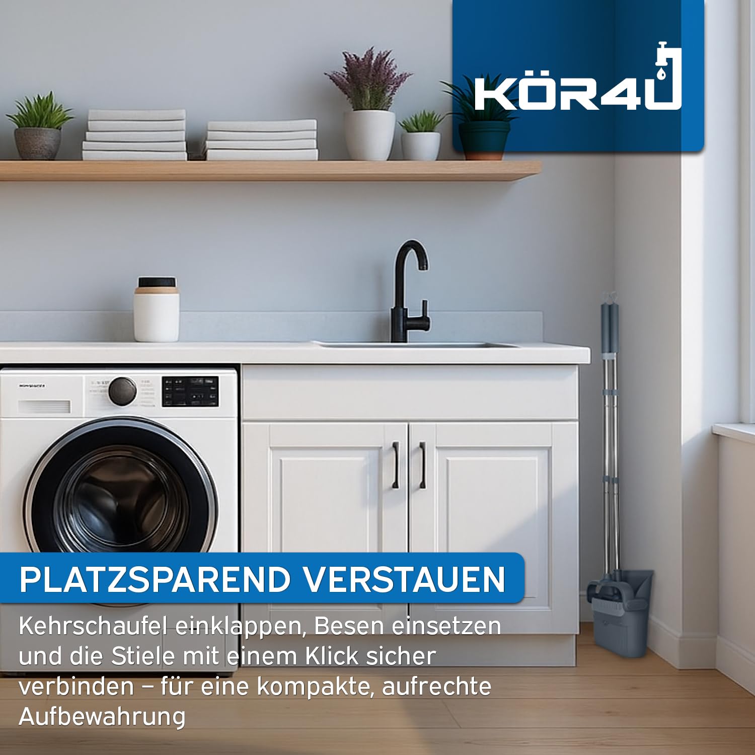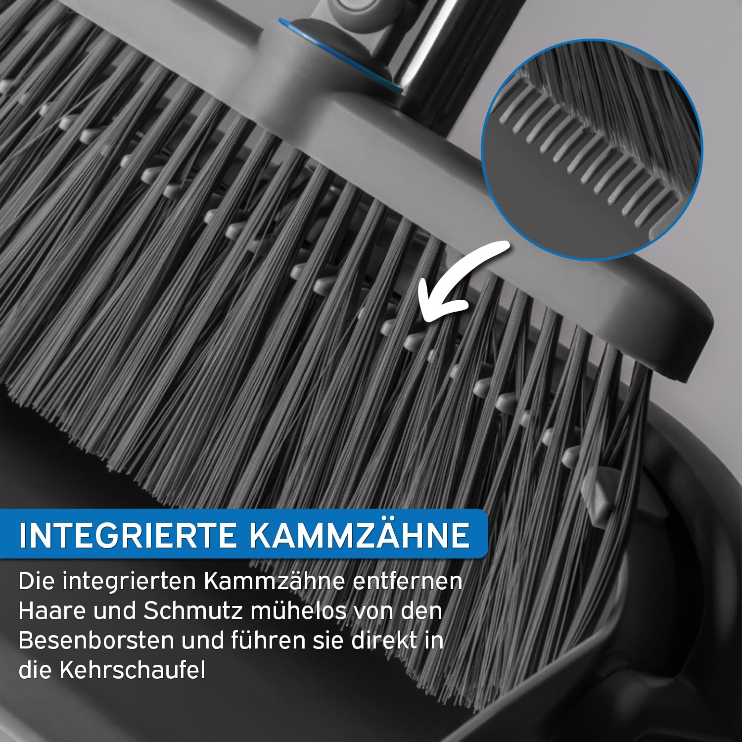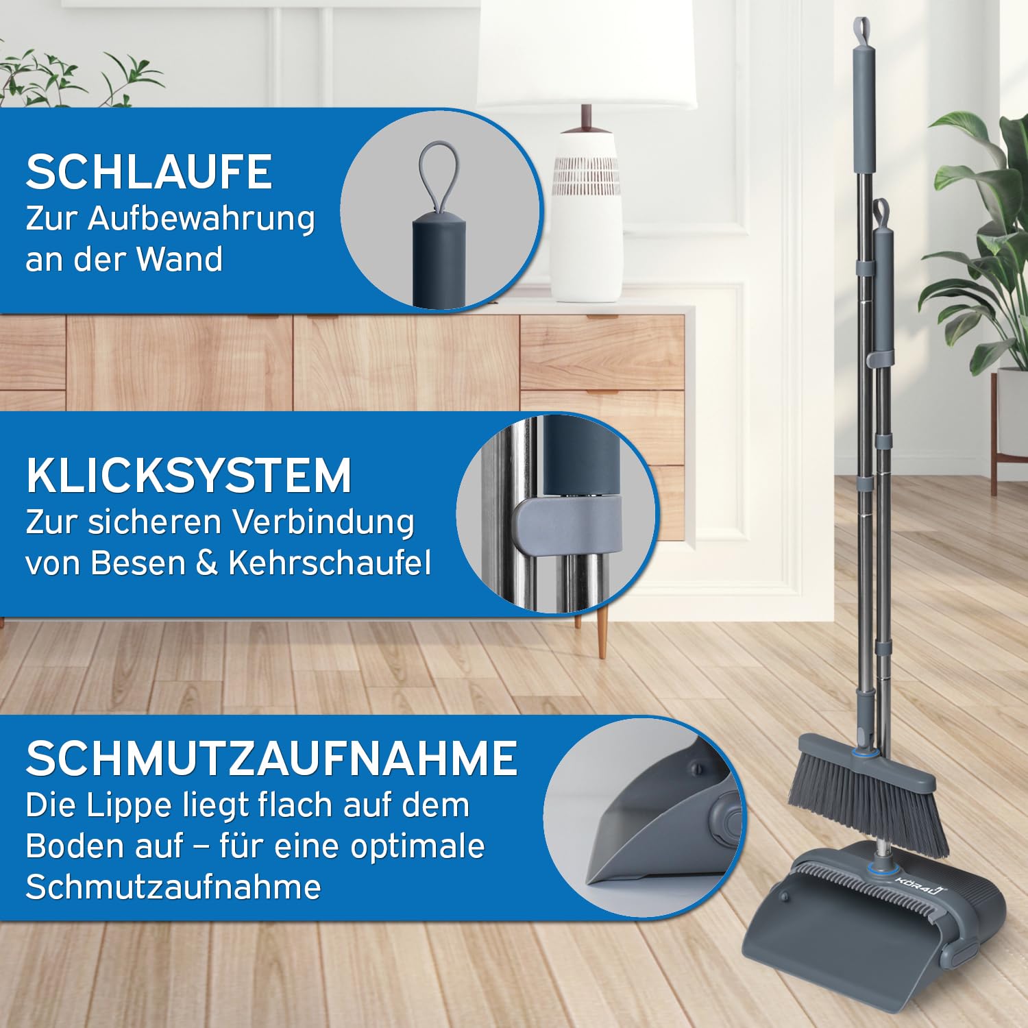 Das kör4u Besen- und Kehrschaufelset – Praktisch, ergonomisch und ideal für jedes Zuhause Erlebe müheloses Kehren und gründliche Sauberkeit mit dem kör4u Besen- und Kehrschaufelset. Mit seinem 180° drehbaren Besenkopf erreichst du problemlos Ecken, unter Möbeln und entlang von Kanten – ideal für eine schnelle und gründliche Reinigung auf allen Böden wie Fliesen, Parkett, Laminat und Teppich. Egal, ob du hartnäckigen Staub, Tierhaare oder Krümel beseitigen möchtest, dieses Set macht das Putzen einfach und effektiv. Integrierte Haarentfernung: Die spezielle Zackenstruktur an der Kehrschaufel entfernt Haare und Fusseln direkt vom Besen. Kein mühsames Ausziehen der Haare per Hand – besonders nützlich für Haushalte mit Haustieren. Das praktische Design sorgt für hygienisches Arbeiten, ohne unnötigen Aufwand. Ergonomisch und rückenschonend: Mit dem langen Stiel musst du dich beim Kehren nicht mehr bücken, was das Set besonders rückenfreundlich macht. Ideal für Menschen mit Rückenproblemen oder Senioren, die eine bequeme, aufrechte Haltung beim Putzen bevorzugen. Platzsparend und praktisch: Das Set lässt sich nach Gebrauch platzsparend verstauen. Es passt problemlos in enge Nischen, Abstellräume oder hinter Türen – perfekt für kleine Wohnungen oder Haushalte mit wenig Stauraum. Durch das leichte Gewicht und das kompakte Design ist es auch ideal für unterwegs, zum Beispiel im Camper oder im Urlaub. Vielseitig einsetzbar: Dank der robusten Borsten ist das Set ideal für die Aufnahme von Tierhaaren, Staub und Krümeln auf allen Bodenarten. Es sorgt für eine schnelle und gründliche Reinigung – perfekt für Haushalte mit Haustieren oder in stark frequentierten Bereichen. Langlebig und pflegeleicht: Das Besen- und Kehrschaufelset ist aus hochwertigen, robusten Materialien gefertigt, die für eine lange Lebensdauer sorgen. Es ist leicht zu reinigen und so gebaut, dass es auch bei häufiger Nutzung seine Leistung beibehält. Mit dem kör4u Besen- und Kehrschaufelset wird deine tägliche Reinigung einfacher und effizienter – ideal für jeden Haushalt!
