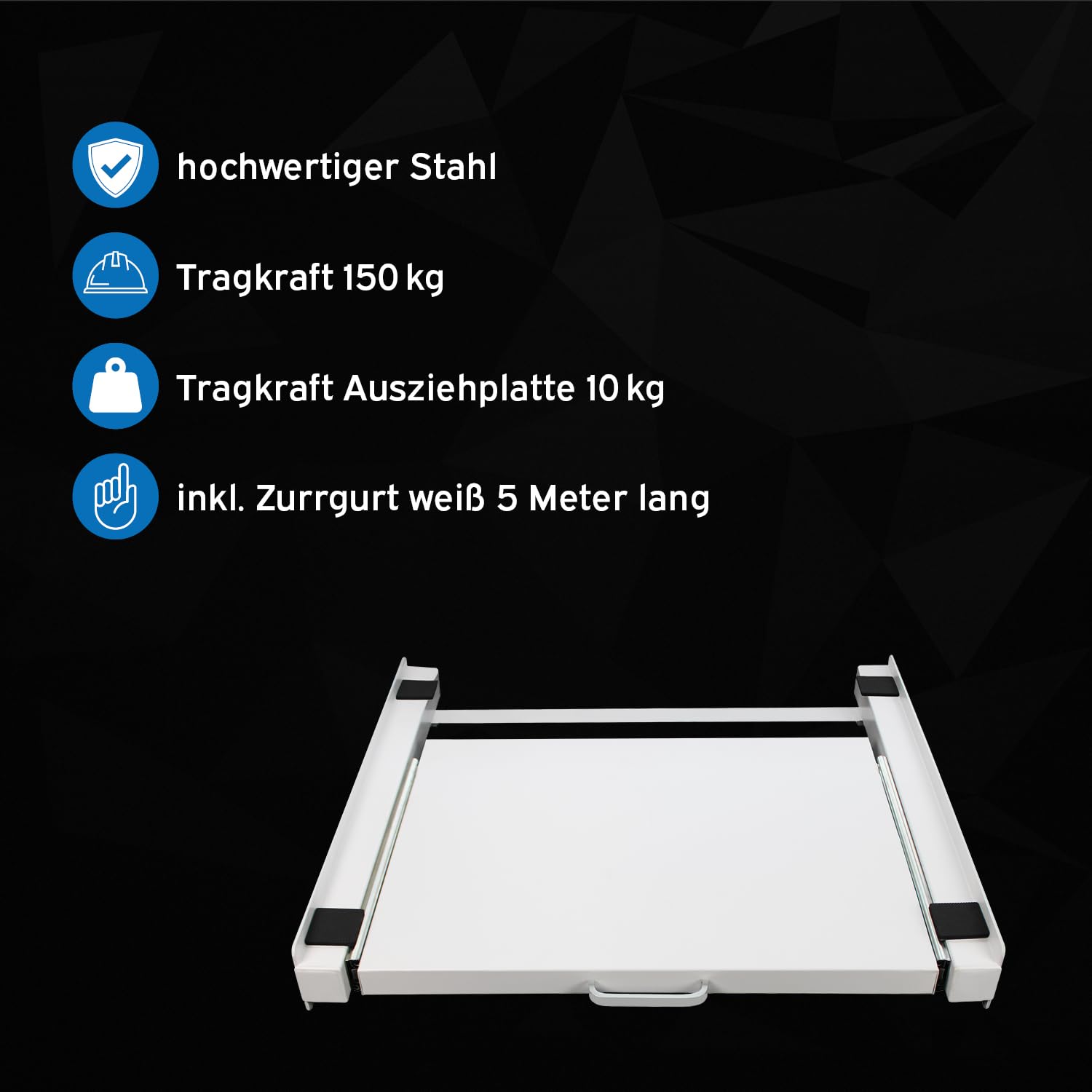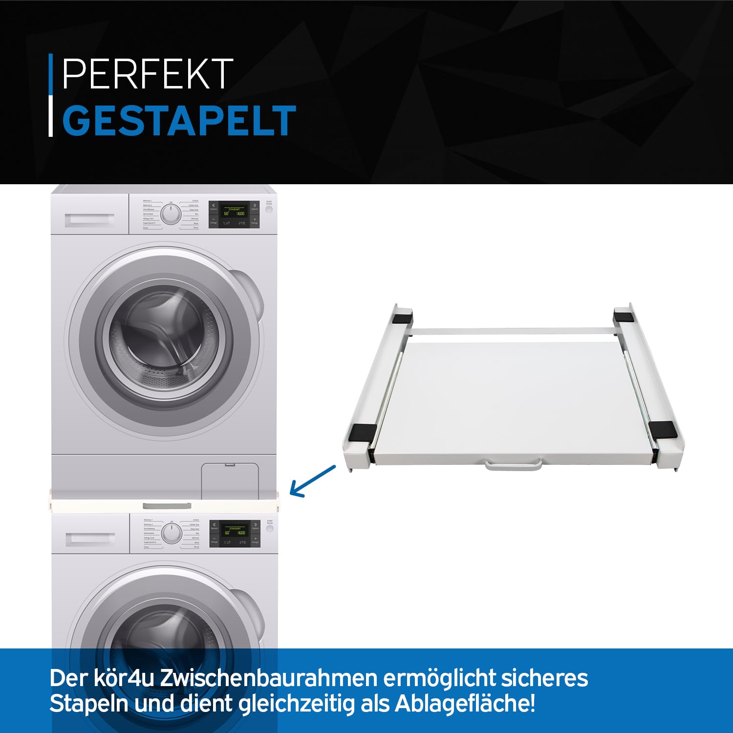 Eine der herausragenden Eigenschaften unseres Zwischenbaurahmens ist die integrierte ausziehbare Plattform. Diese Plattform macht das Be- und Entladen Ihrer Geräte zum Kinderspiel und unterstützt bis zu 10 kg Gewicht. Dadurch wird nicht nur das Be- und Entladen erleichtert, sondern auch die Organisation Ihrer Wäscheroutine erheblich verbessert.