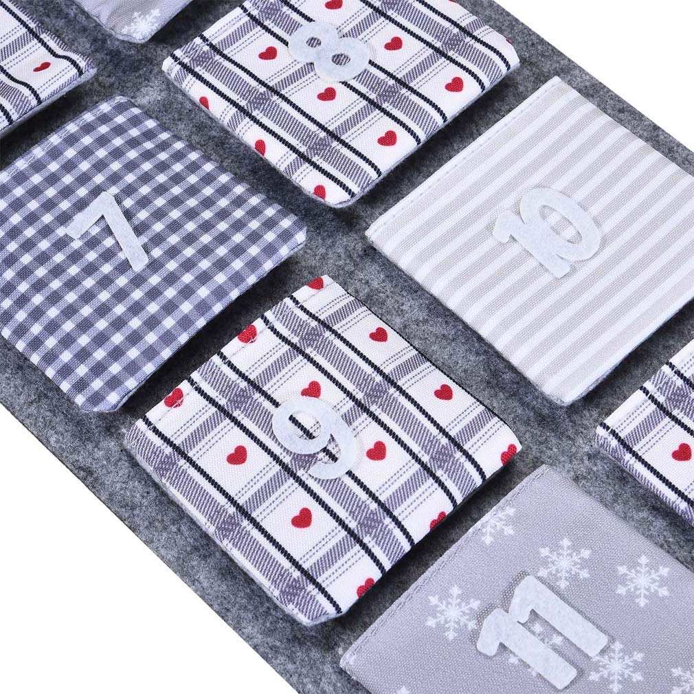 • Die 24 Türen des Advents kalenders bestehen aus gemusterten Stoff in grau weiss beige. 24 stück Säckchen säcke kette set sind in zwei Spalten auf einem gross grauem Filzstoff angeordnet und mit weissen Zahlen nummeriert.Dekorativer advents calenders sachen zum selber befüllen