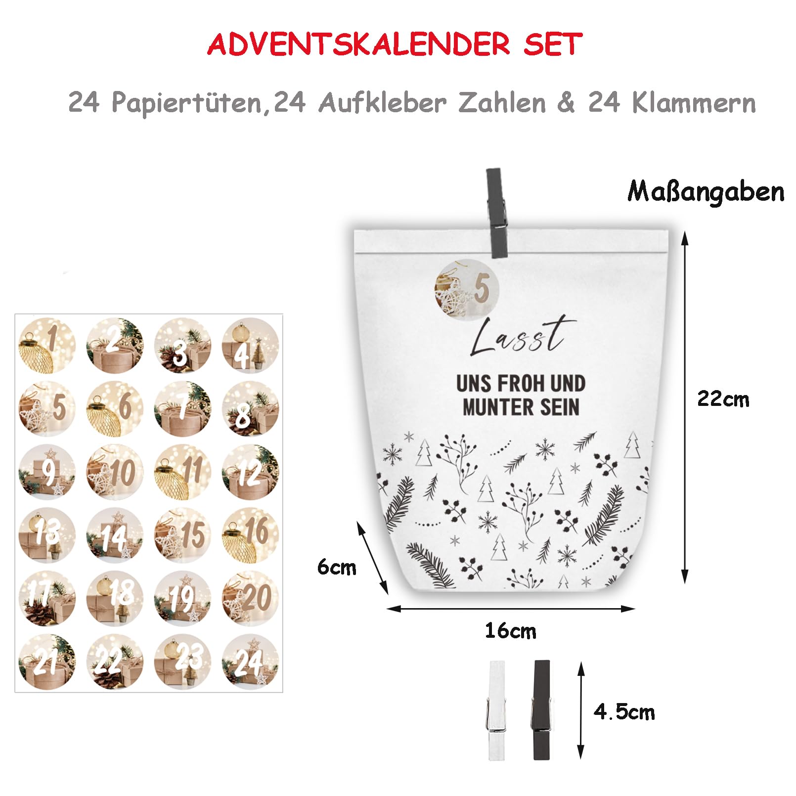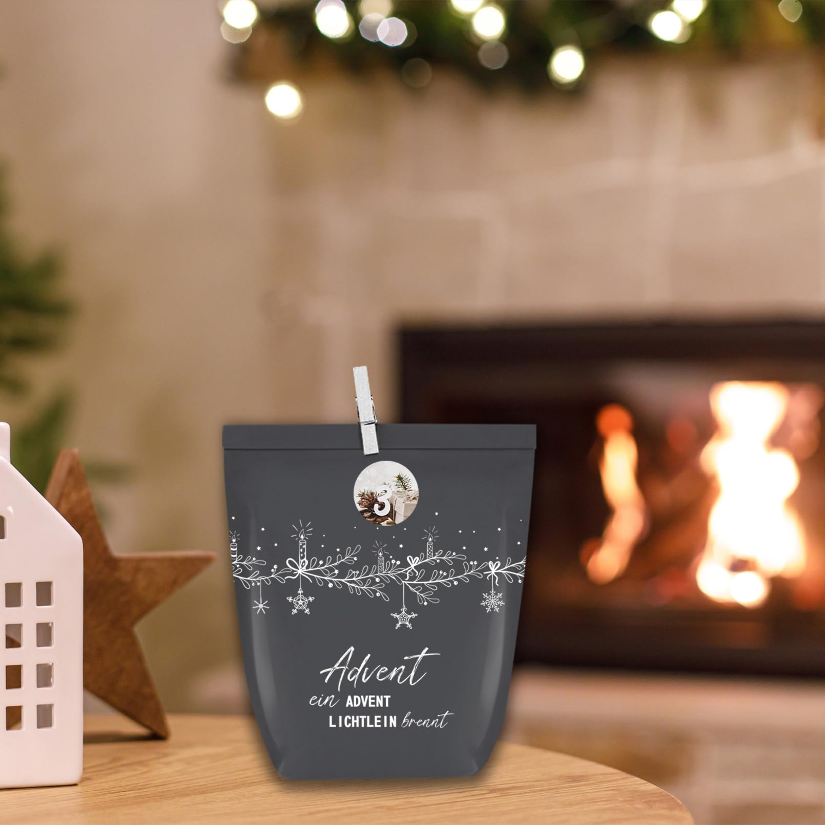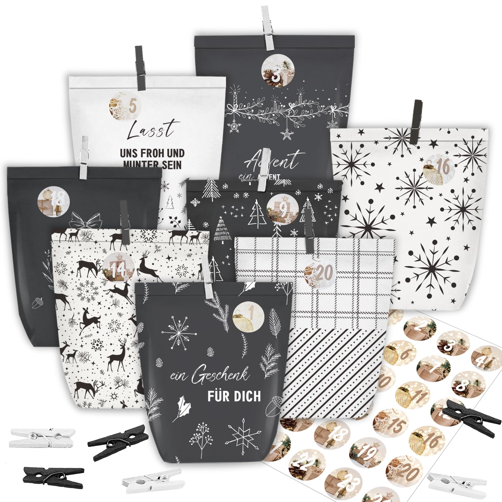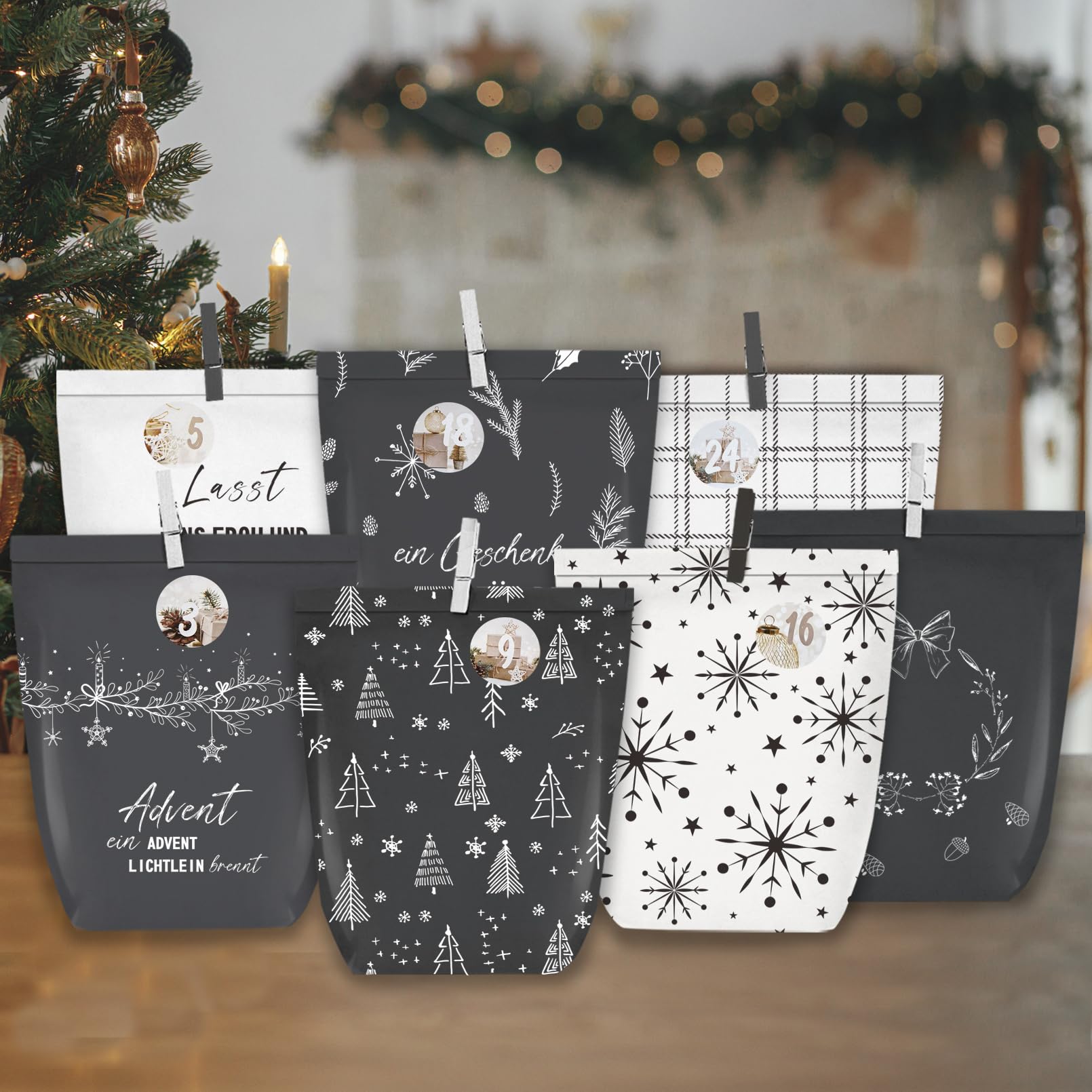 KOHMUI Adventskalender zum Befüllen, 24 Weihnachtskalender Papiertüten zum Selbst Gestalten, Geschenktüten zum Selber Basteln, Elegantem Schwarz und Weiss