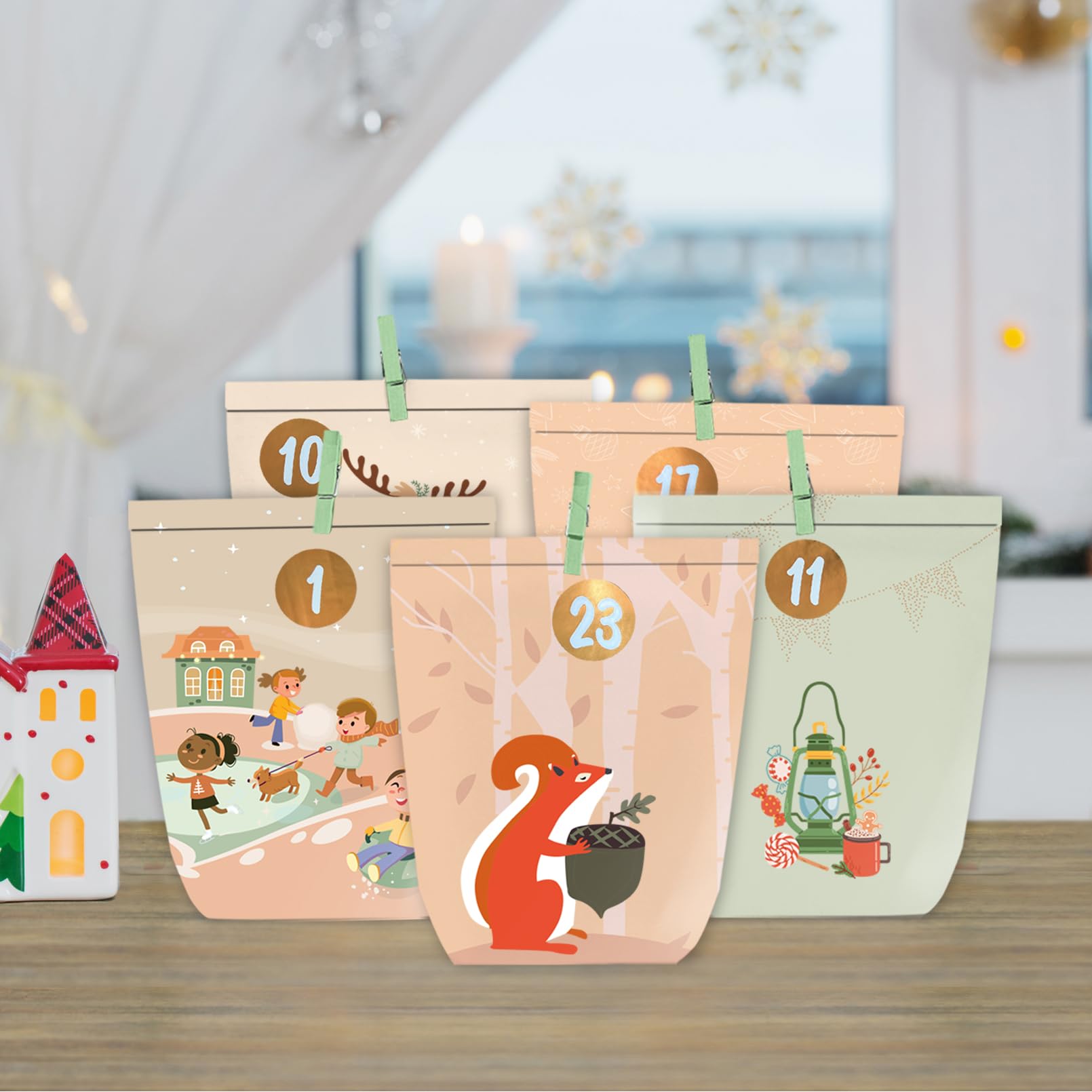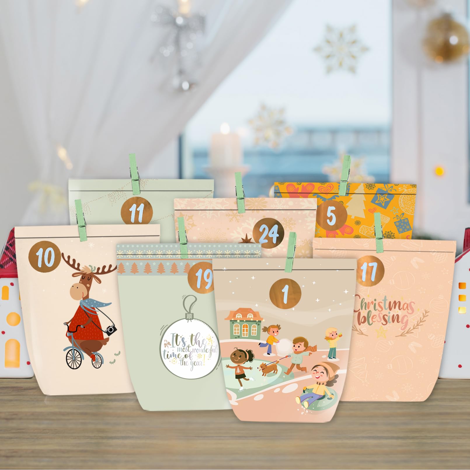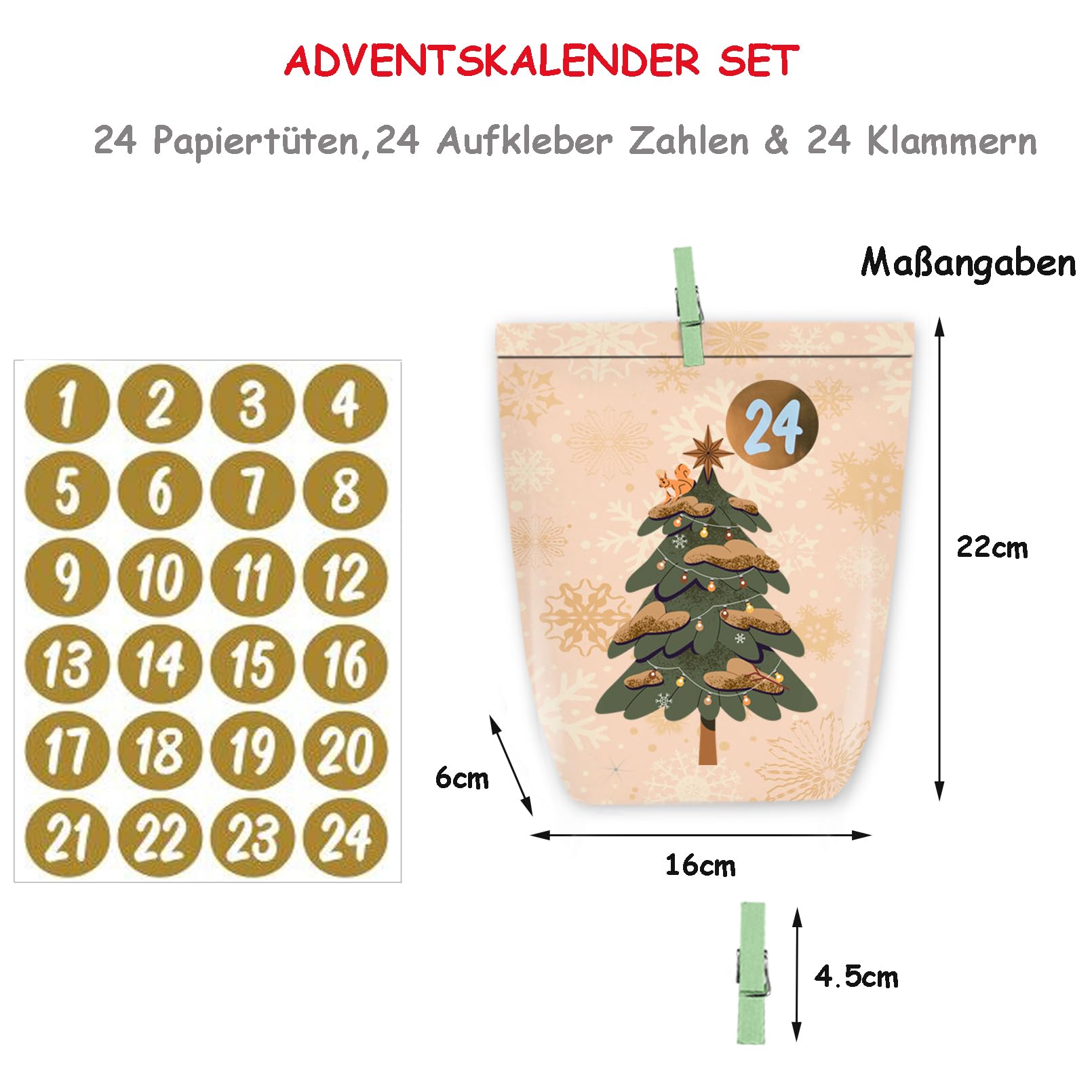 KOHMUI Adventskalender zum Befüllen, 24 Weihnachtskalender Papiertüten zum Selbstbefüllen, Adventstüten mit Zahlen Aufkleber zum Selber Basteln