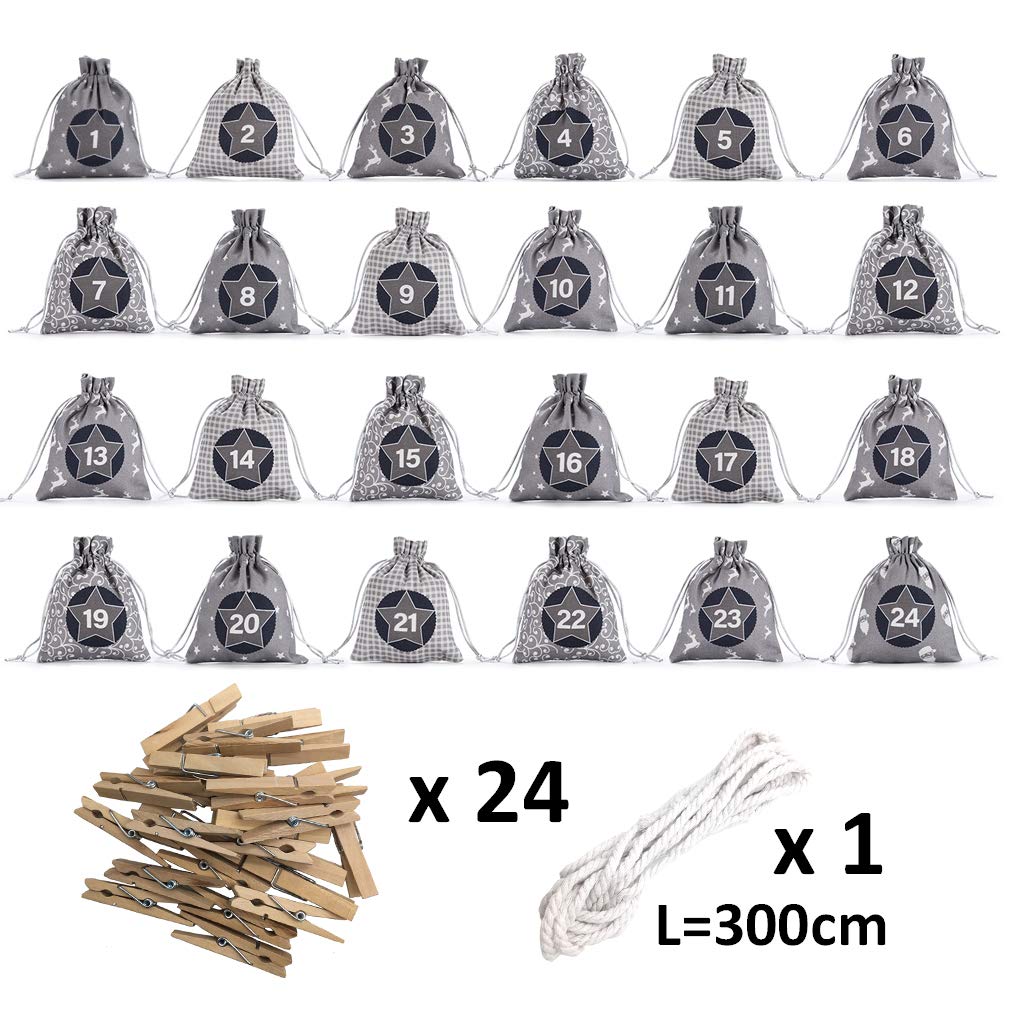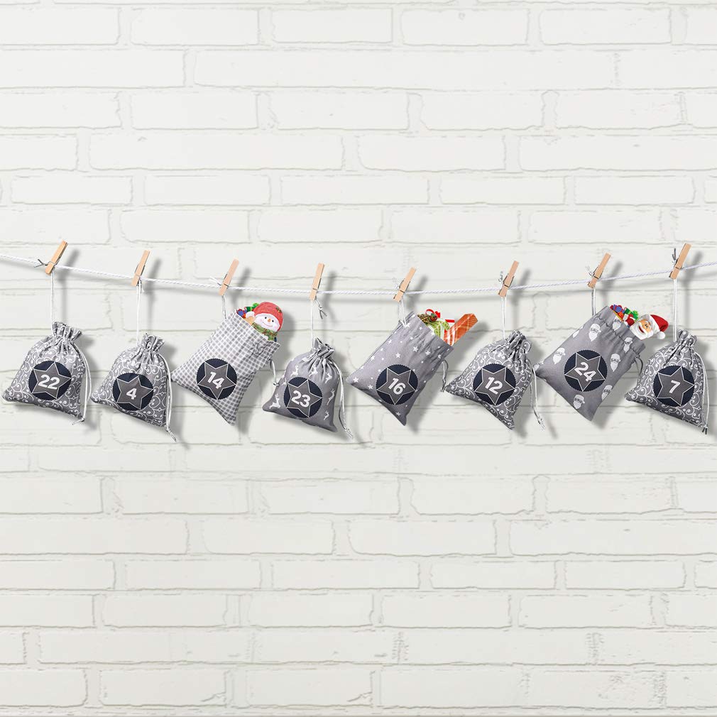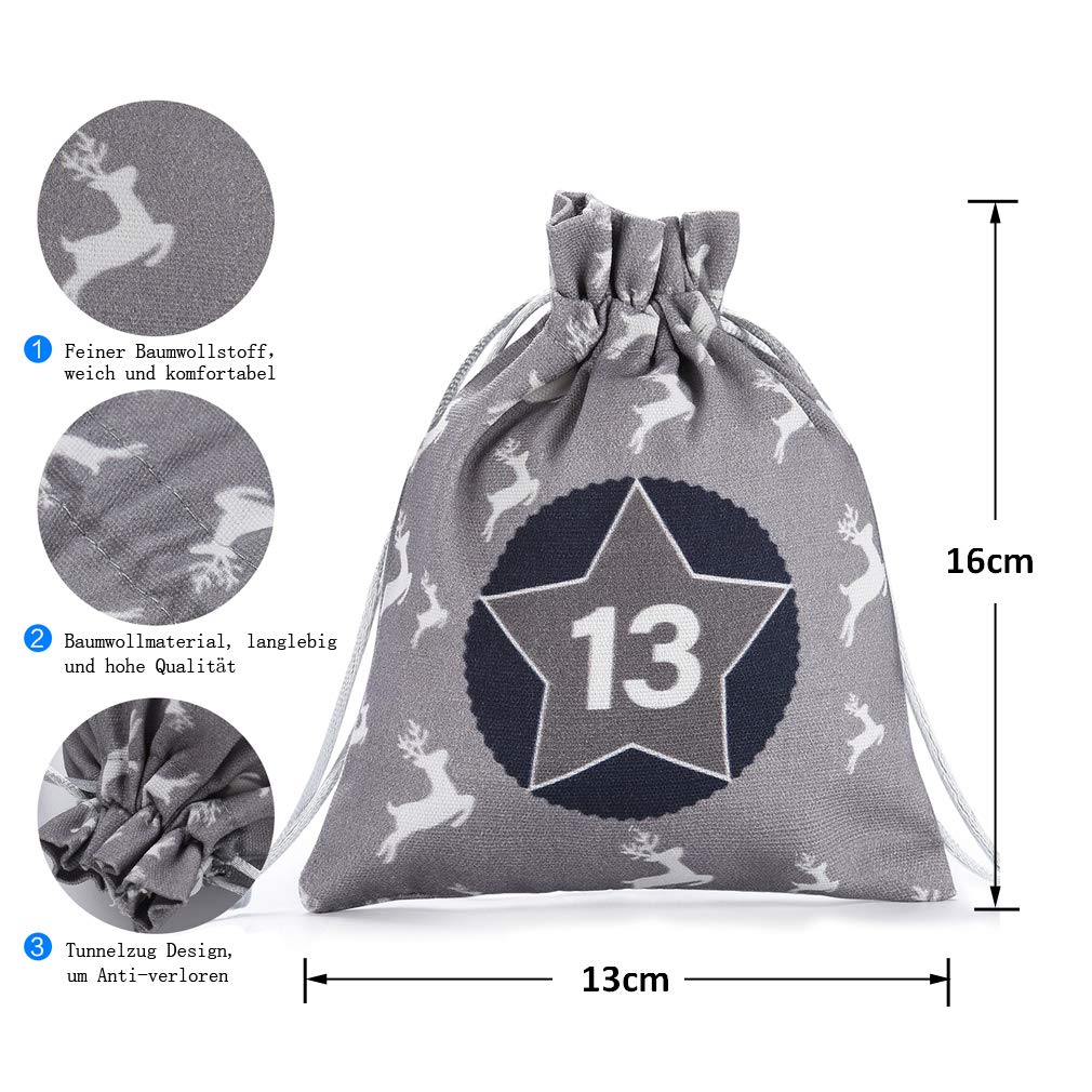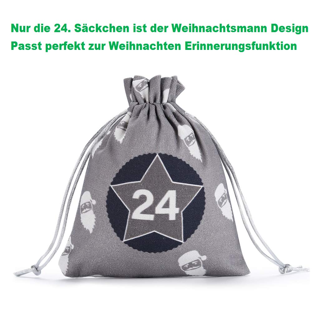 KOHMUI Adventskalender zum Befüllen, Weihnachtskalender Selbstbefüllen Aufhängen, 24 Grau Stoffsäckchen Selbst Befüllen Bastelset, Weihnachten Geschenksäckchen, Hochwertige Geschenktüte aus Baumwolle