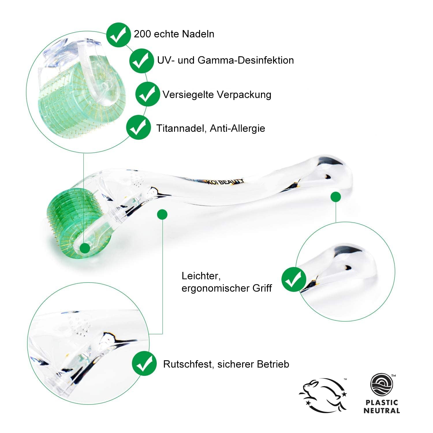 KOI BEAUTY Derma Roller 0,5 mm – 200 echte Nadeln, Microneedling fuer Hautpflege, Bartwuchs & Kopfhaut, fuer Zuhause