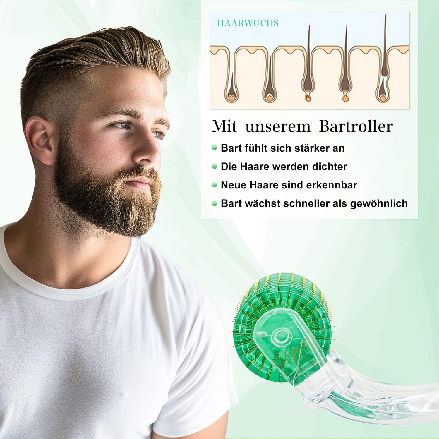 Die 0,5 mm Nadellaenge ist optimal fuer oberflaechliches Microneedling, bei dem die Durchblutung angeregt und die Kollagenproduktion aktiviert wird. Gleichzeitig entstehen mikrofeine Kanaele, die die Wirkstoffaufnahme von Seren, Haarwuchsprodukten und Pflegeoelen deutlich verbessern. Dadurch kann der Bartwuchs gezielt unterstuetzt und die Kopfhautgesundheit verbessert werden.