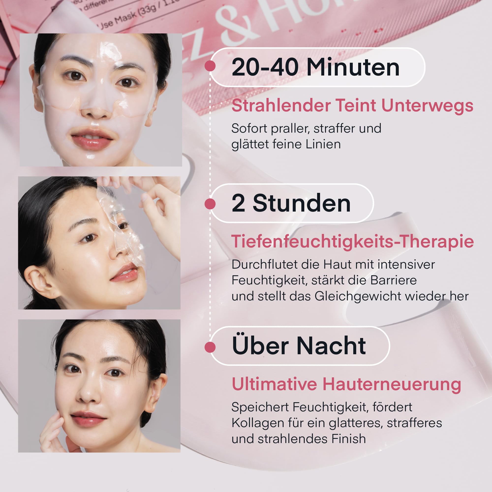 Kollagen traegt dazu bei, die Hautelastizitaet zu unterstuetzen und feine Linien optisch zu mildern, waehrend Hyalurontief in der Haut Feuchtigkeit bindet und fuer ein pralles, geschmeidiges Hautgefuehl sorgt. Die Maske legt sich angenehm auf die Haut und gibt die Wirkstoffe kontinuierlich ab, sodass die Haut ueber Nacht intensiv gepflegt wird.