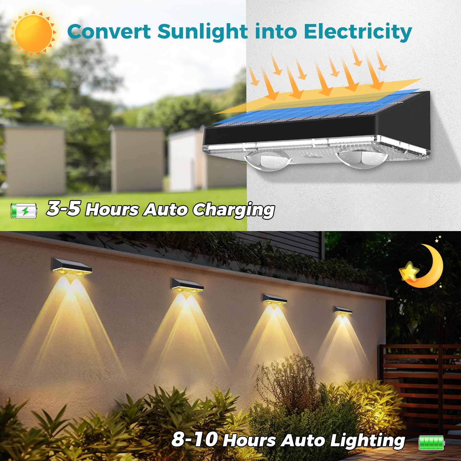 - 【Ultra helle linsefokussierte LEDs】Jede solarbetriebene Zaunleuchte für den Aussenbereich ist mit zwei linsenfokussierten LEDs ausgestattet, die das Prinzip der konvexen Linse verwenden, um die Lichtverteilung zu verstärken und so eine hellere, fokussierte Beleuchtung zu gewährleisten. Hochwertiges monokristallines Silizium wandelt Sonnenlicht in Strom um, keine Verschwendung von Strom, ressourcenschonendes Produkt
