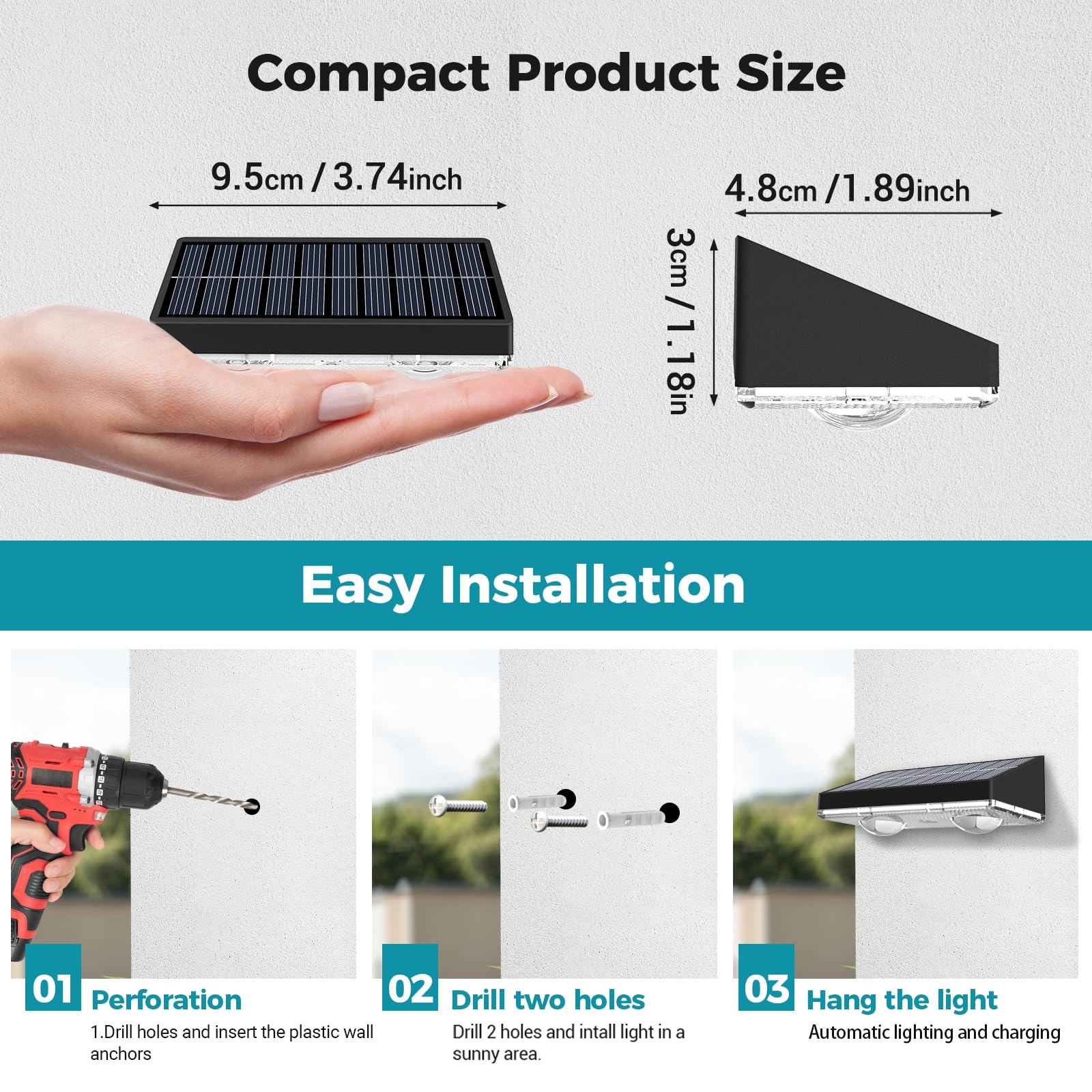 - 【Effiziente und langlebige Beleuchtung】Solar-Aussenleuchte kann bis zu 10 Stunden nach vollständiger Aufladung im Sonnenlicht dauern. Diese Aussenzaun-Solarleuchte verwendet monokristalline Silizium-Solarmodule, misst nur 9,5 x 4.8 cm,geneigtes Design, um die Sonnenlichtabsorption zu maximieren, photovoltaische Umwandlungseffizienz von bis zu 20%; spart Energie von der Dämmerung bis zur Morgendämmerung; die LED-Linse hat eine Lebensdauer von mehr als 40.000 Stunden