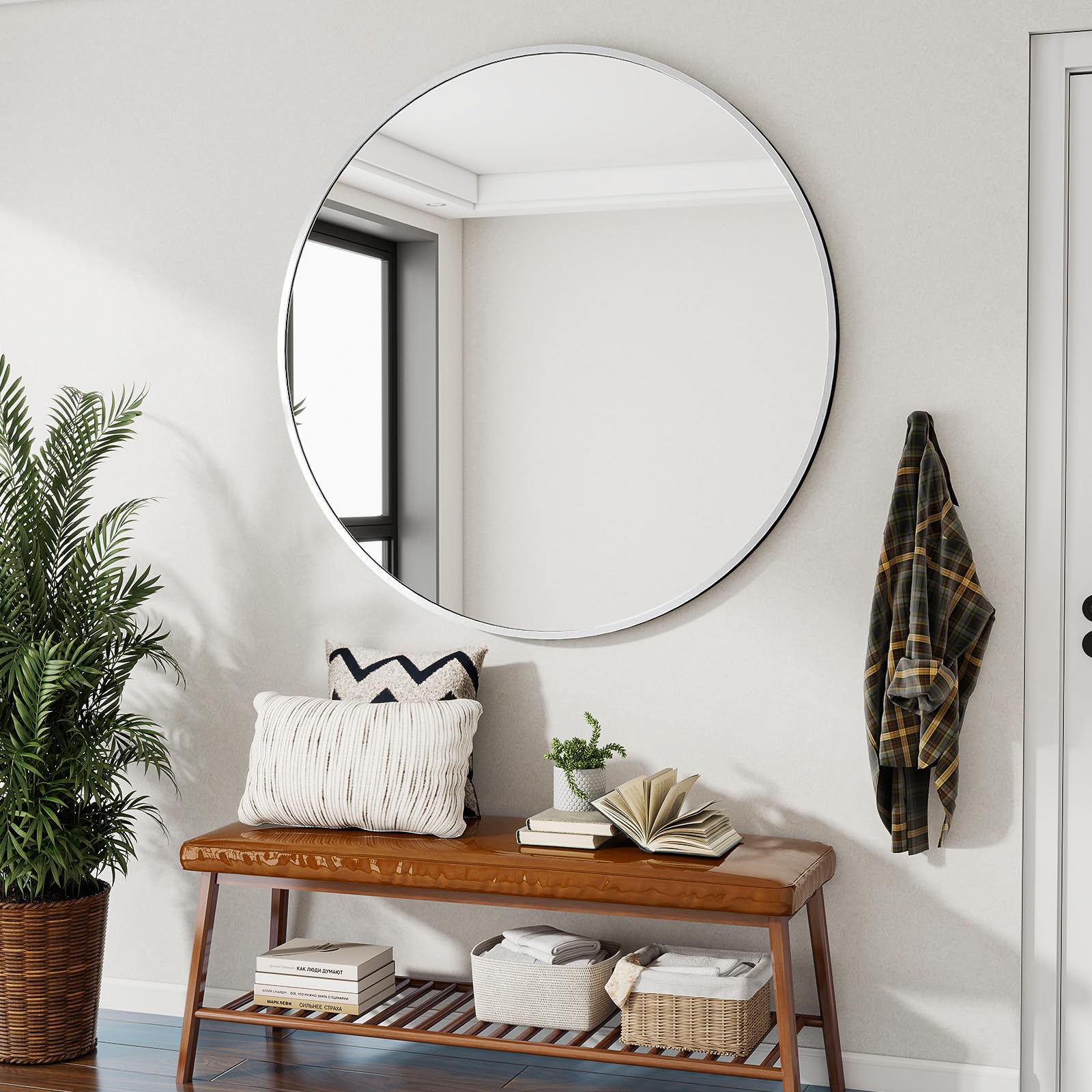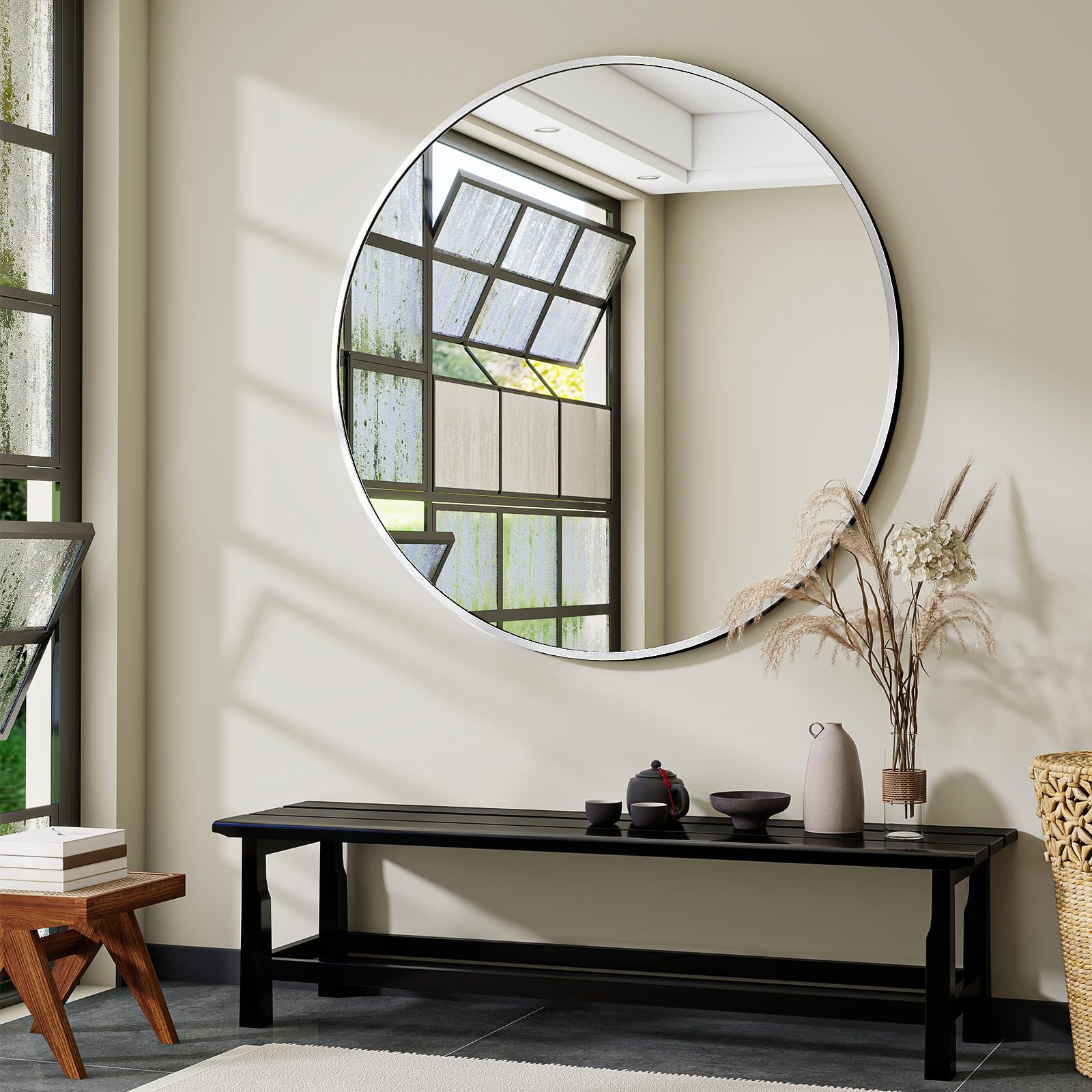 Koonmi 106 cm Spiegel Rund Silber, grosser Runder Spiegel Wandspiegel mit Rahmen aus Aluminiumlegierung für Badezimmer, Waschtisch, Wohnzimmer, Schlafzimmer, Eingangsbereich Wanddekoration
