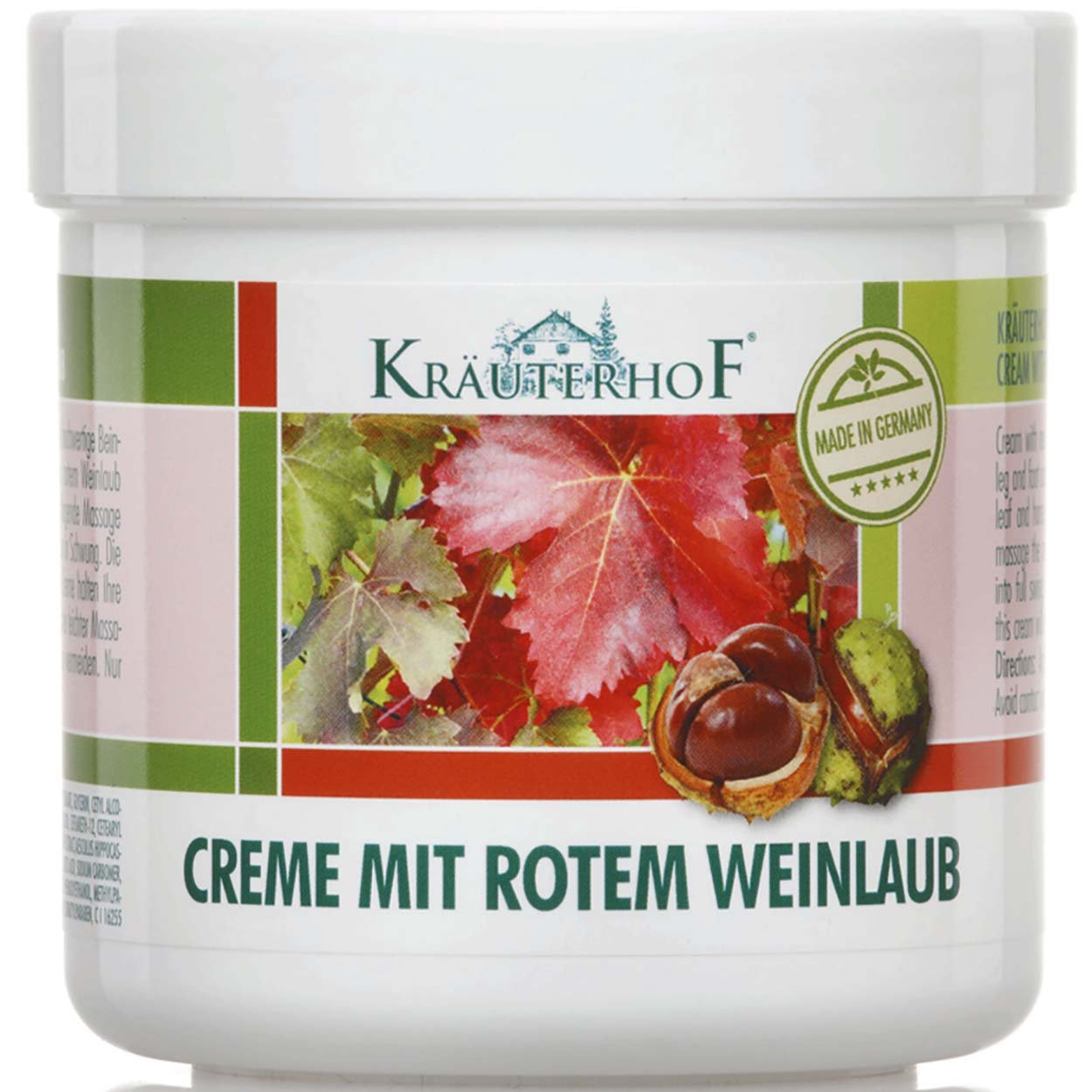 Die Kräuterhof Creme mit rotem Weinlaub ist eine hochwertige Bein- und Fusscreme, die mit Extrakten aus rotem Weinlaub, Rosskastanie und Panthenol angereichert ist. Diese spezielle Kombination pflegt und regeneriert beanspruchte Beine und Füsse und unterstützt die Pflege der Venen von aussen. Die Creme hat wohltuende Eigenschaften, die die Haut vitalisieren und für eine angenehme Frische sorgen.