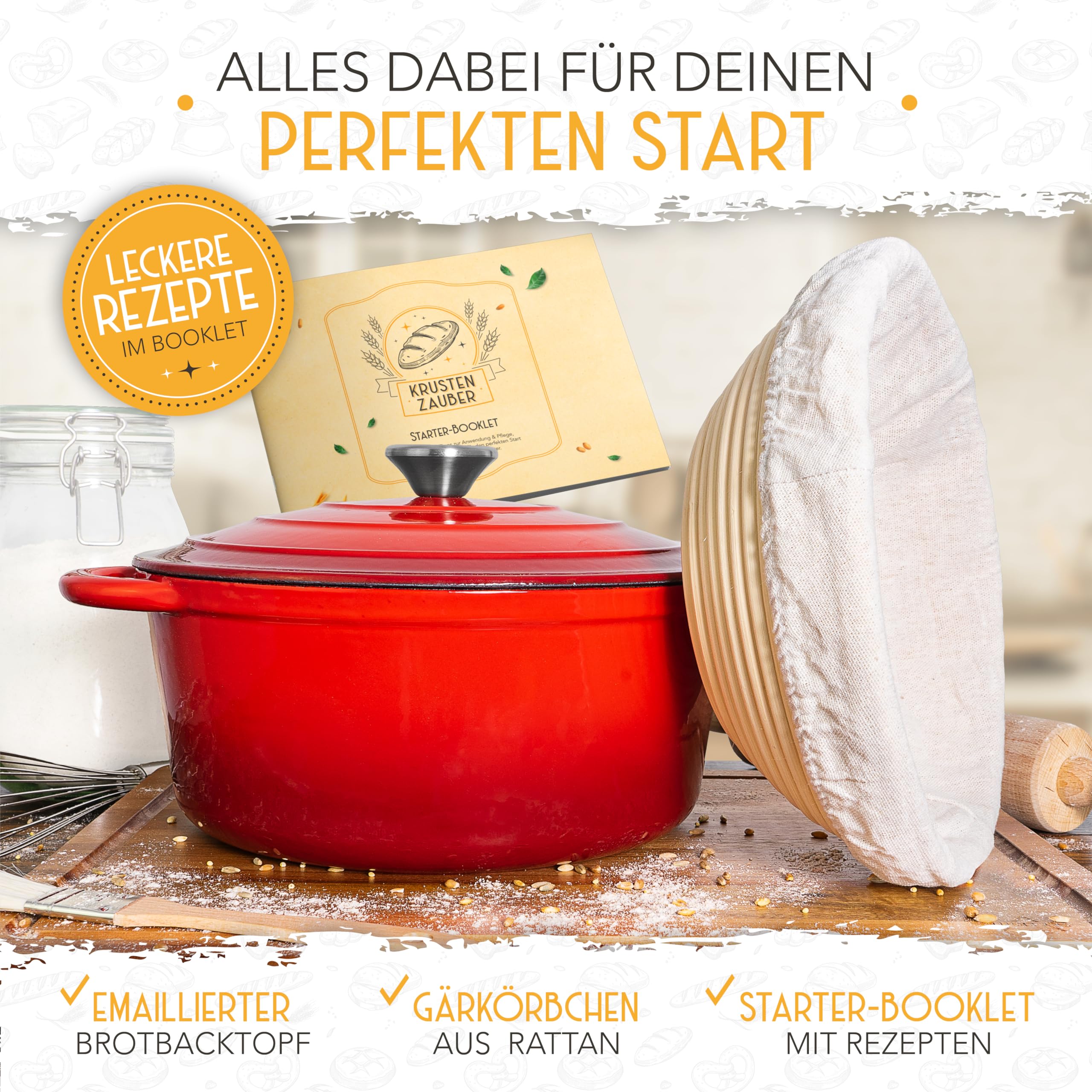 KRUSTENZAUBER Gusseisen Topf [inkl. Gärkorb] - Hochwertiger Emaille Topf 26cm - Idealer gusseiserner Brottopf zum Backen, Gusseisentopf Brotbacken, Brot Backen Zubehör