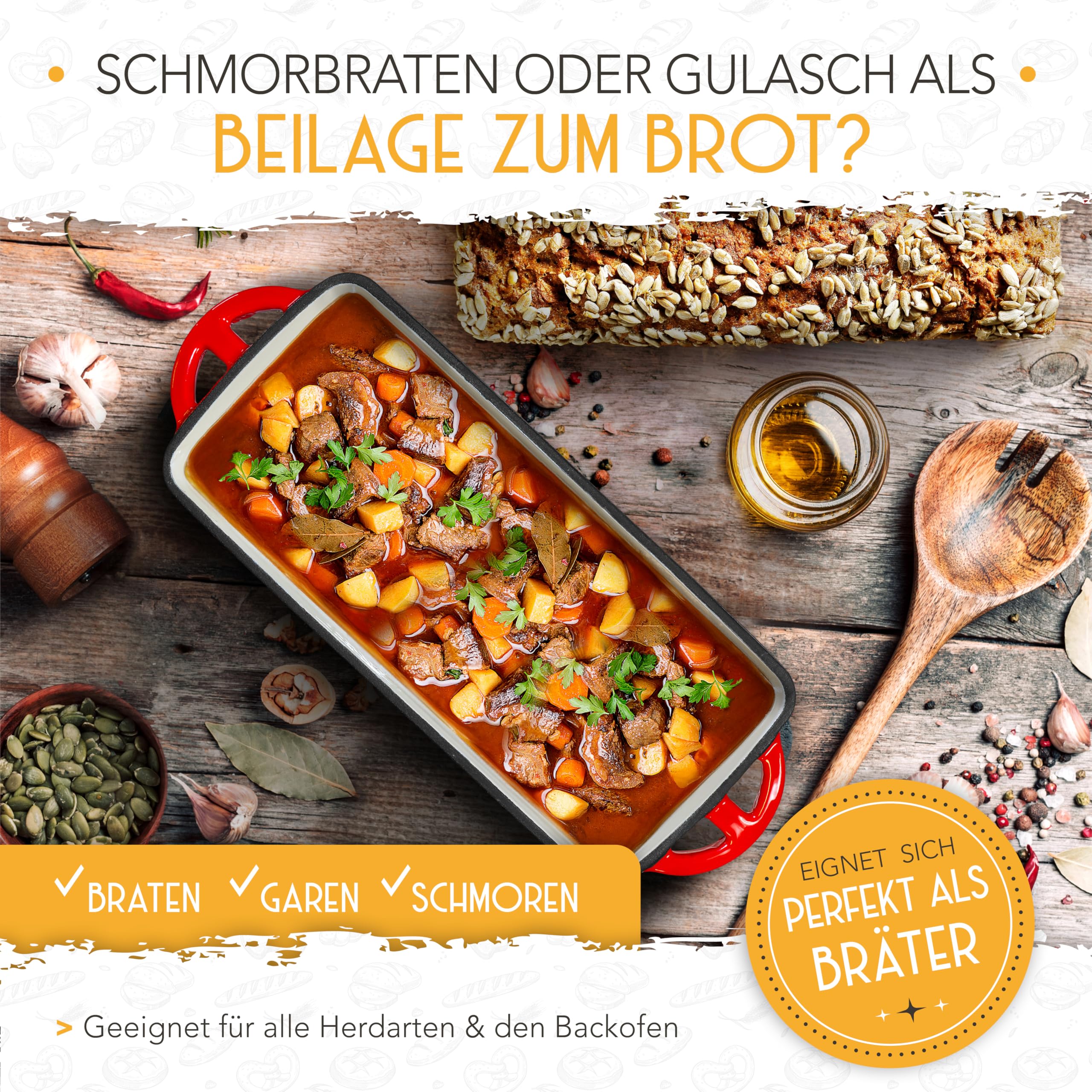 KRUSTENZAUBER Emaille Brotbackfrom mit Deckel inkl. Gärkorb - Robuste 28cm Backform aus Gusseisen - Ideal als Kastenform, Toastbrot Backform, Brotform, Gusseisen Topf Brot backen Zubehör, Brottopf